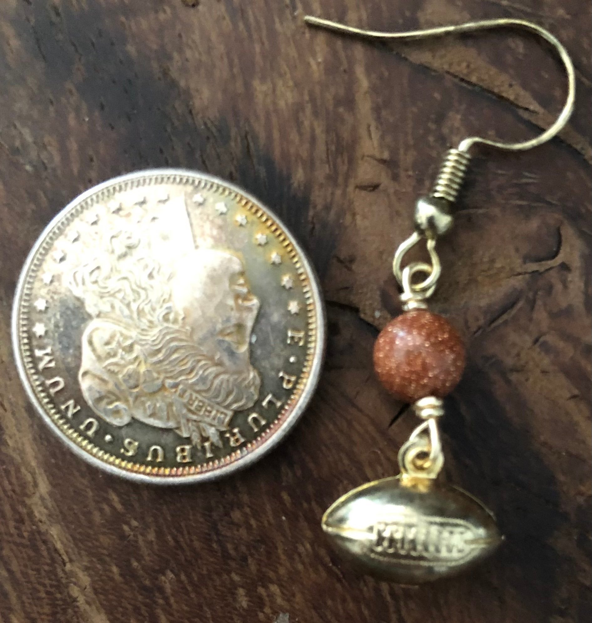 Some time ago I got a little bag of vintage autumn themed charms and two of them were tiny gold colored footballs. I decided to use goldstone beads since it is brown colored but pretty to help make the football charms look cute.