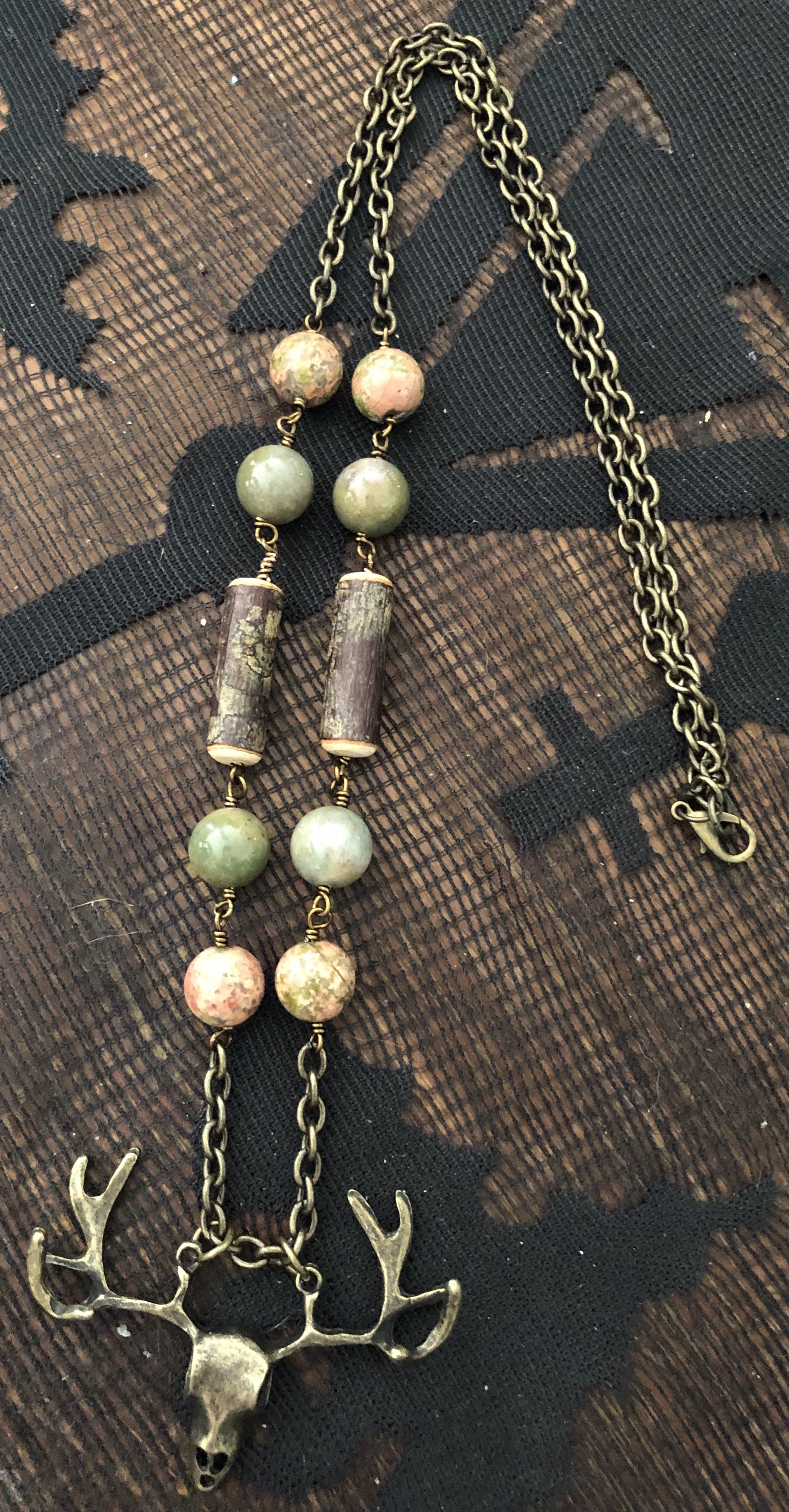 Brass colored deer skull pendant on a brass chain held together by wire wrapped round Unakite beads, long wooden beads, and murky green stone beads.