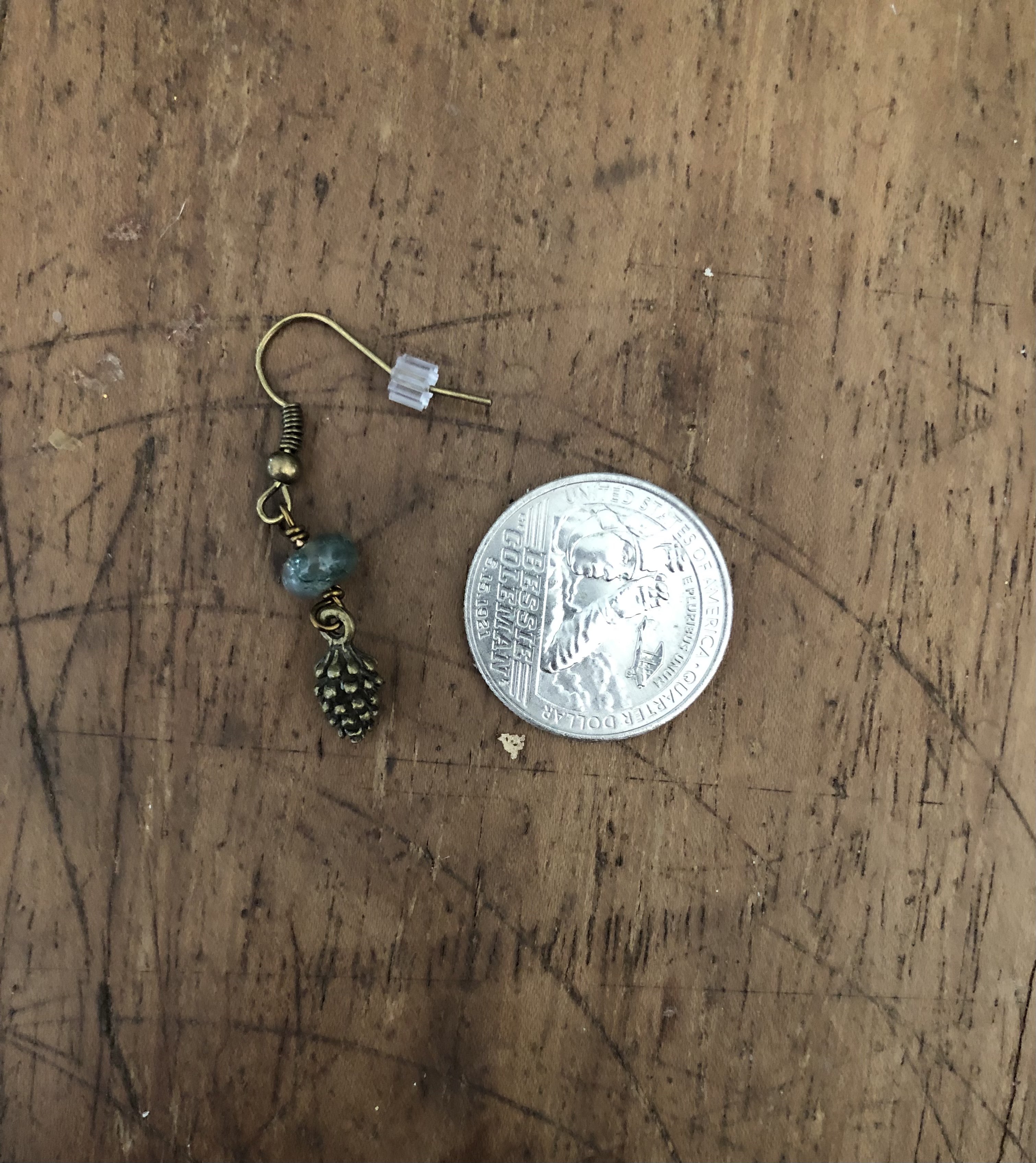 These earrings have small brass pine cone charms wire wrapped to moss agate disc beads. Small, cute, and simple in design they are perfect to wear during the autumn season!