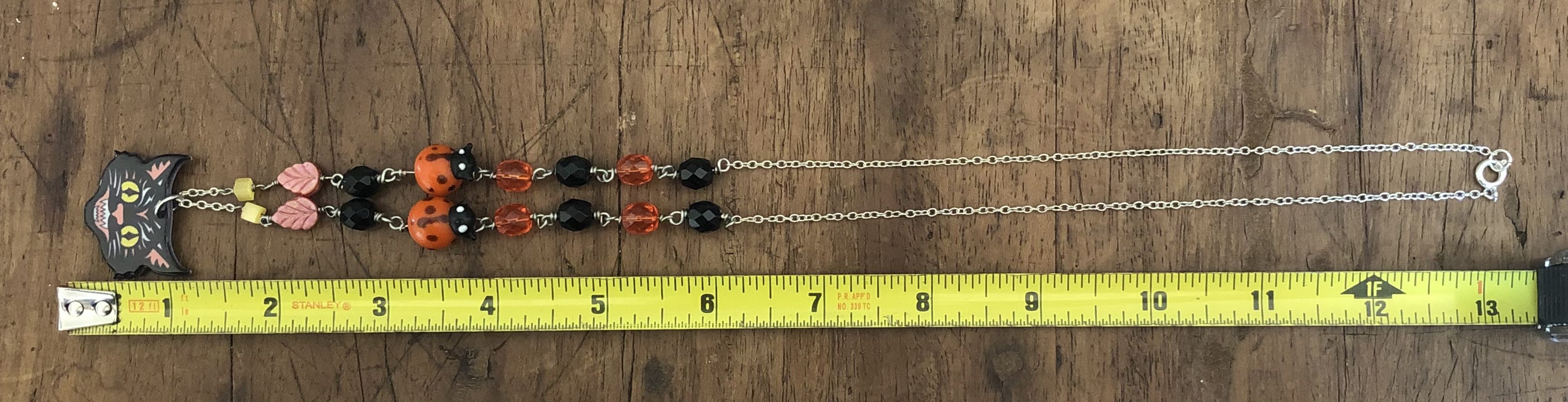 This necklace is themed around this black cat face pendant I got some time ago. The style of the pendant is modeled after vintage Halloween art.