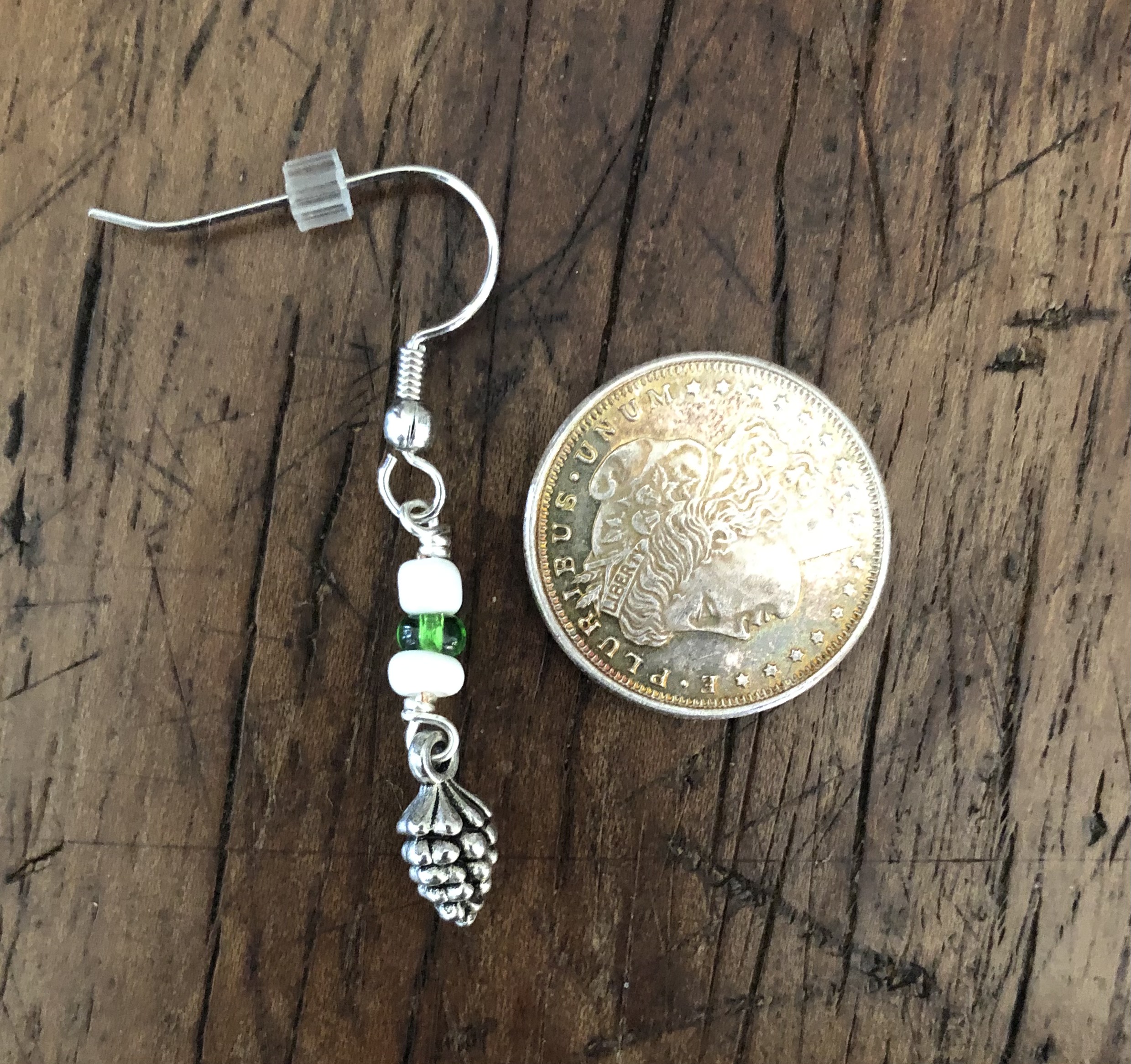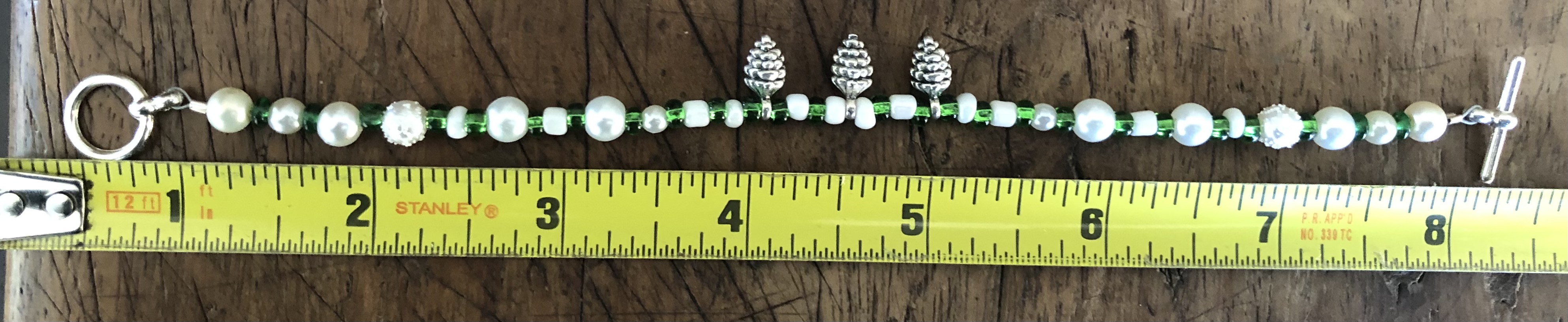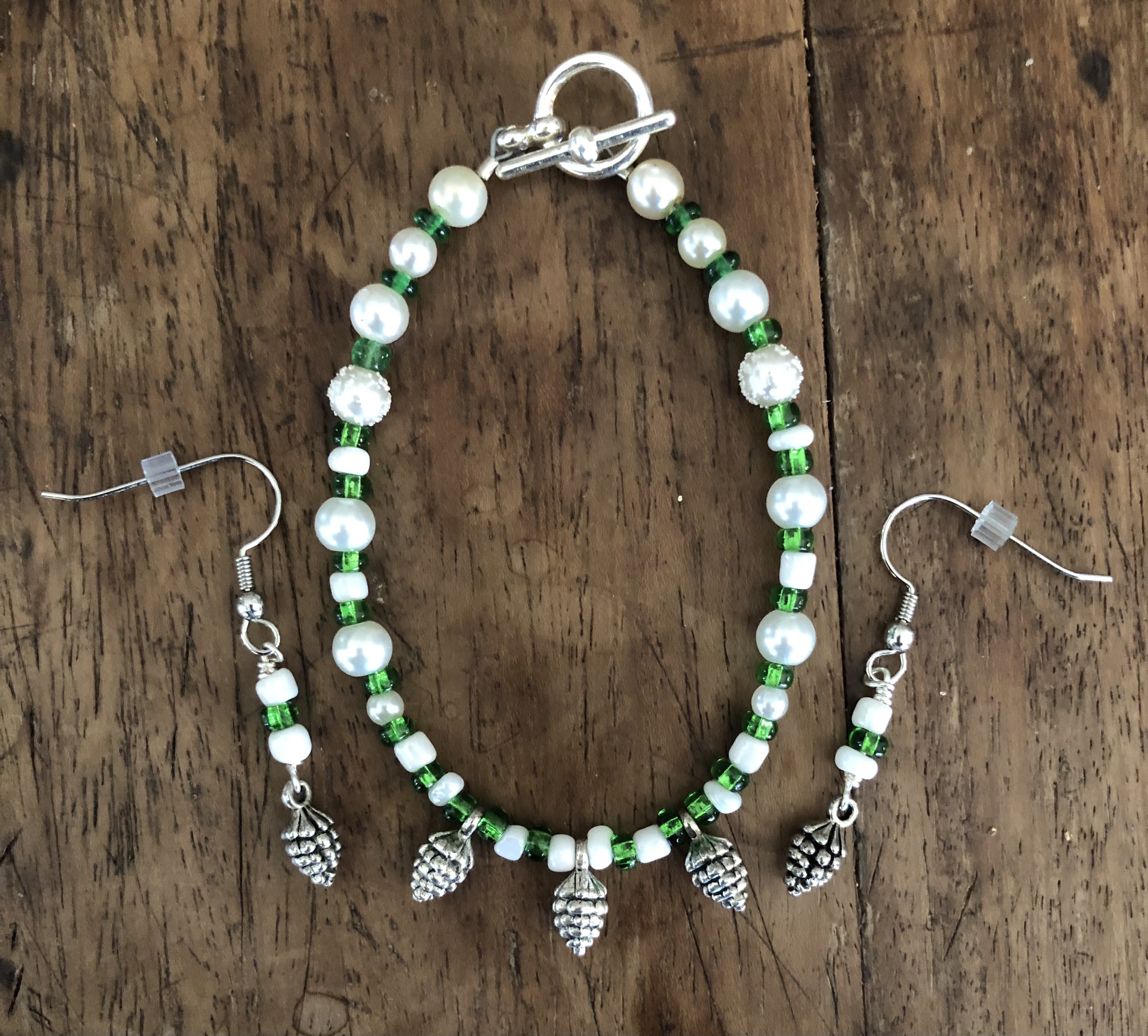 Some years ago I made a variety of bracelet earring jewelry sets themed around Christmas. This one I chose pine cones and I wanted to bring out the winter feel of it so I used mainly white and green beads replicating a pine tree covered in snow.