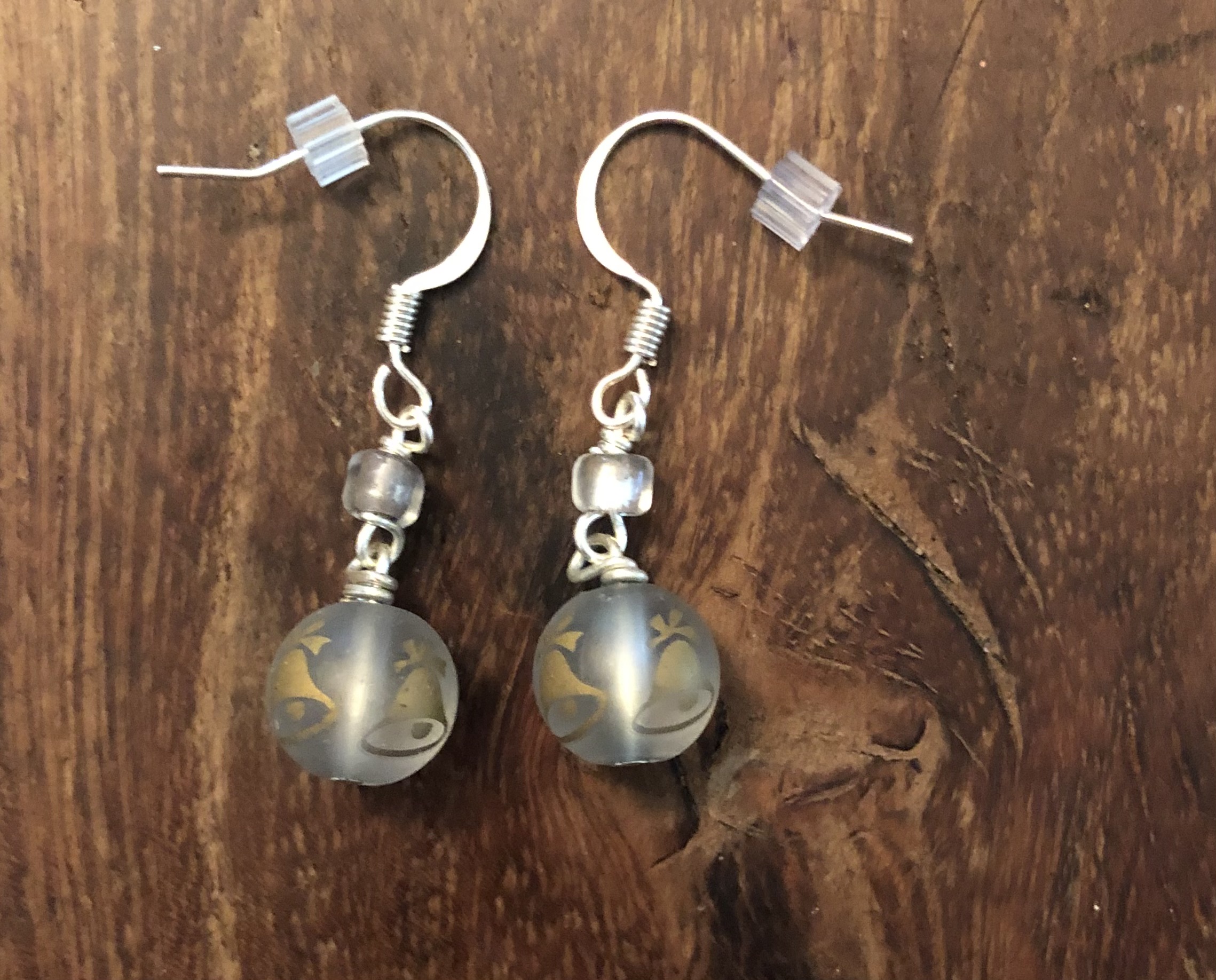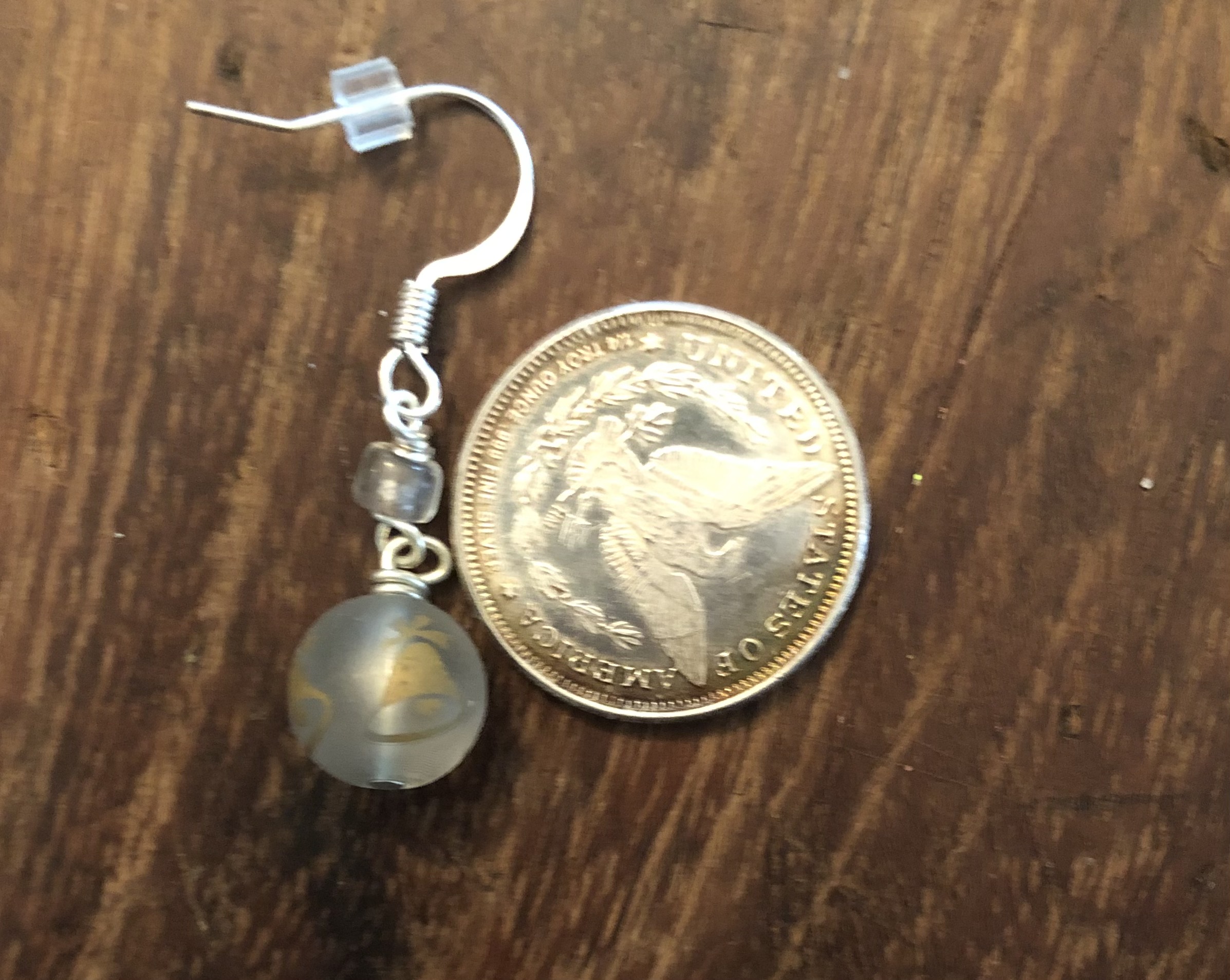 Simple style Christmas earrings with semi-translucent beads that have ringing bells images on said beads.