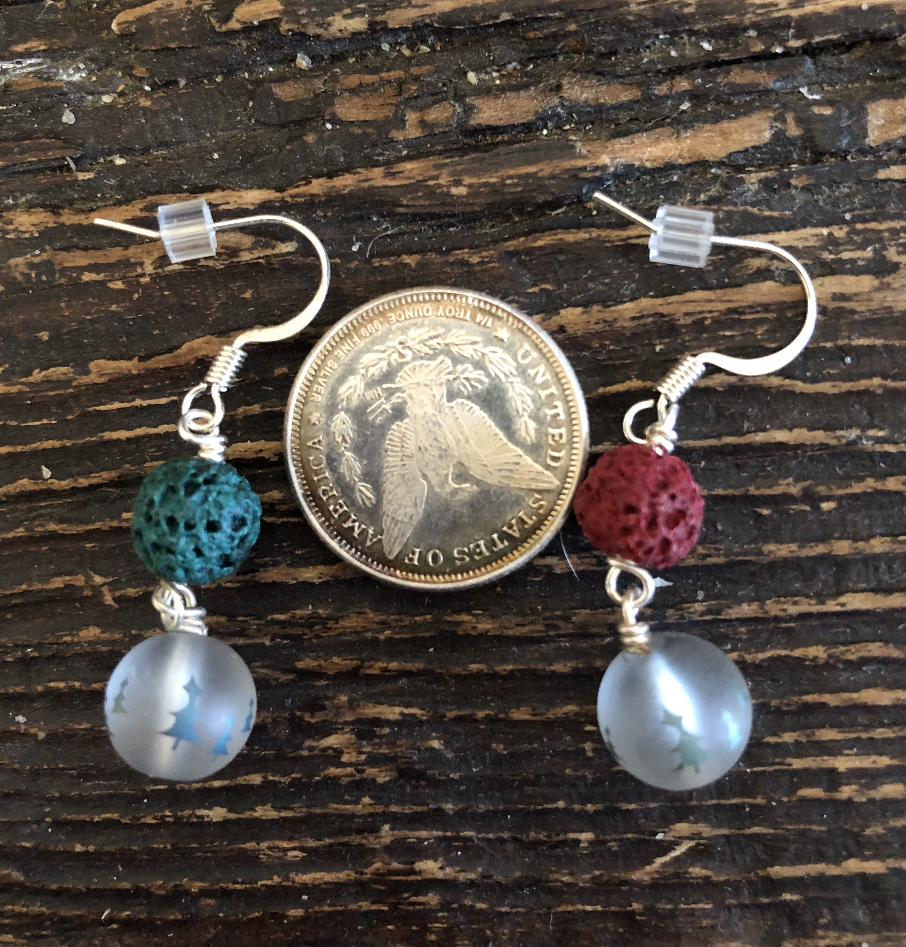 These earrings are made with semi-translucent glass beads with little christmas tress on them wire wrapped to