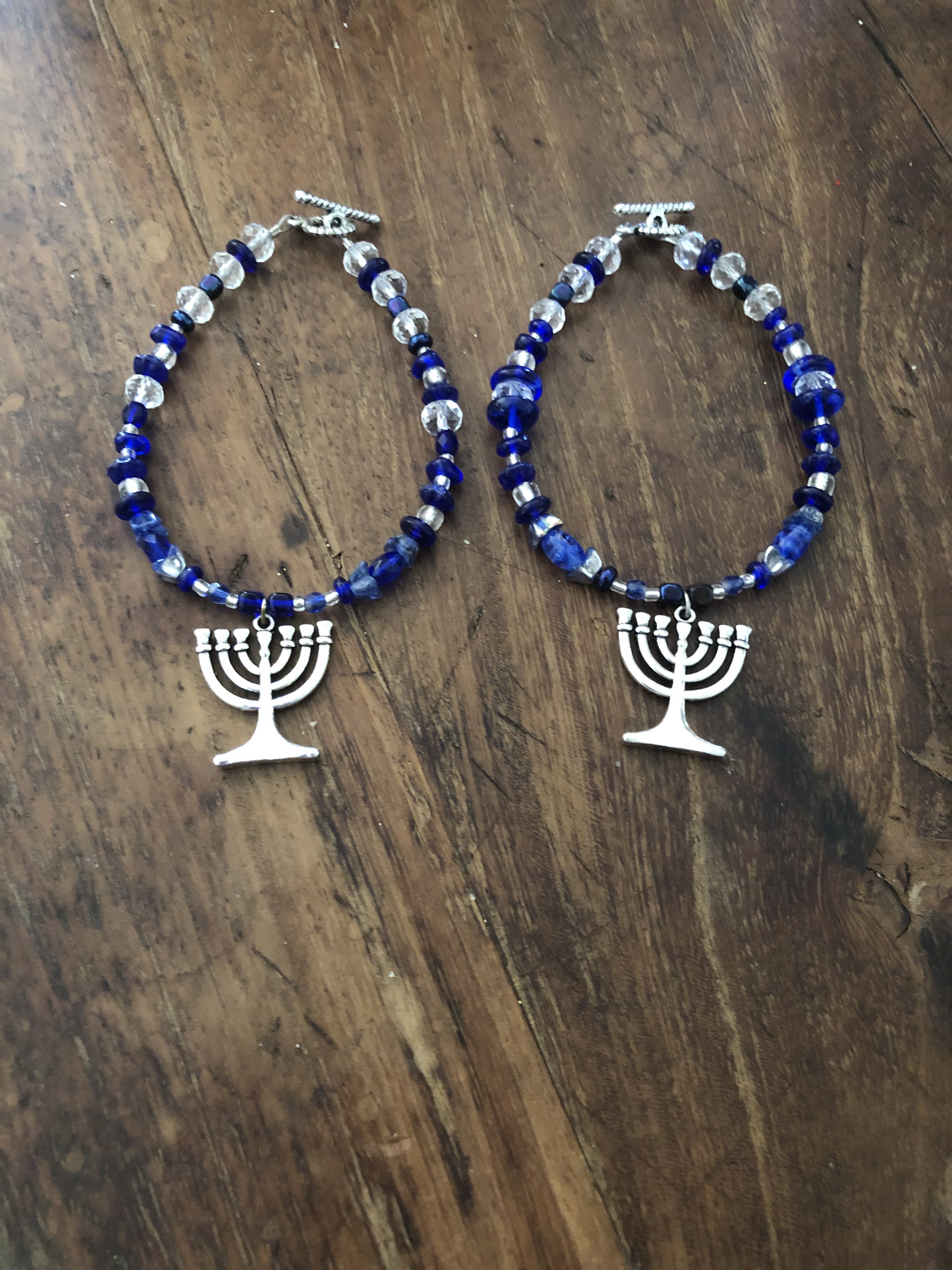 Recently I got some menorah charms and I wanted to make some Hanukkah themed jewelry. These bracelets are made with dark blue and clear beads. Both bracelets have some differences.