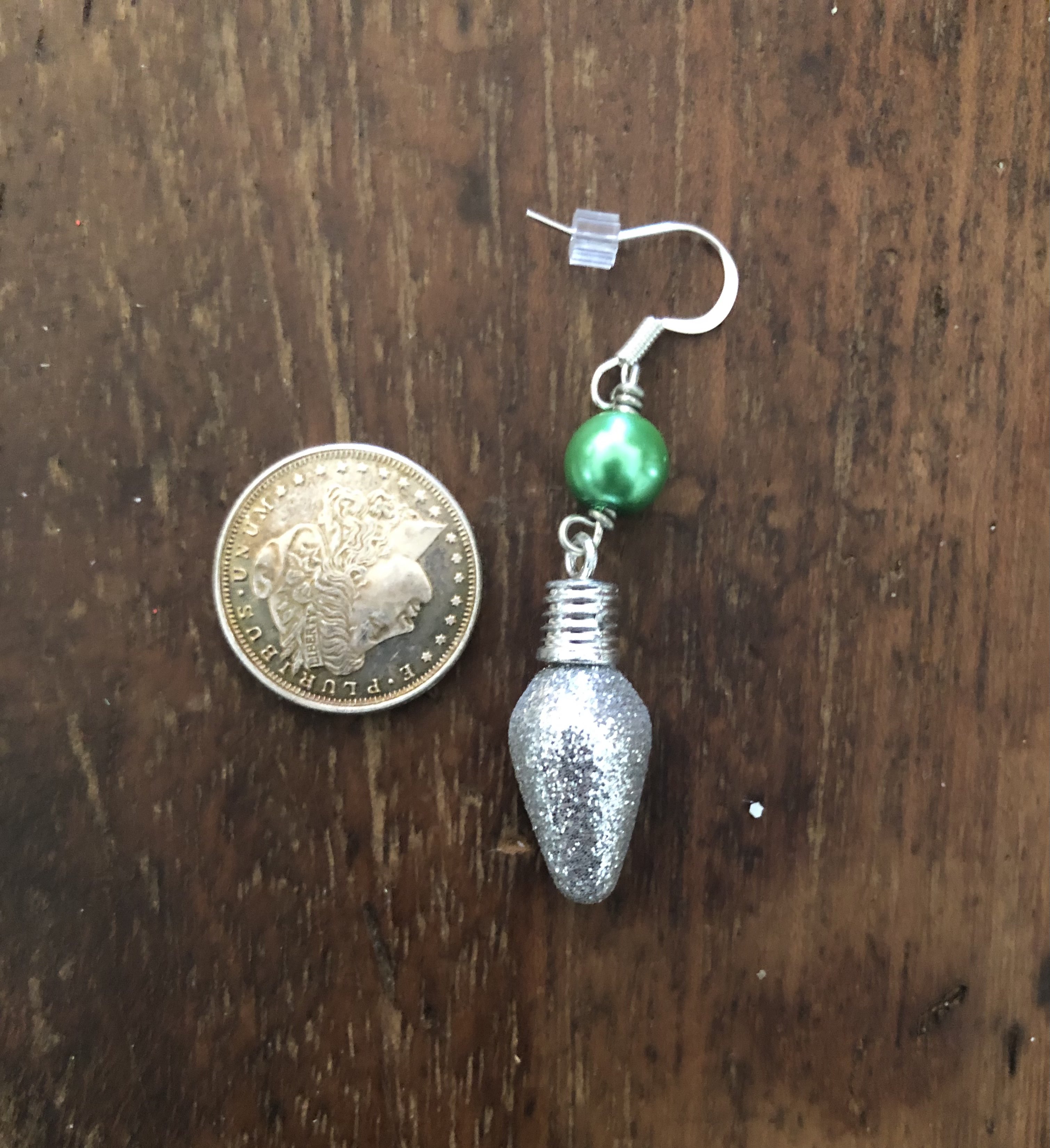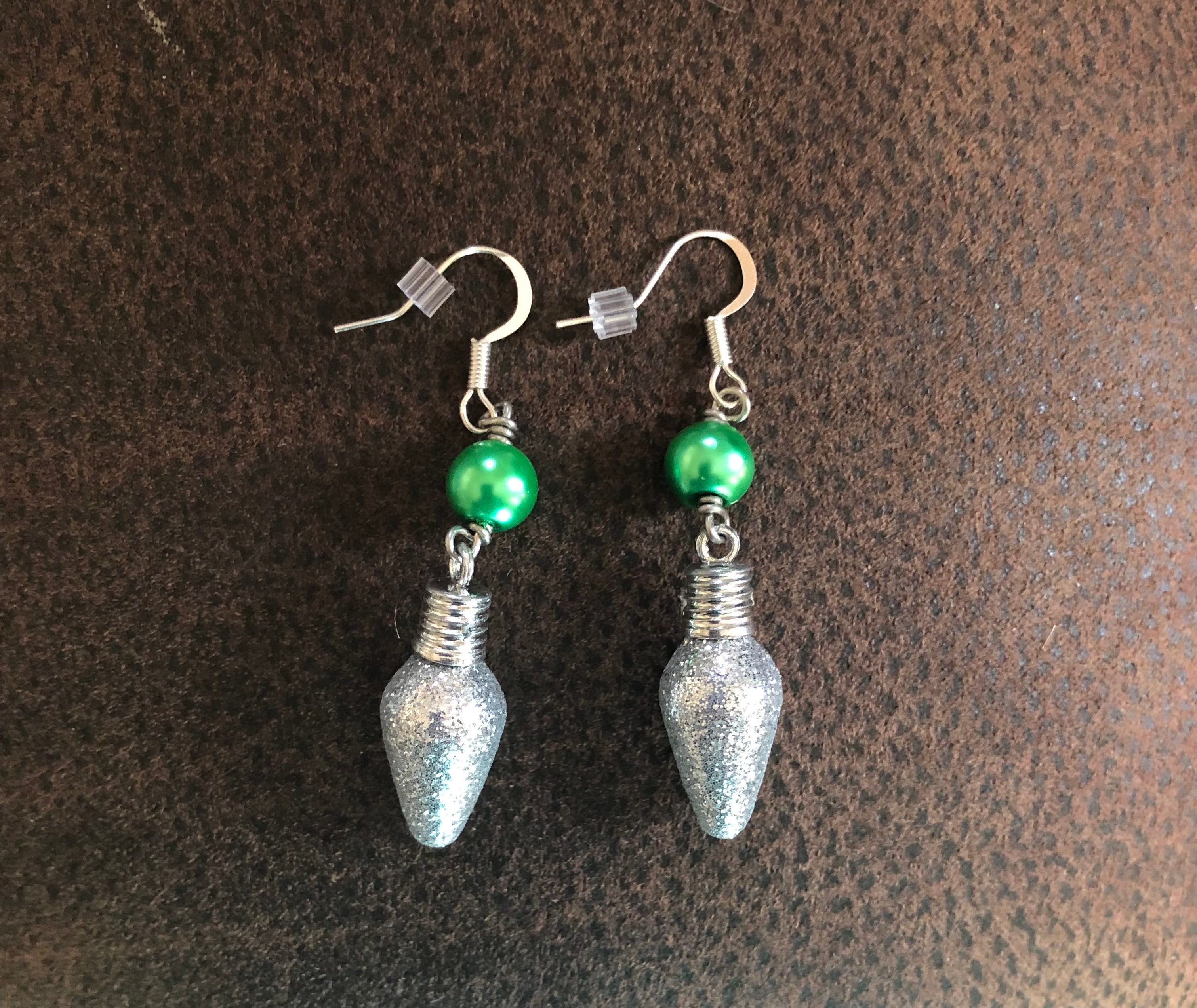 Earrings made with green faux pearl beads and glitter Christmas light charms.
