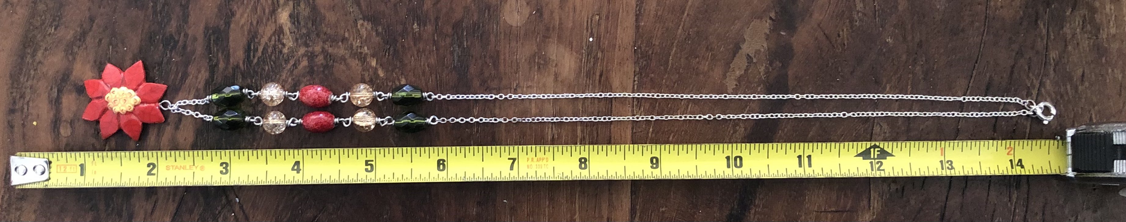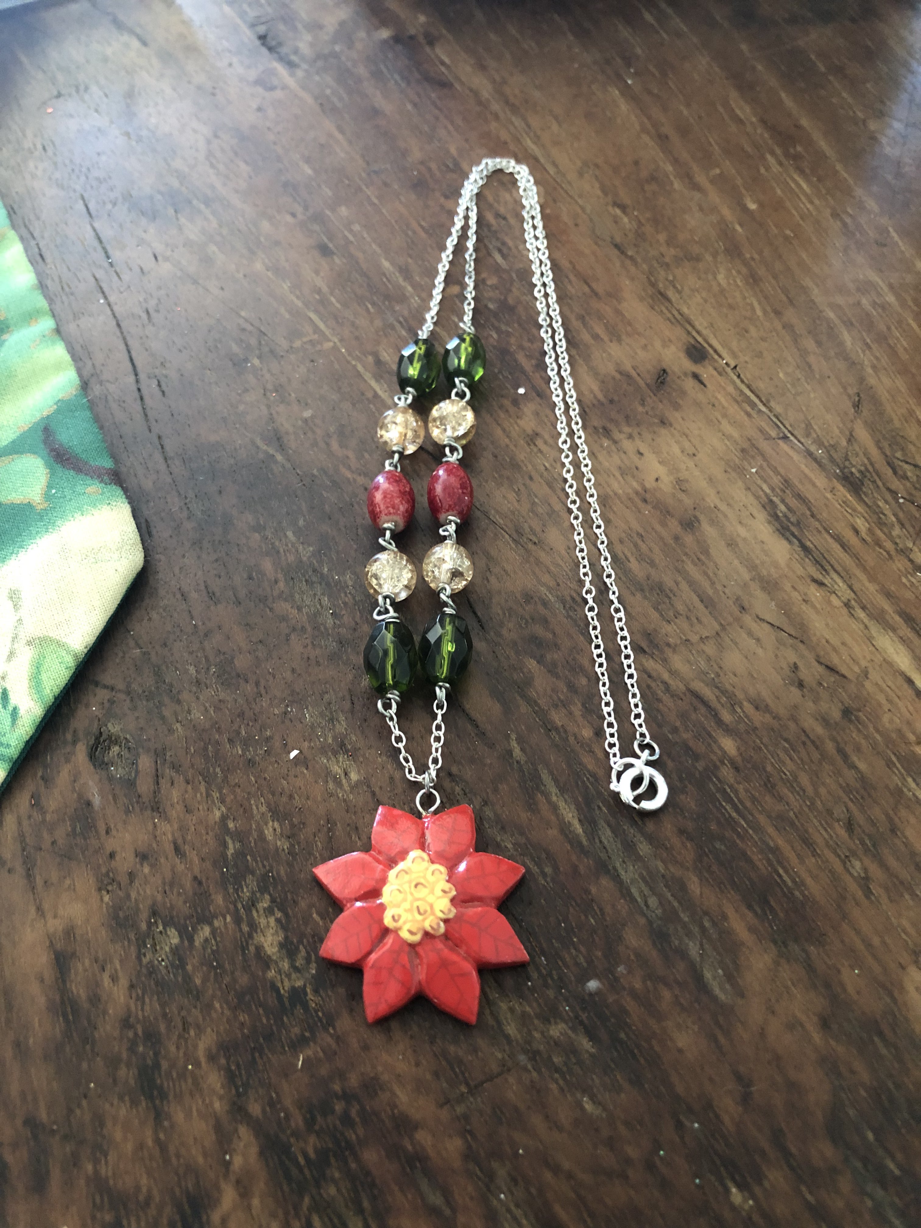 One of the charms to pendants I found in the Christmas jewelry grab bag I got some time ago was a wooden poinsettia charm that was once a single earring. I thought it would work better as a necklace so I used a dark dull faceted green beads, cream to yellowish beads, and speckled red beads.