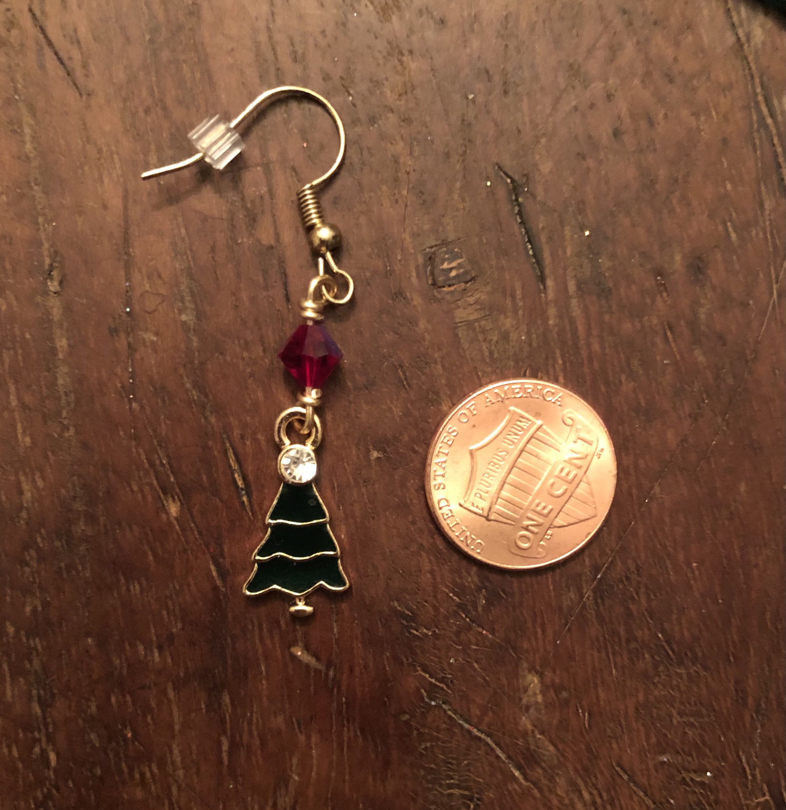 Christmas tree charms wire wrapped with little diamond shaped faceted red beads.