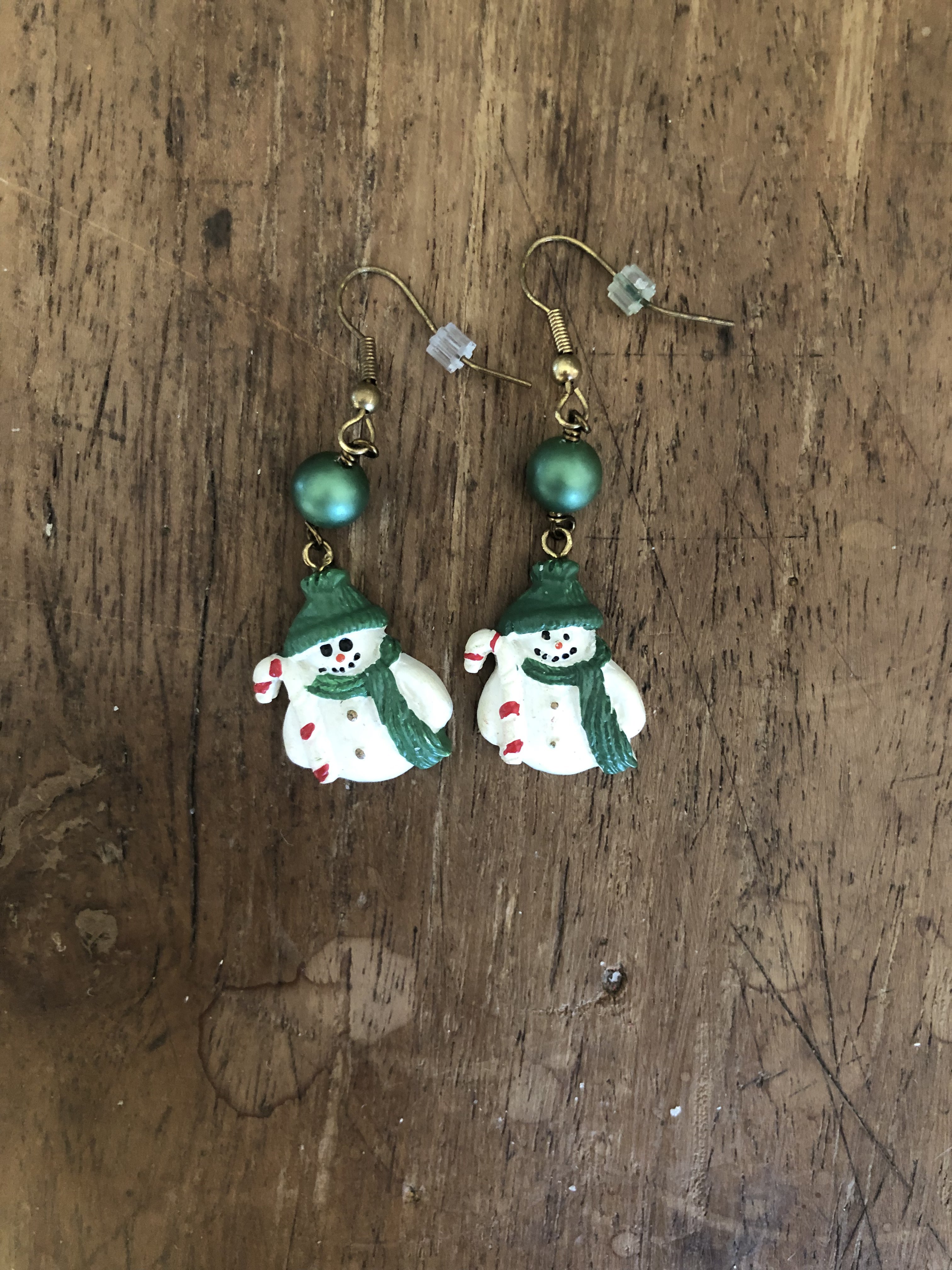 These Snowmen holding a candy cane earrings originated from a jewelry grab bag jar. I replaced the original silver colored earring hooks with the more fitting match of brass colored earring hooks. I also wire wrapped dull green fake pearl beads to the little charms.