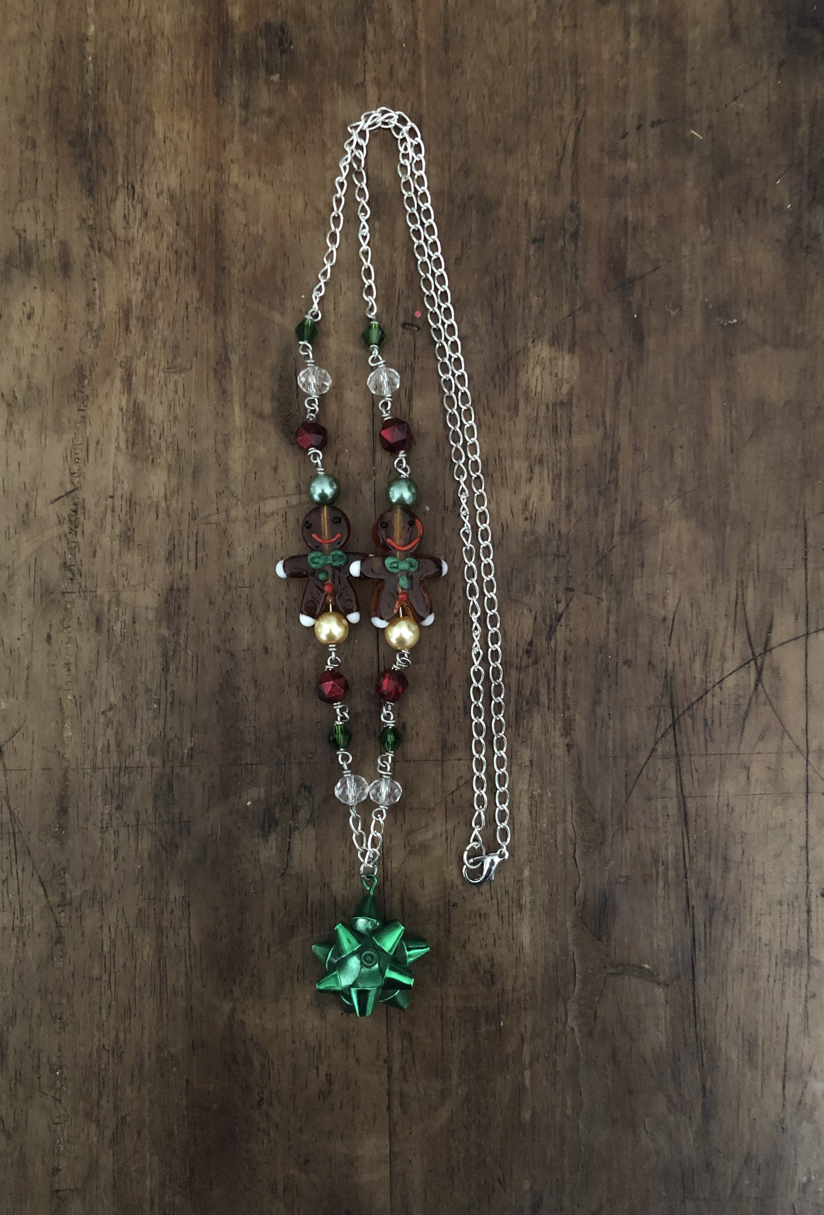 This necklace is made with a green metal Christmas bow pendant, clear faceted glass beads, green faceted glass beads, red glass faceted bead, cream colored fake pearl beads, and lampwork gingerbread men beads.