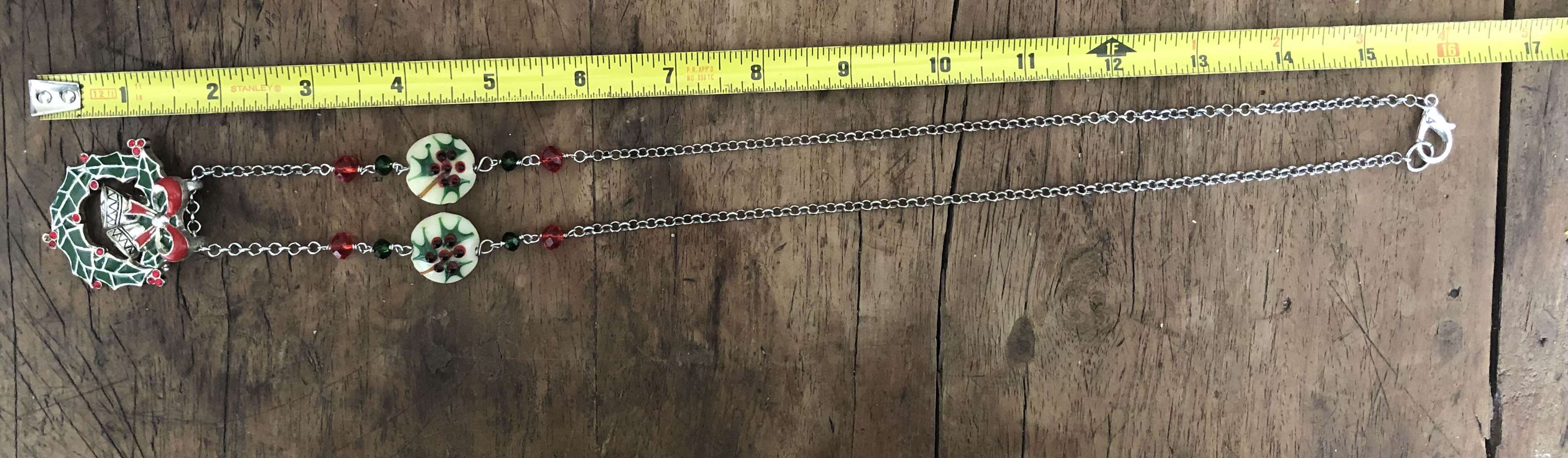 This vintage pendant brooch I got from a little shop in Bisbee, Arizona around 2023/2024 if I remember correctly. I used red faceted glass beads, green faceted glass beads, and hand blown glass holly beads to create this necklace.