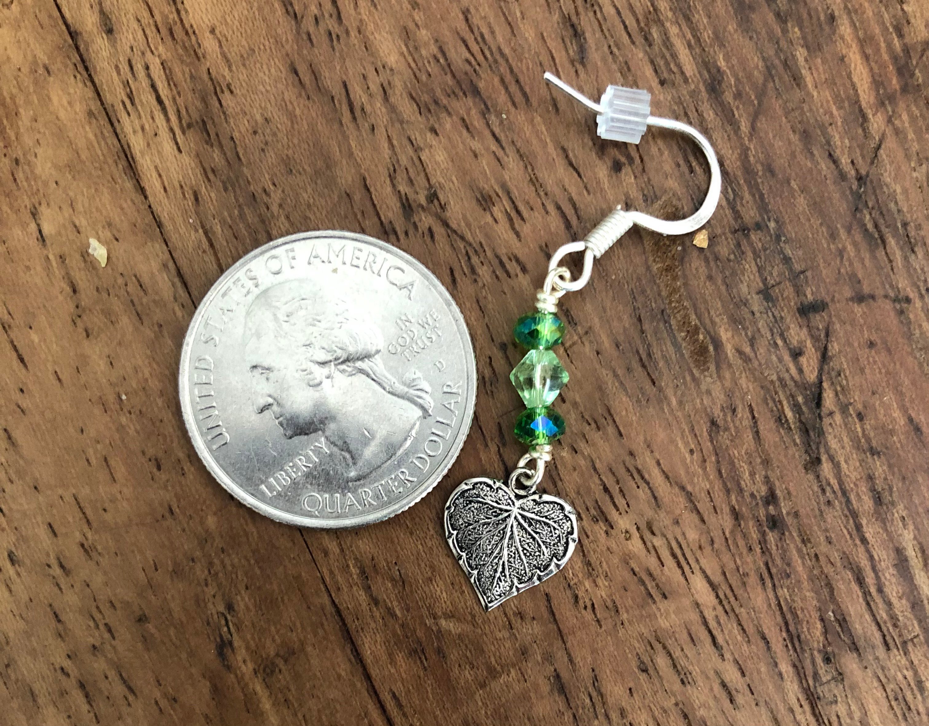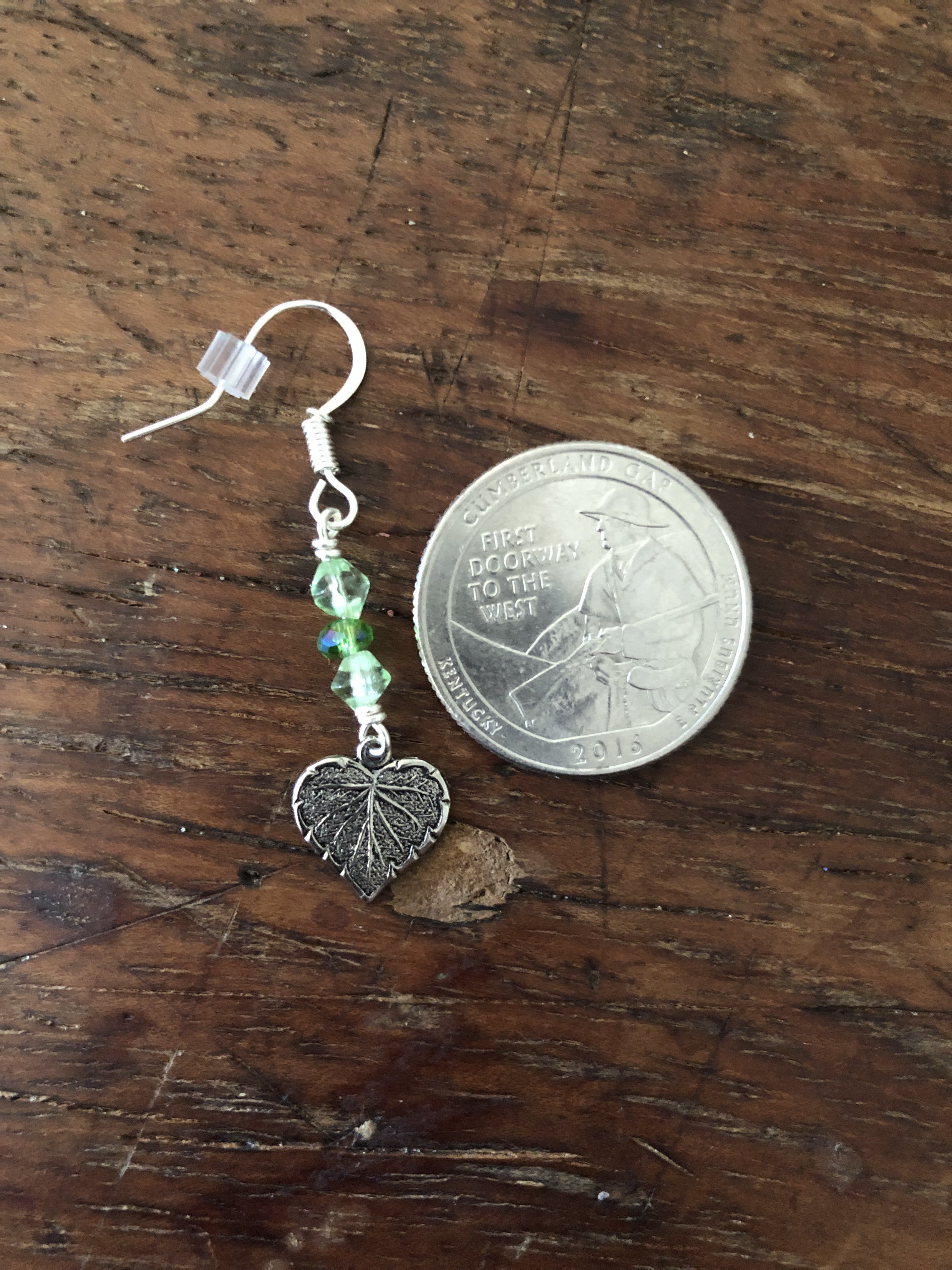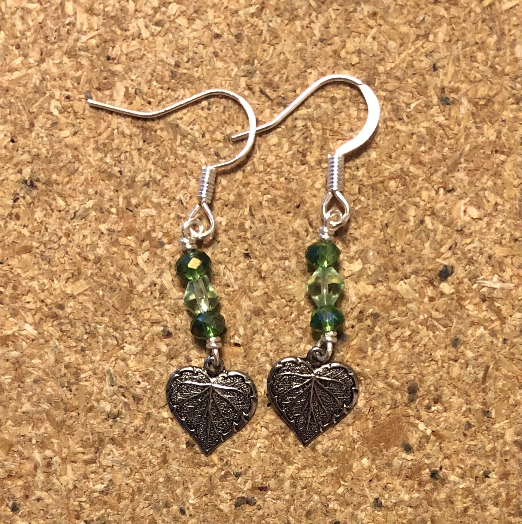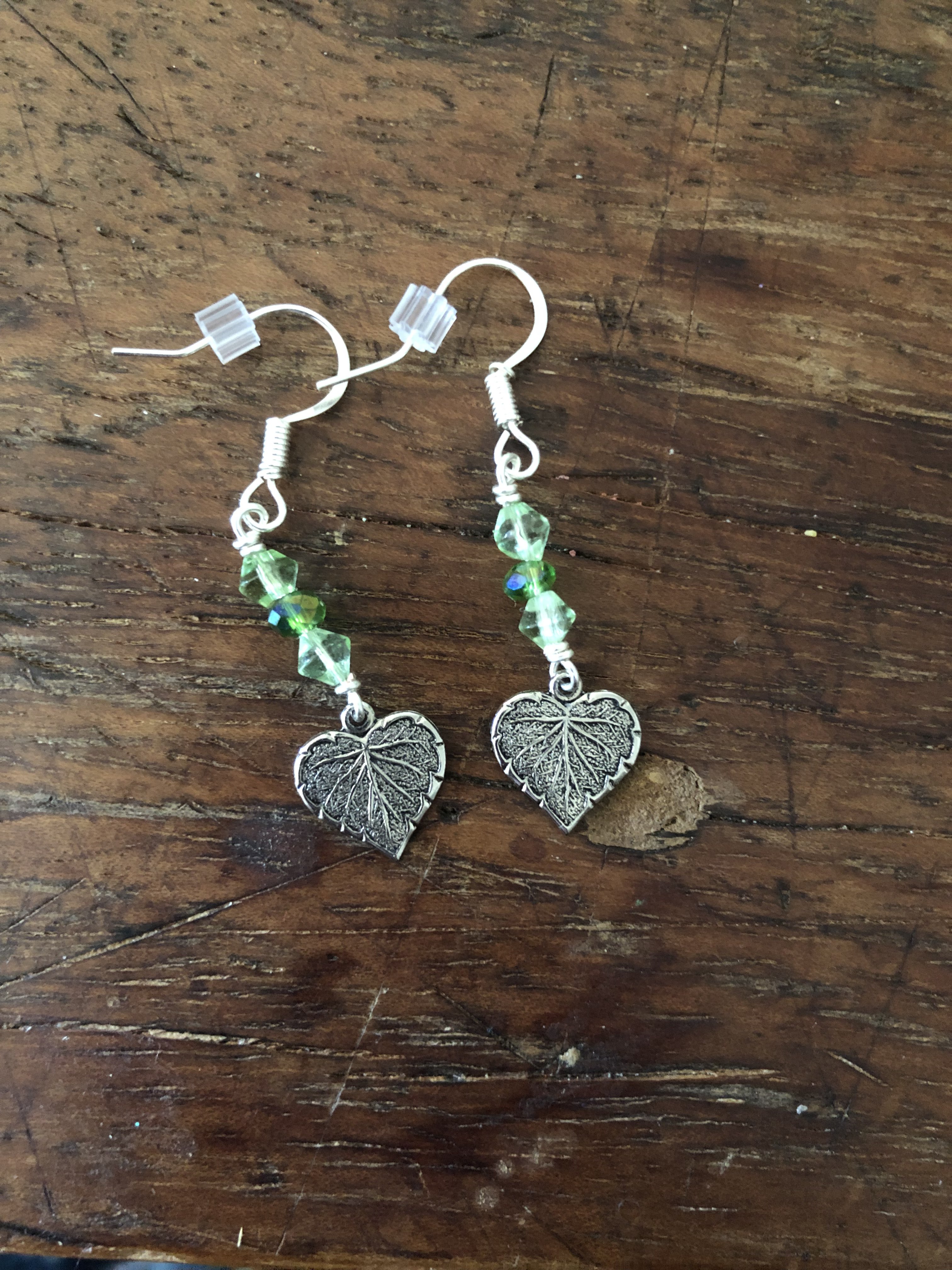 Little green beads wire wrapped to silver colored heart shaped leaf charms.