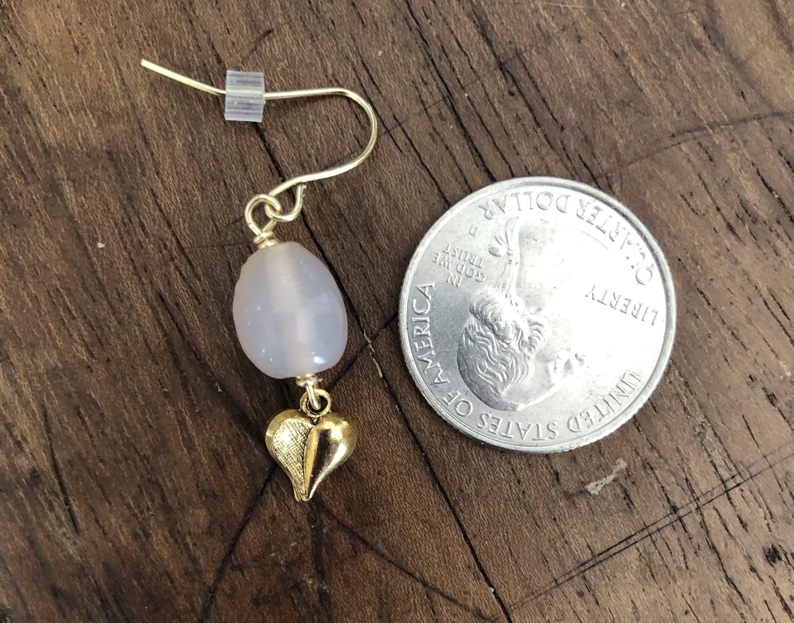 Tiny gold colored heart shaped charms wire wrapped to Small pale pink beads.