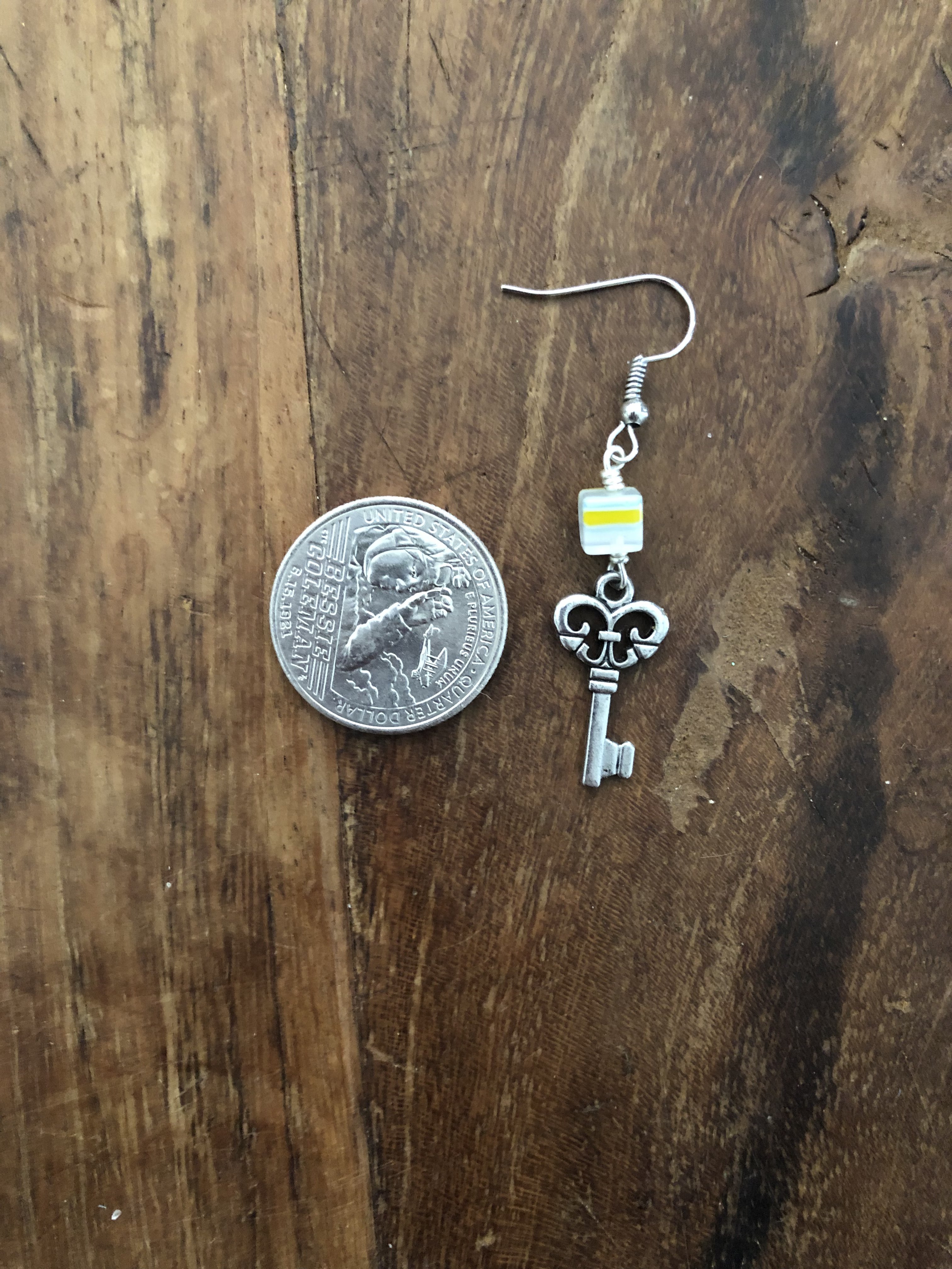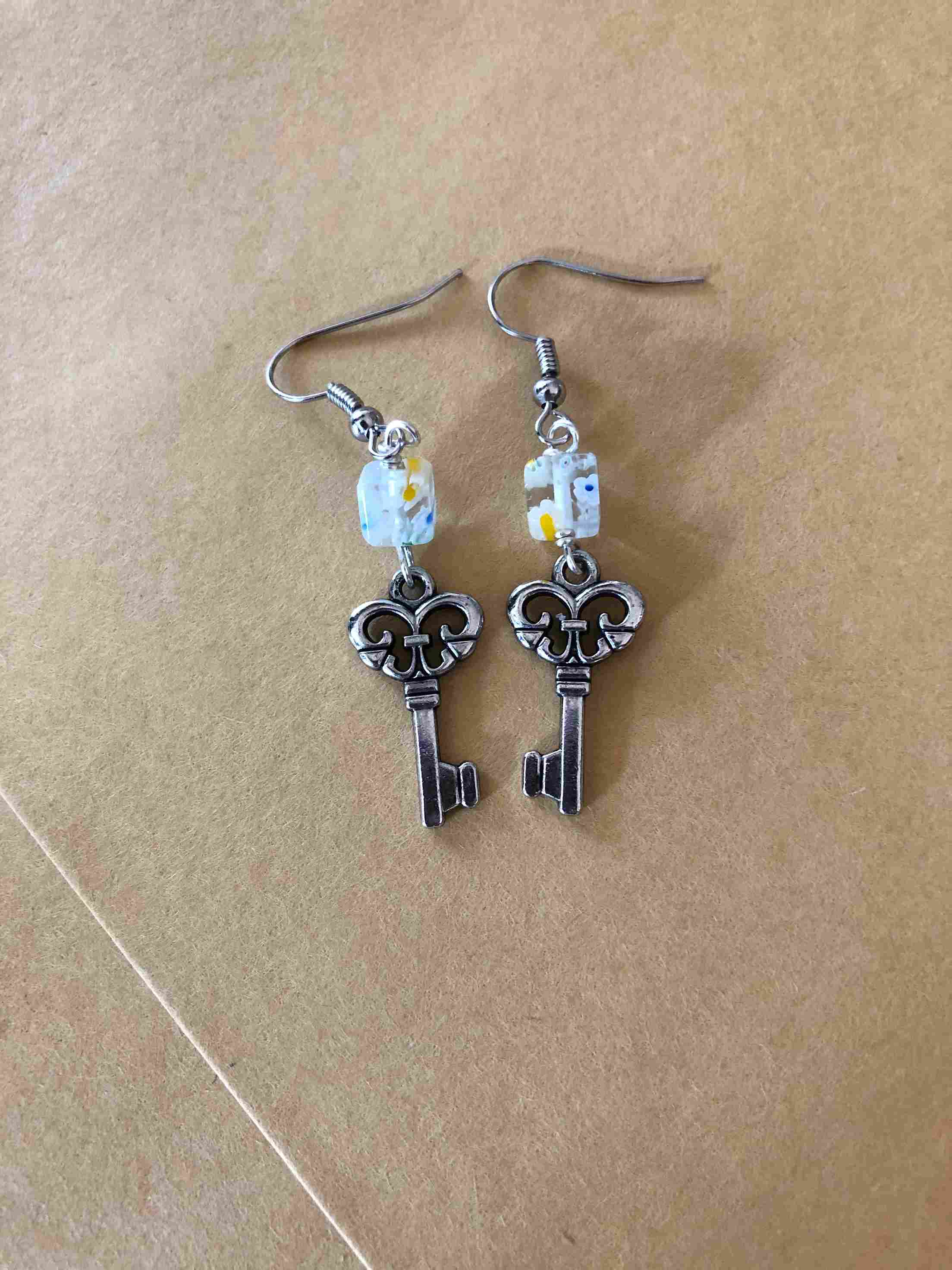 Silver colored heart key charms wire wrapped to glass floral square beads.