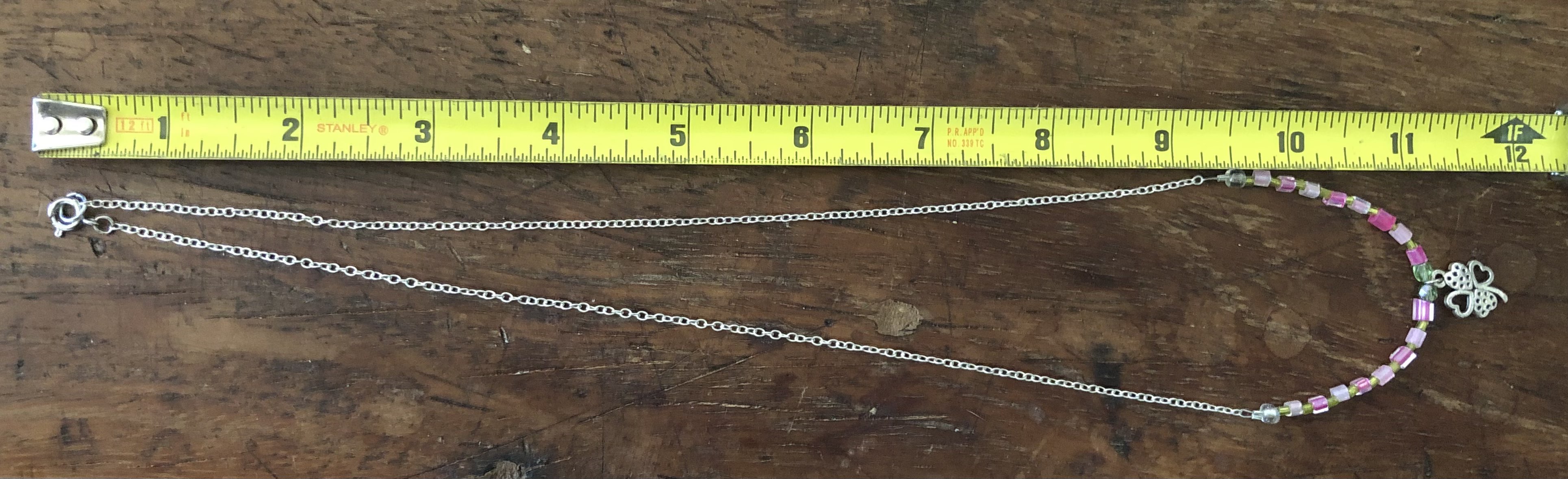 Four Leaf clover pendant with pink and green beads connected to a chain.