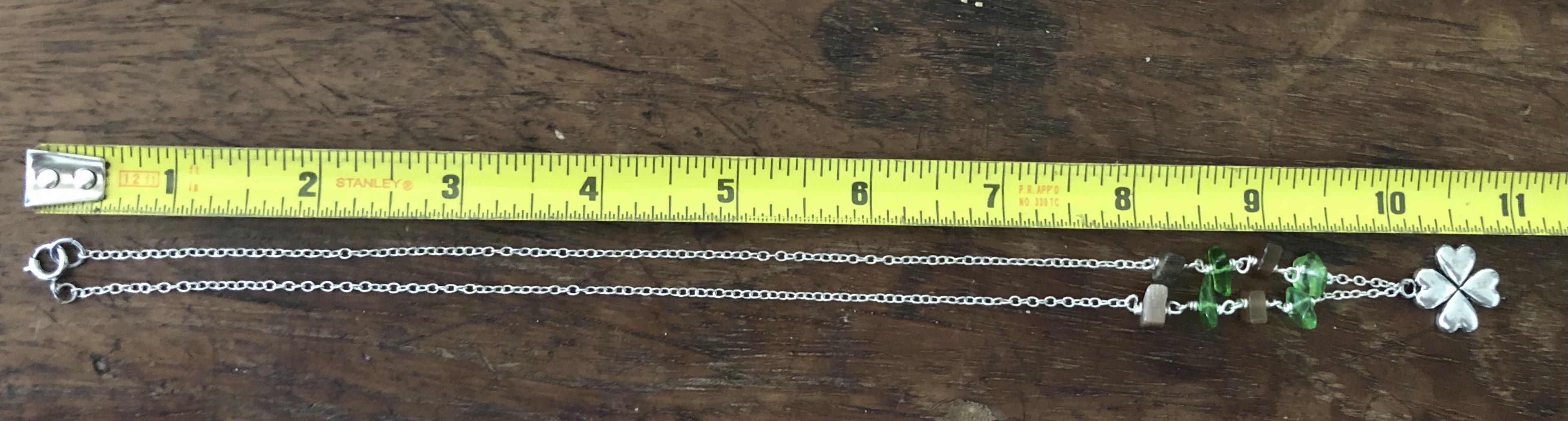 Four leaf clover pendant with green and brown stones wire wrapped on the chains.