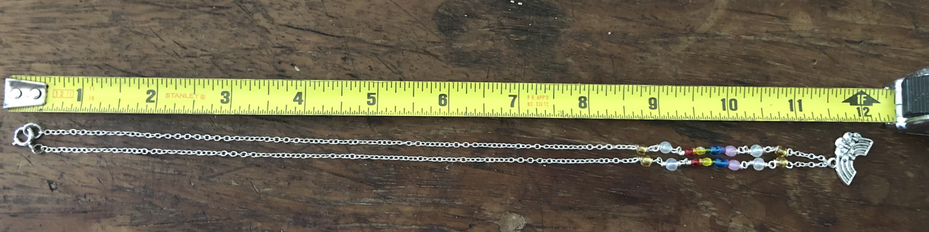 Rainbow pendant with beads that mimic the color of the rainbow, semi clear beads mimicking clouds, and gold color beads referencing pot of gold all wire wrapped to chains.