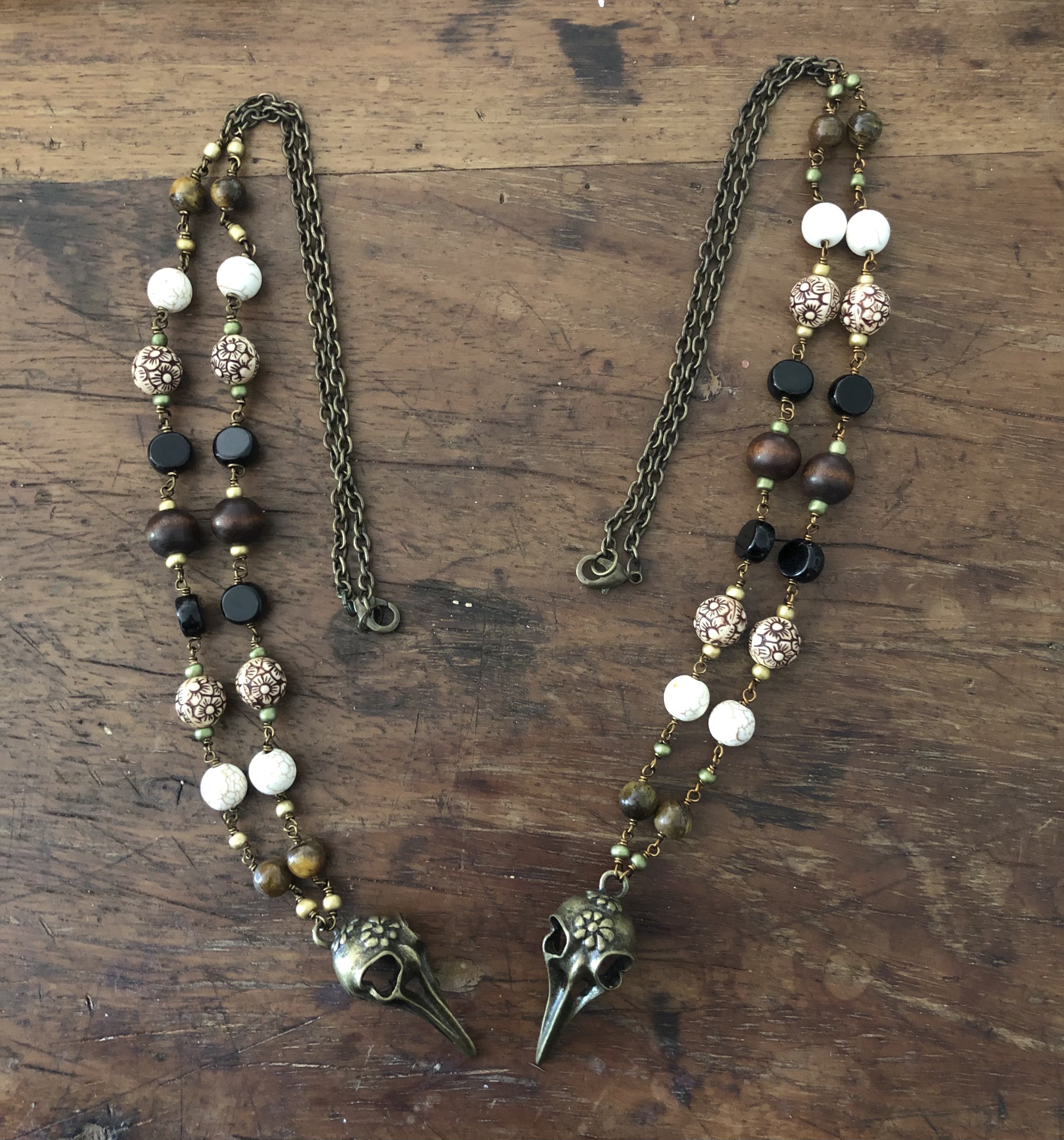 Brass colored bird skull with flowers pendant wire wrapped with small beads, yellow tigers eye beads, white howlite beads, floral beads, black stone beads, and wood beads. I made two different versions, one with mostly green beads and the other with mostly yellow beads.