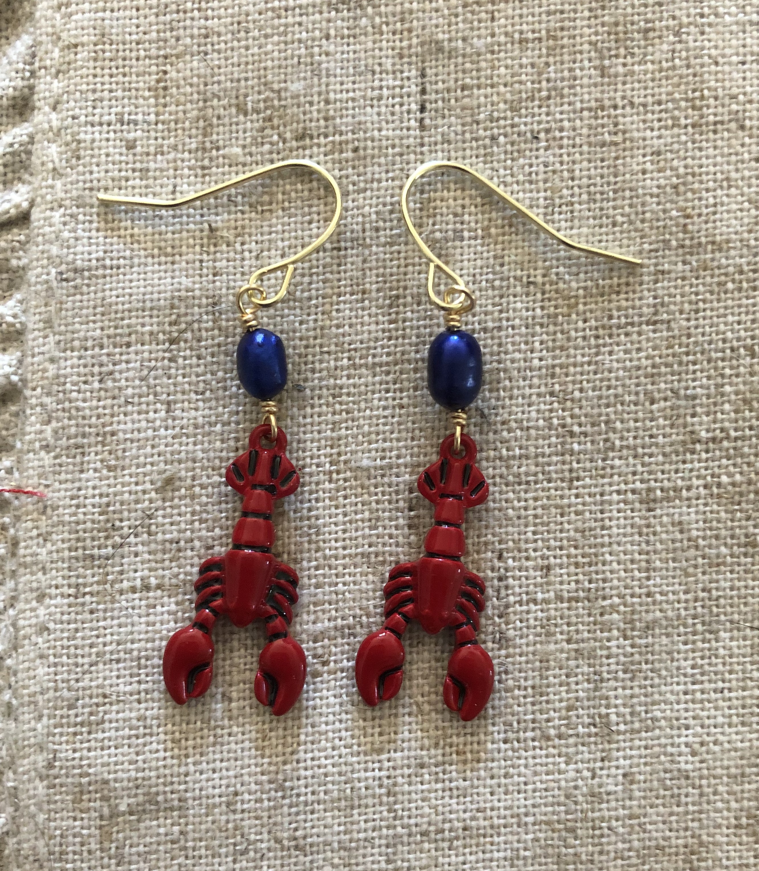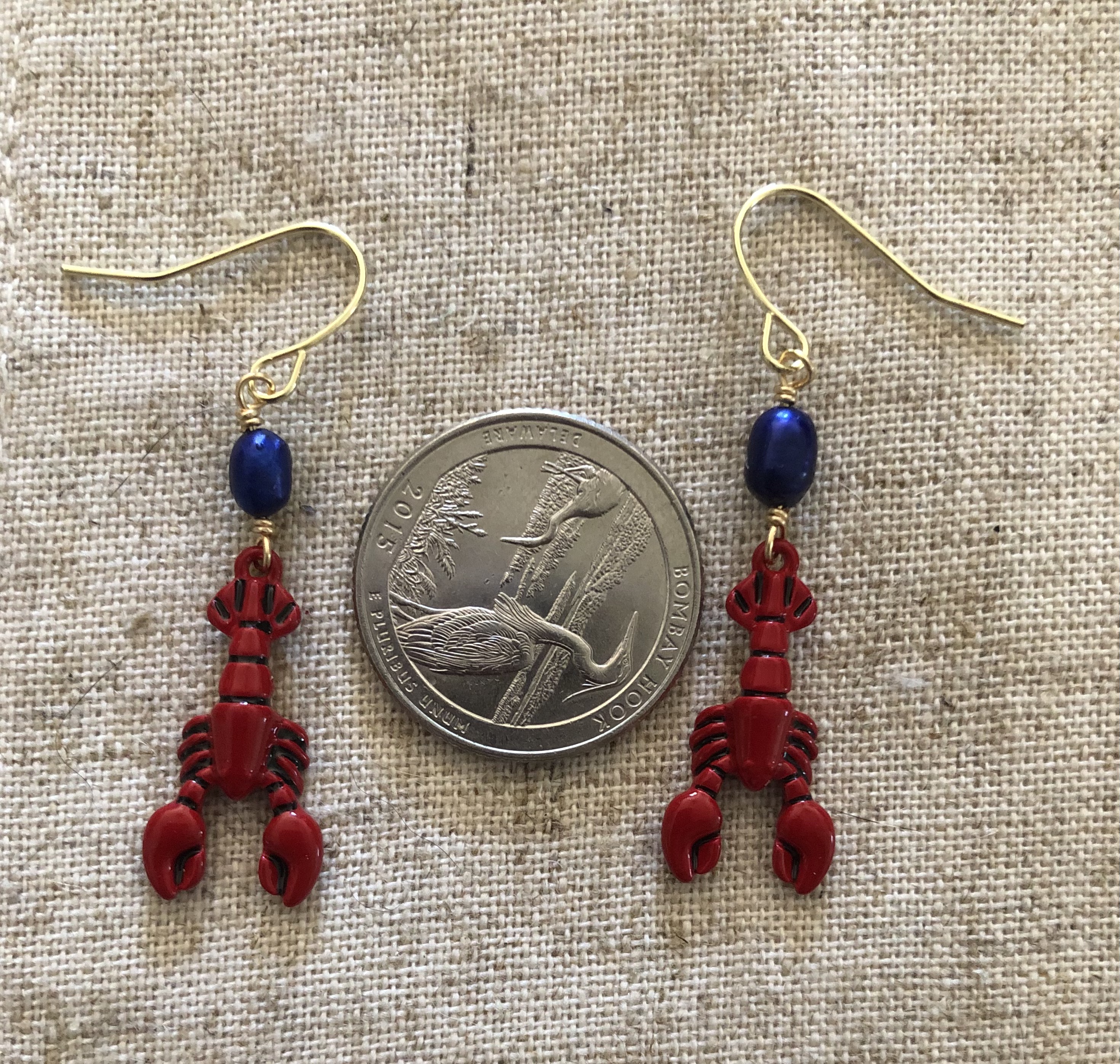 Ocean themed earrings with dark blue pearl beads wire wrapped to metal strong red lobster charms.