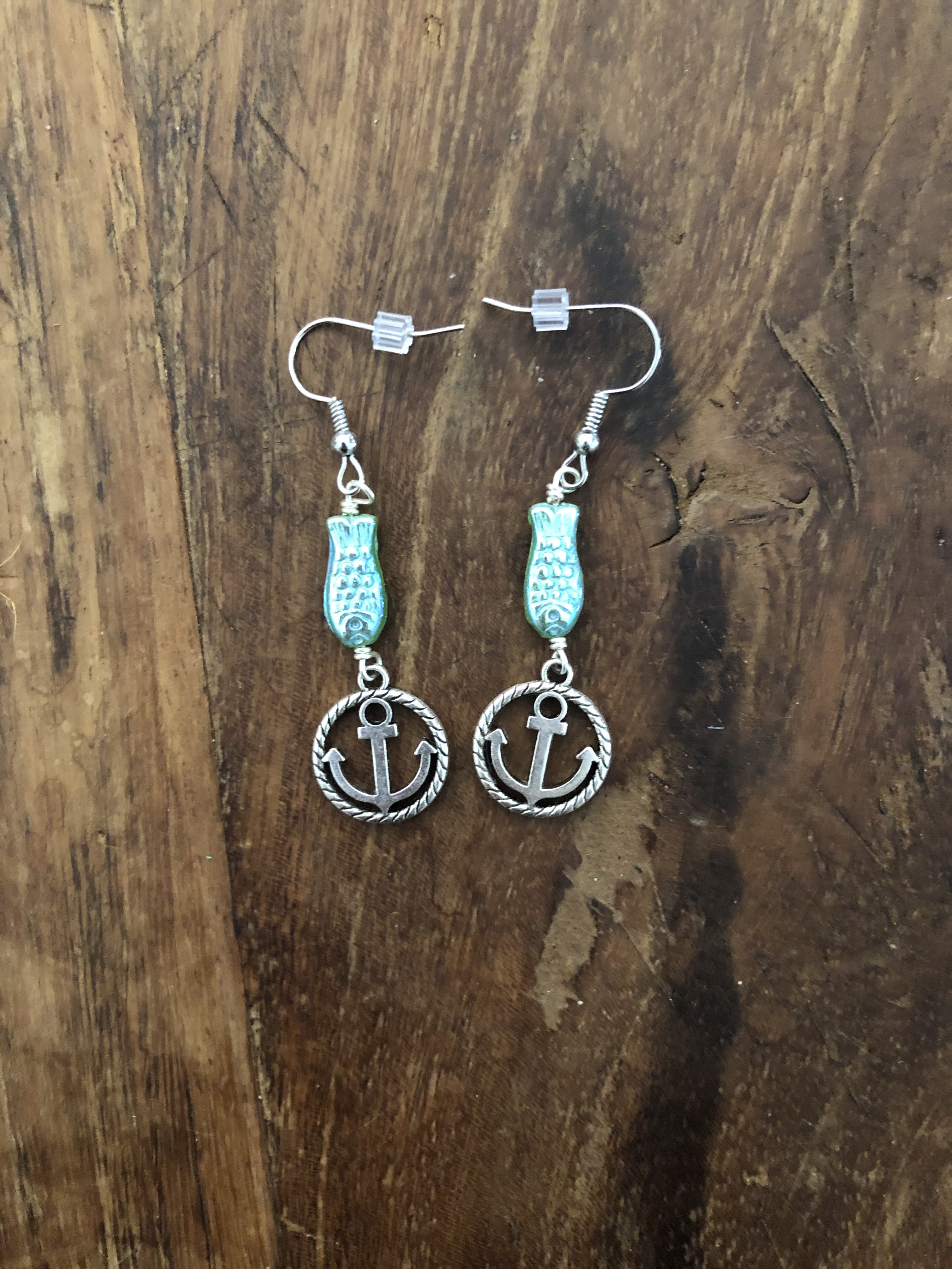 These earrings are made with Czech glass fish beads that have a iridescent shine on one side while the other side is green. Wire wrapped to the bead is a metal anchor within a circle charm.