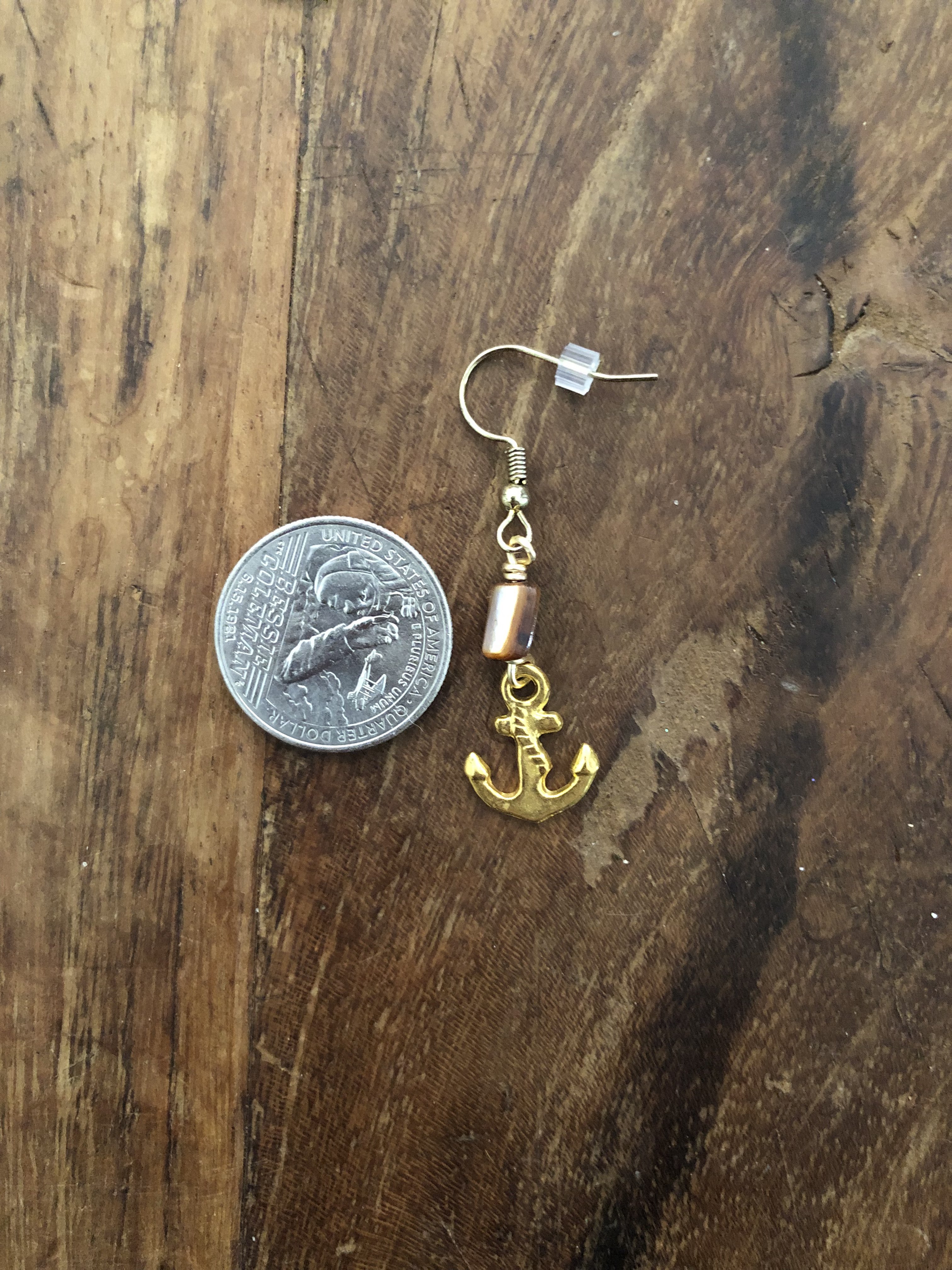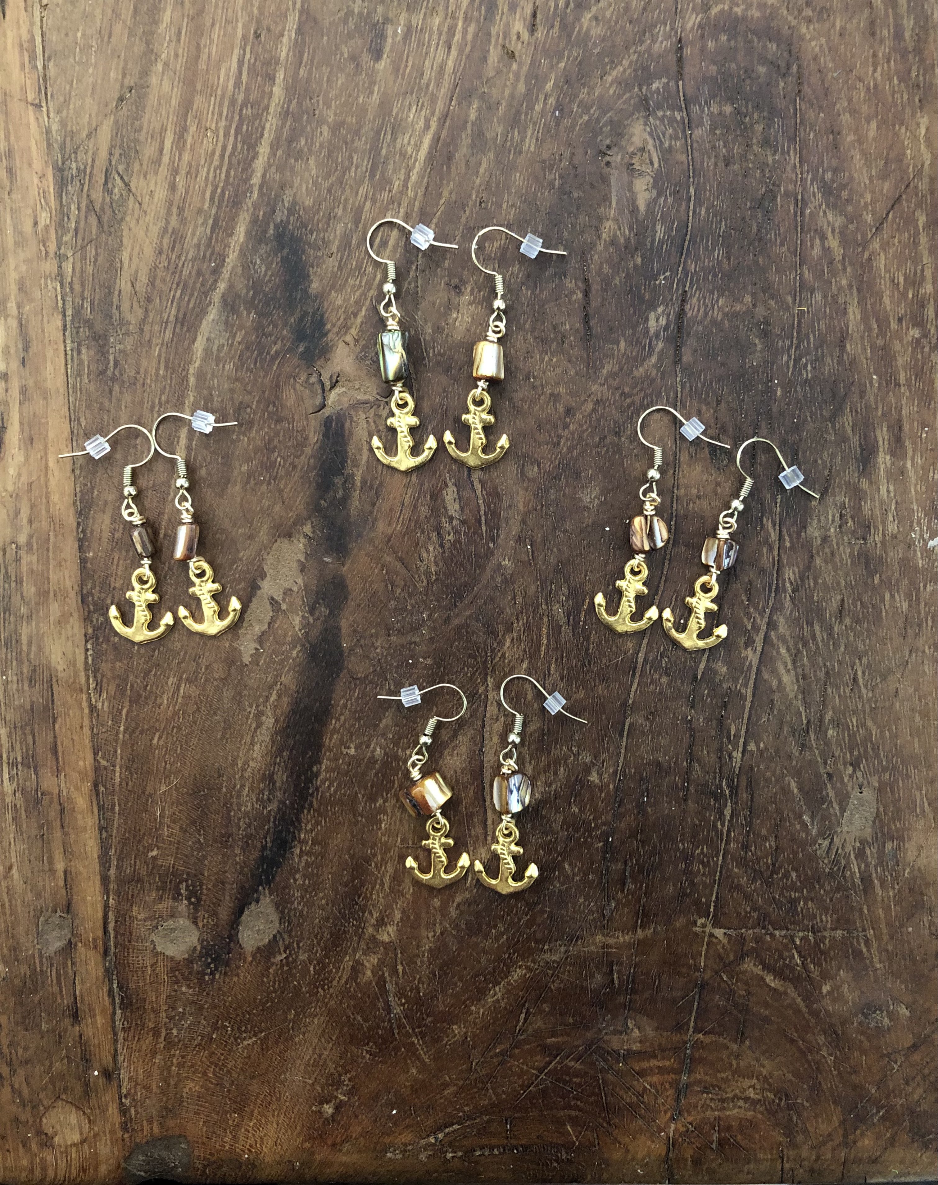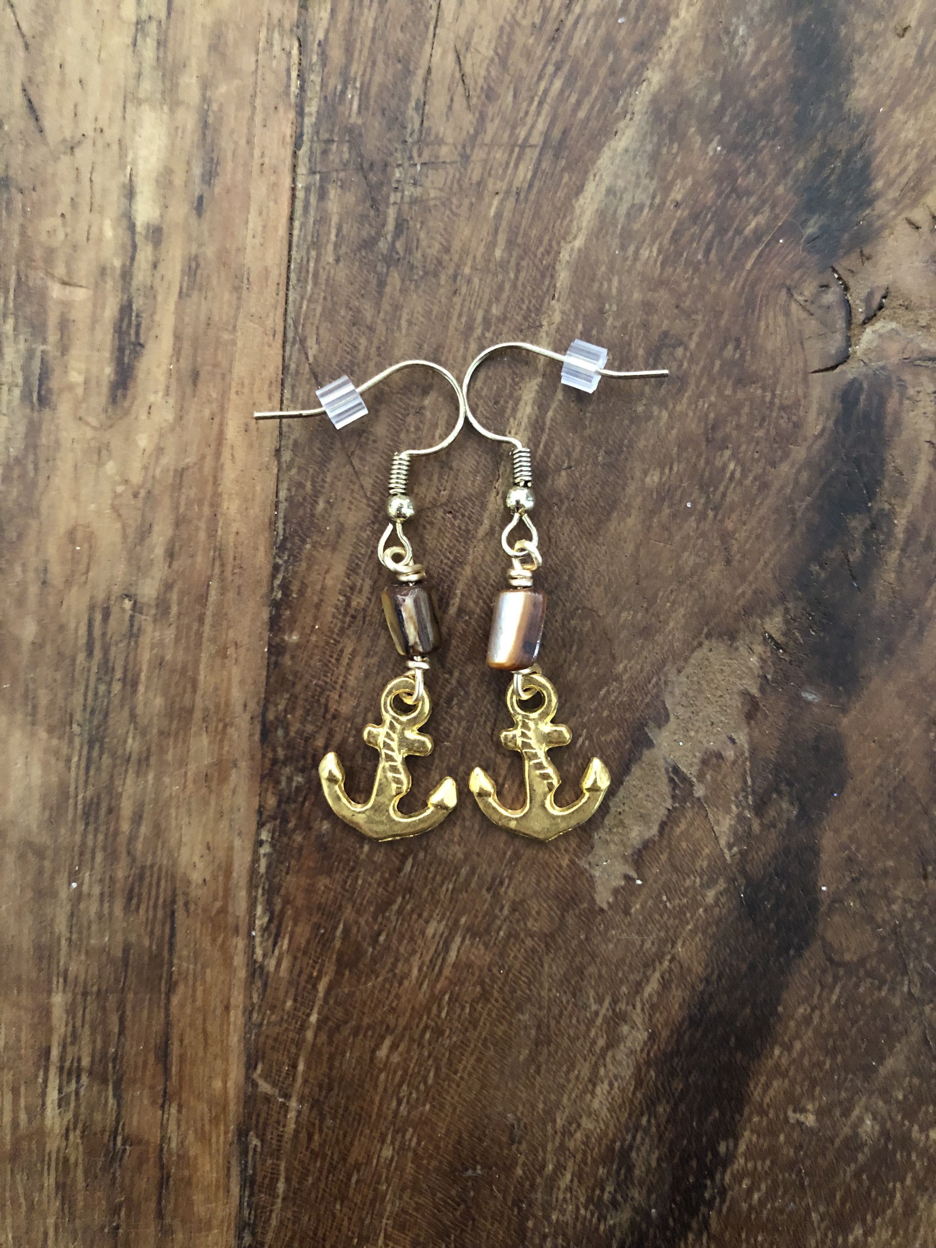 These earrings have brown mother of pearl beads wire wrapped to small golden metal anchor charms.