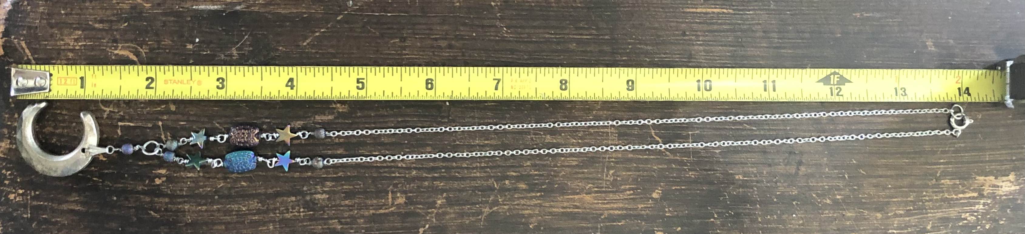 The moon pendant I got through a grab bag in 2023 which I knew that I was going to use for a jewelry piece one day. I then decided to make a necklace with it using small round rainbow hematite beads, rainbow hematite star beads, and rainbow colored rectangle beads. Giving it more of a colorful night vibe to it.
