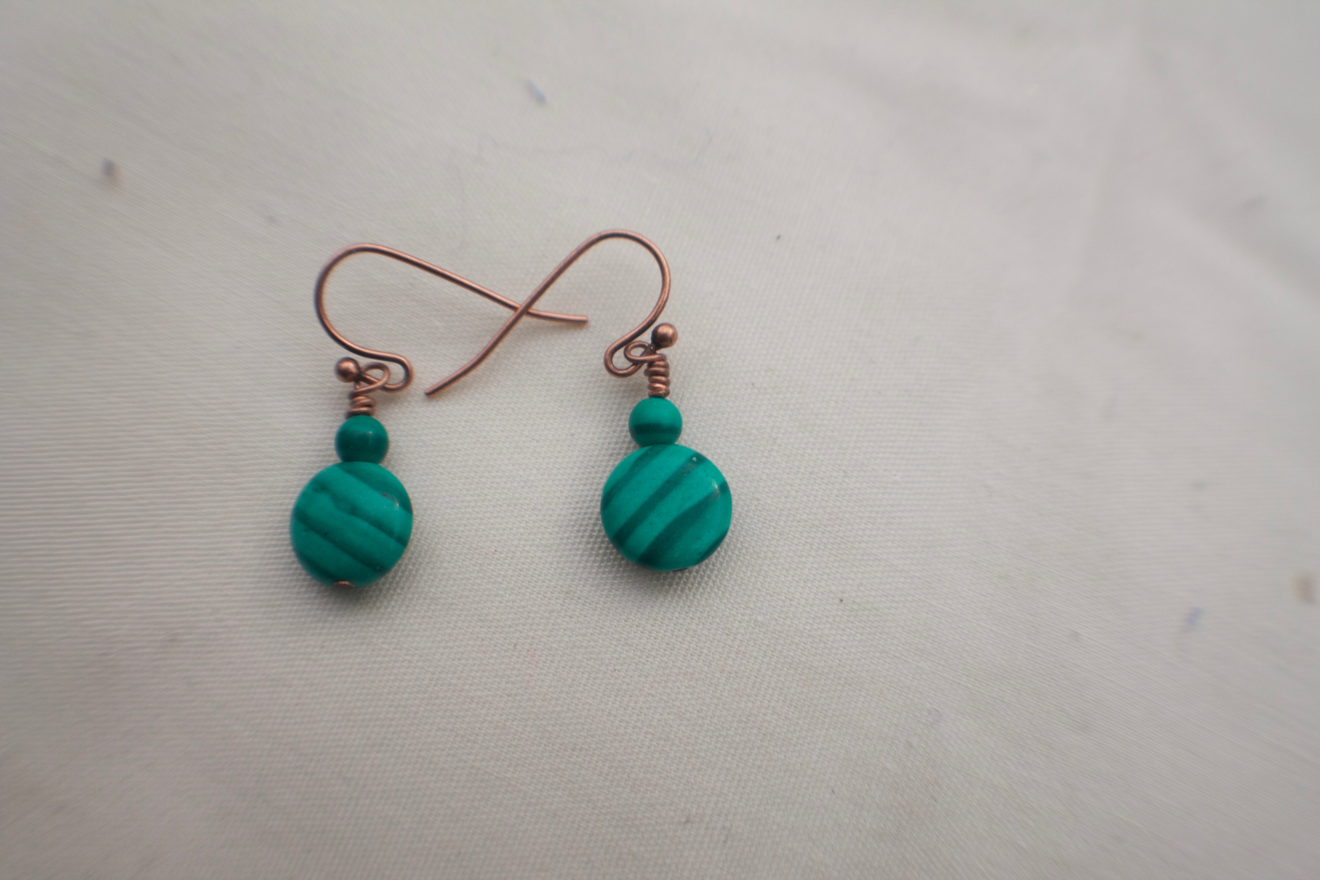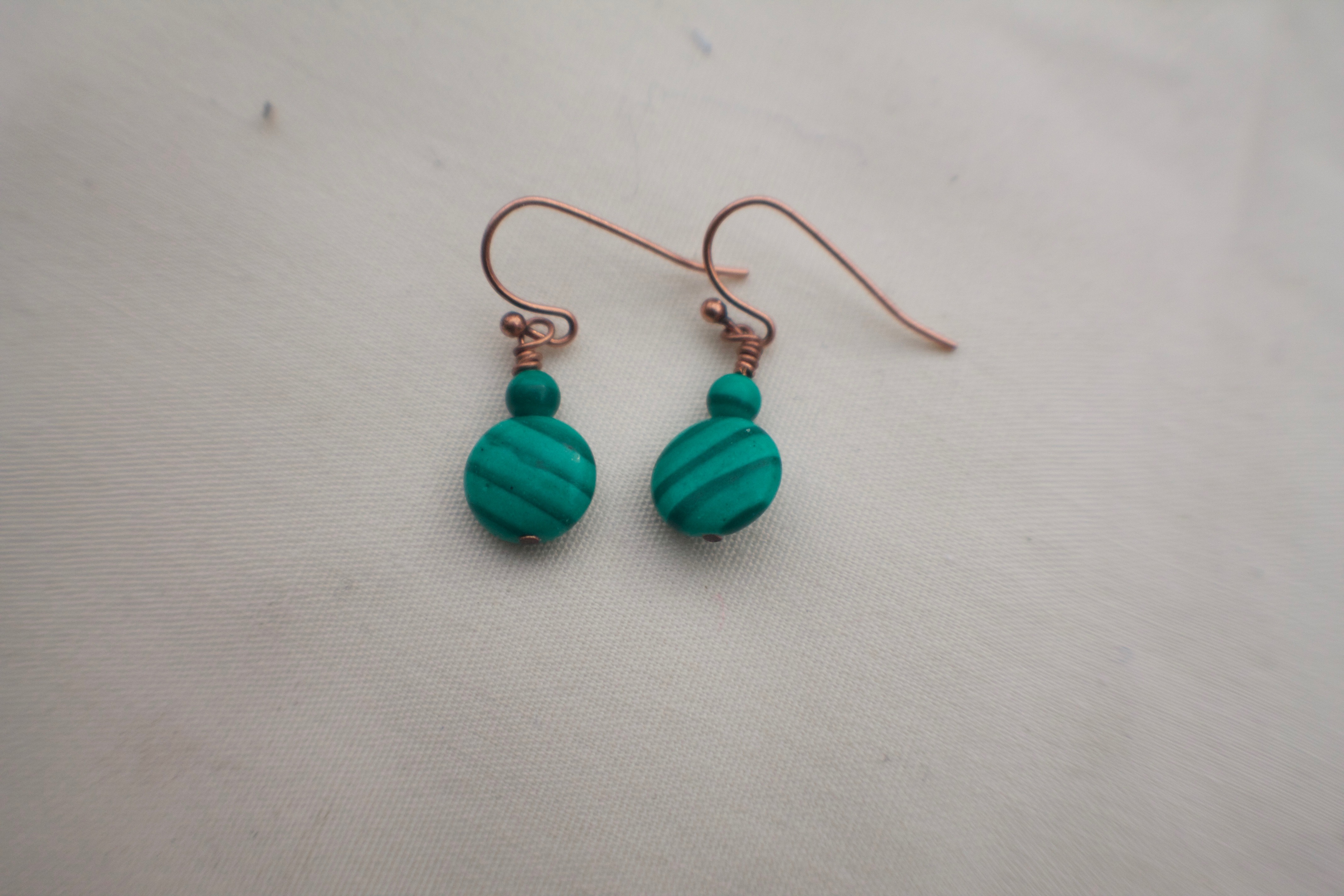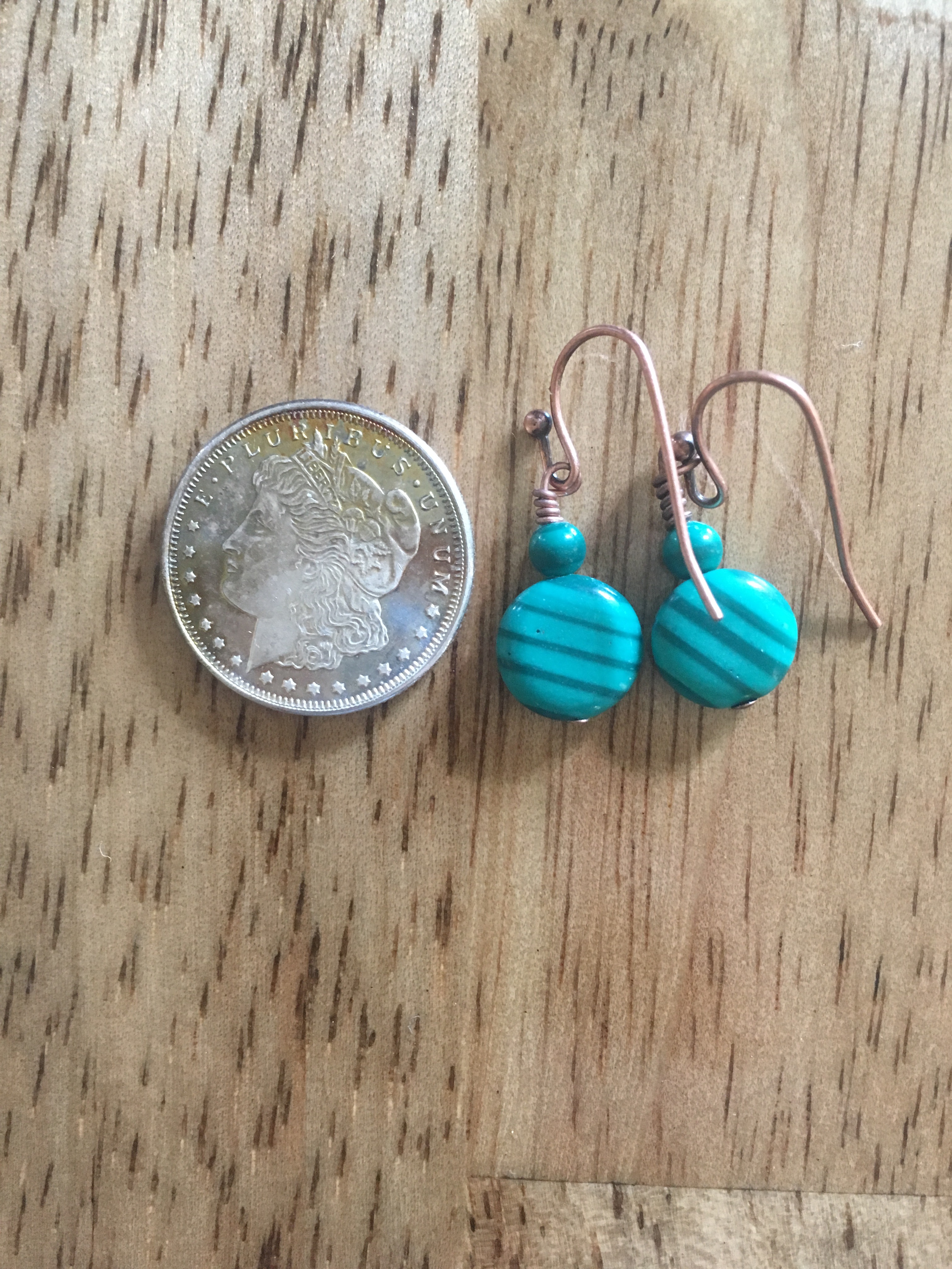 These were made of beads I bought many years back but didn't use for some reason until recently. They have a nice simple style to them with the mix of light and dark green. Complimenting it is the copper wire and ear wire I used when making it. It's length is 1 inch and its width is 3/8 inches.