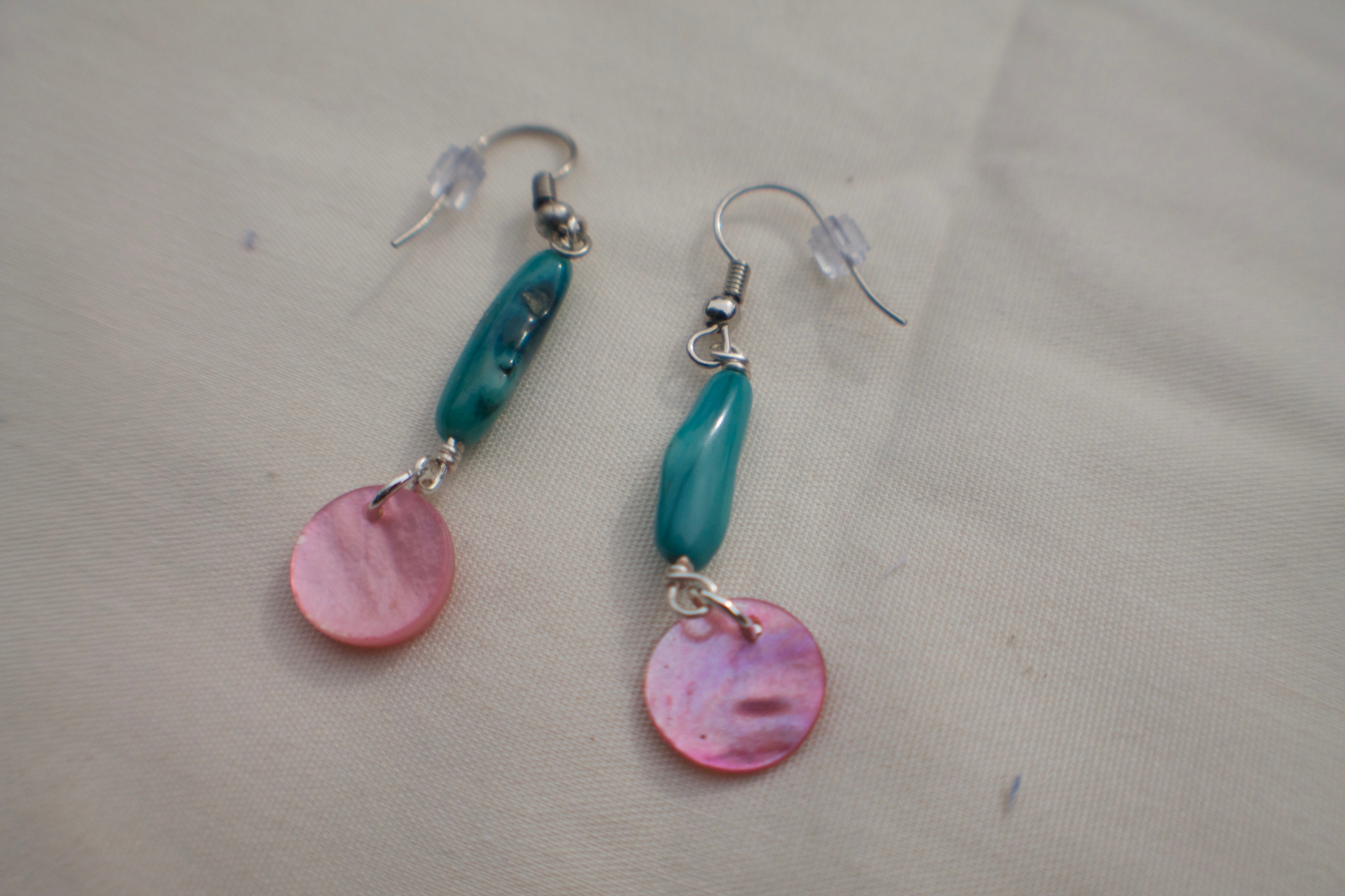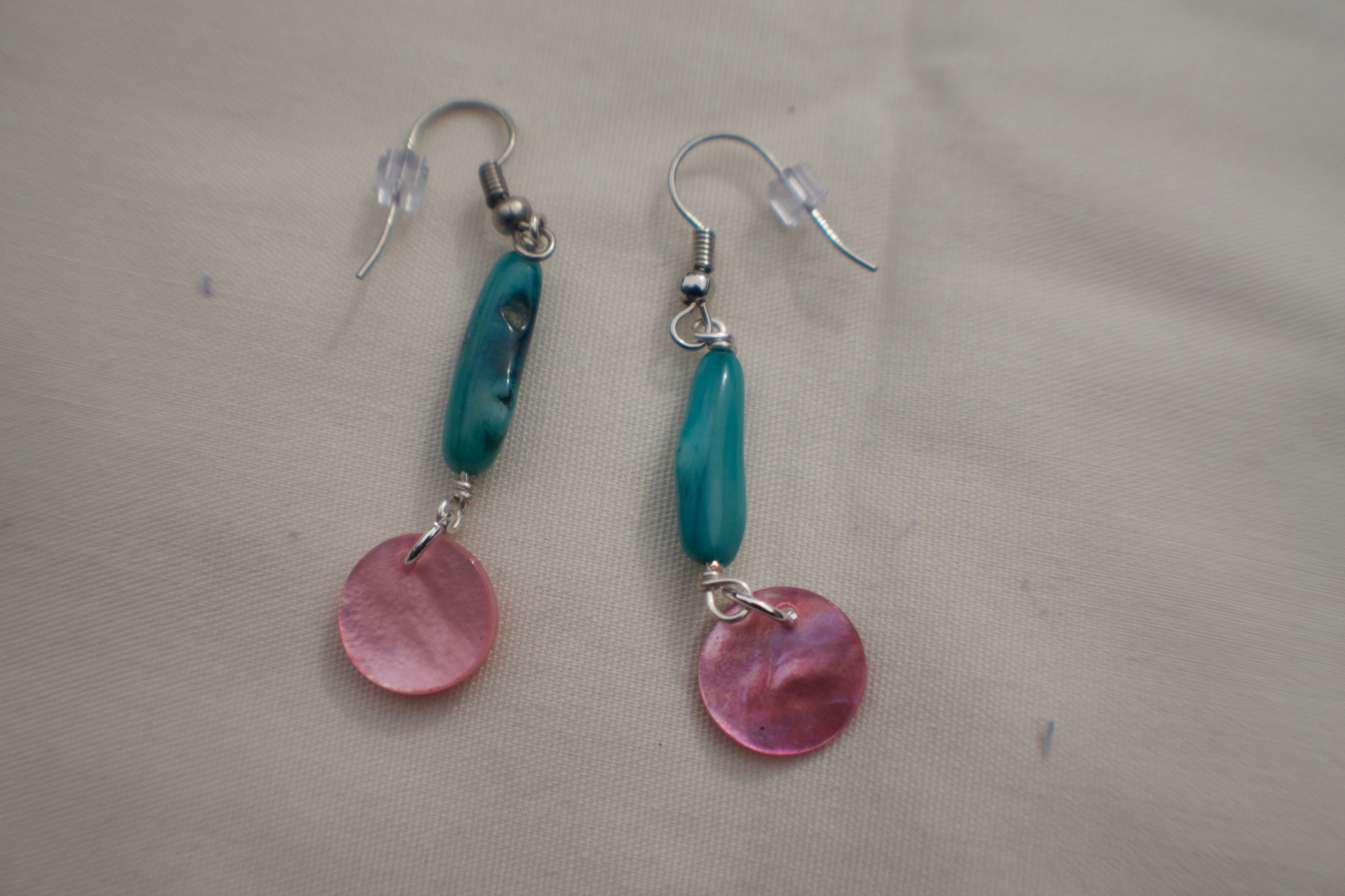 These cute little earrings are made from pink and blue shells. As far as I know, the blue ones are some type of shell. They are pretty good earring to wear during the summer time.