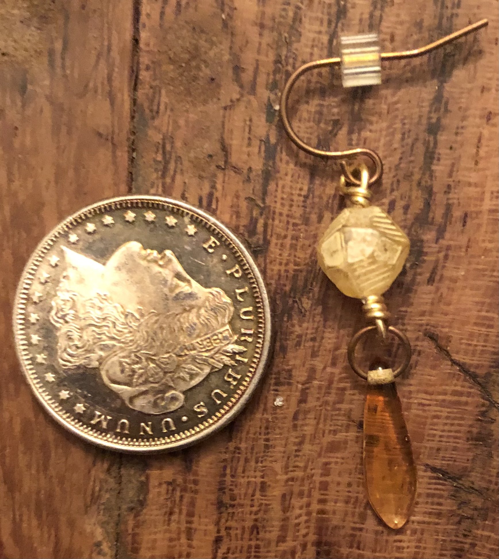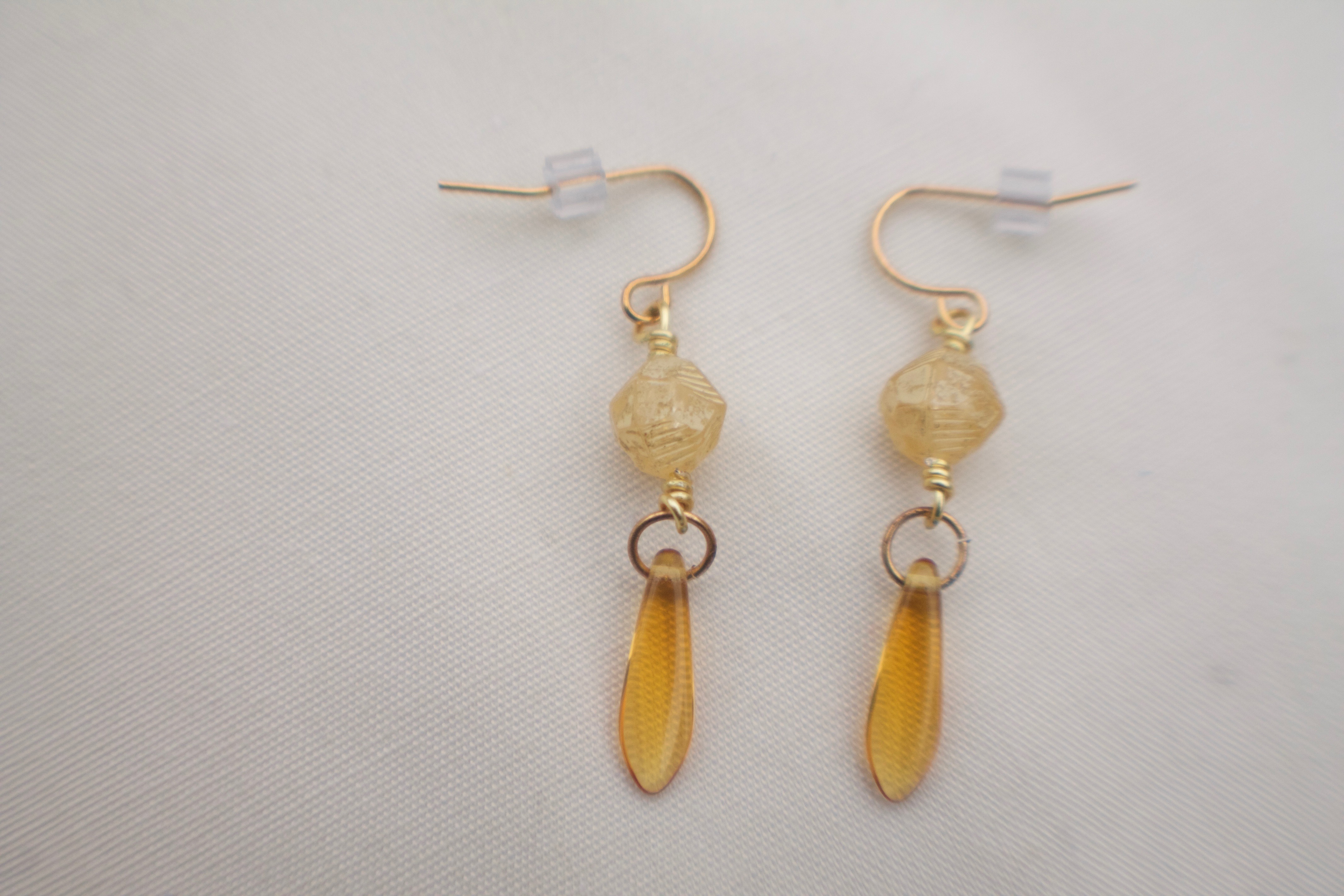 These earrings were made with tan Hexagonal beads and brownish orange dangling beads. These were fun little earrings I made.