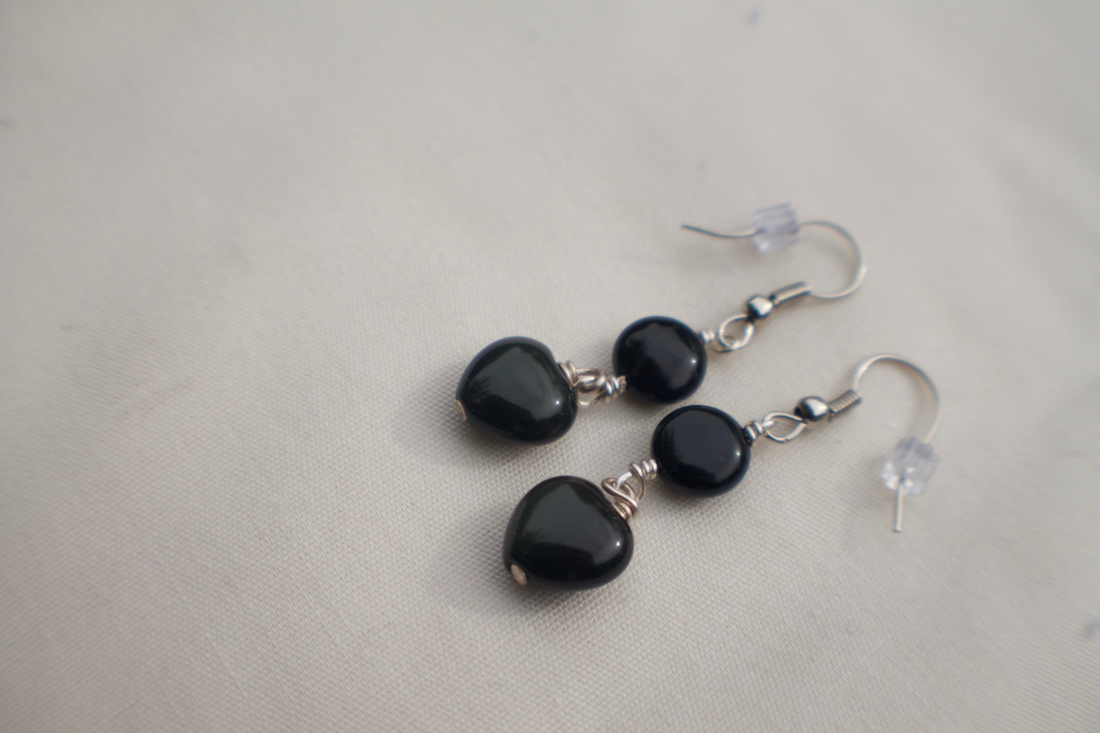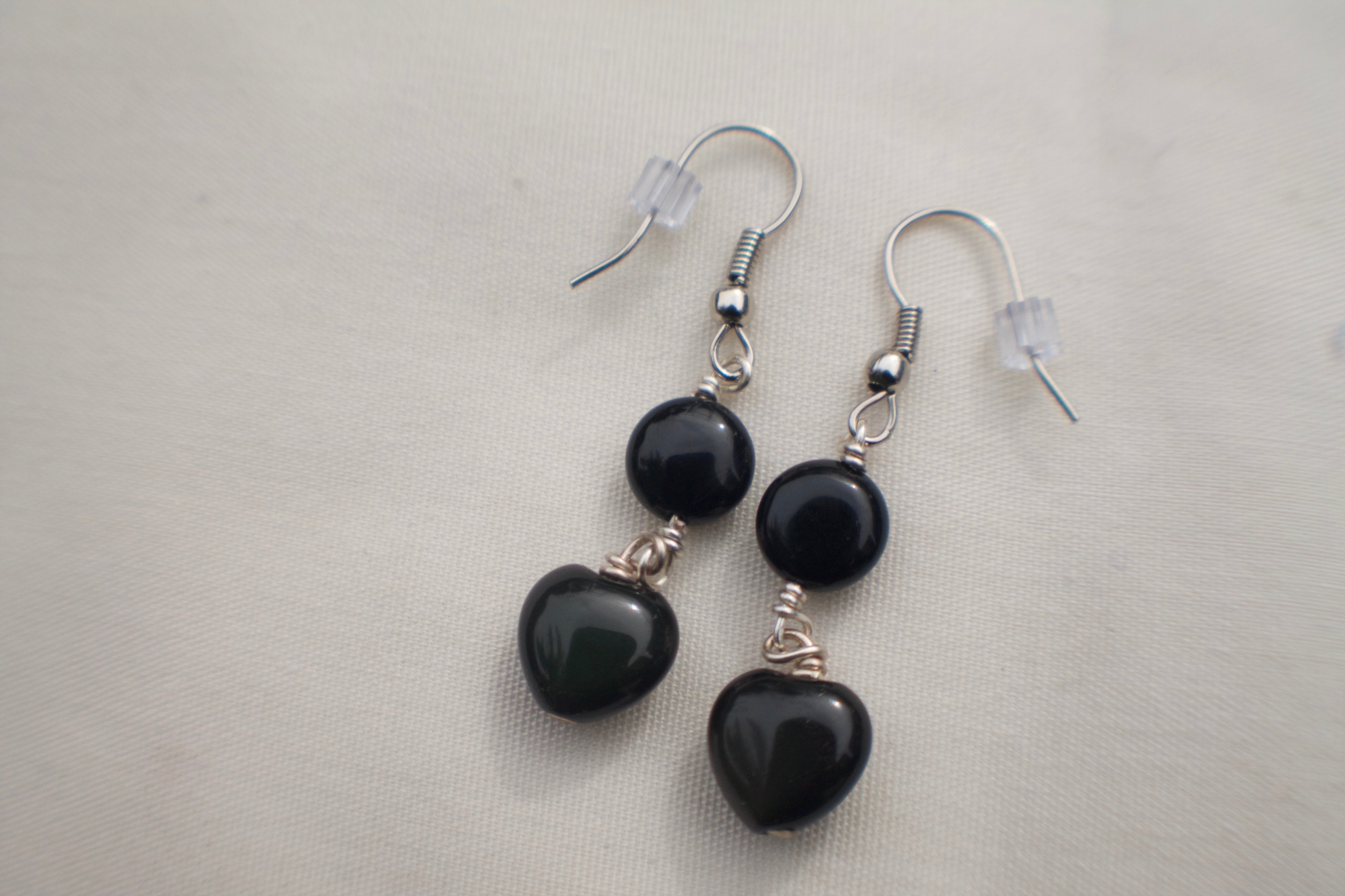 These are black stone circle and heart earrings. Both are smooth to the touch and look pretty cute together (circle and hearts are nice shapes to put together).