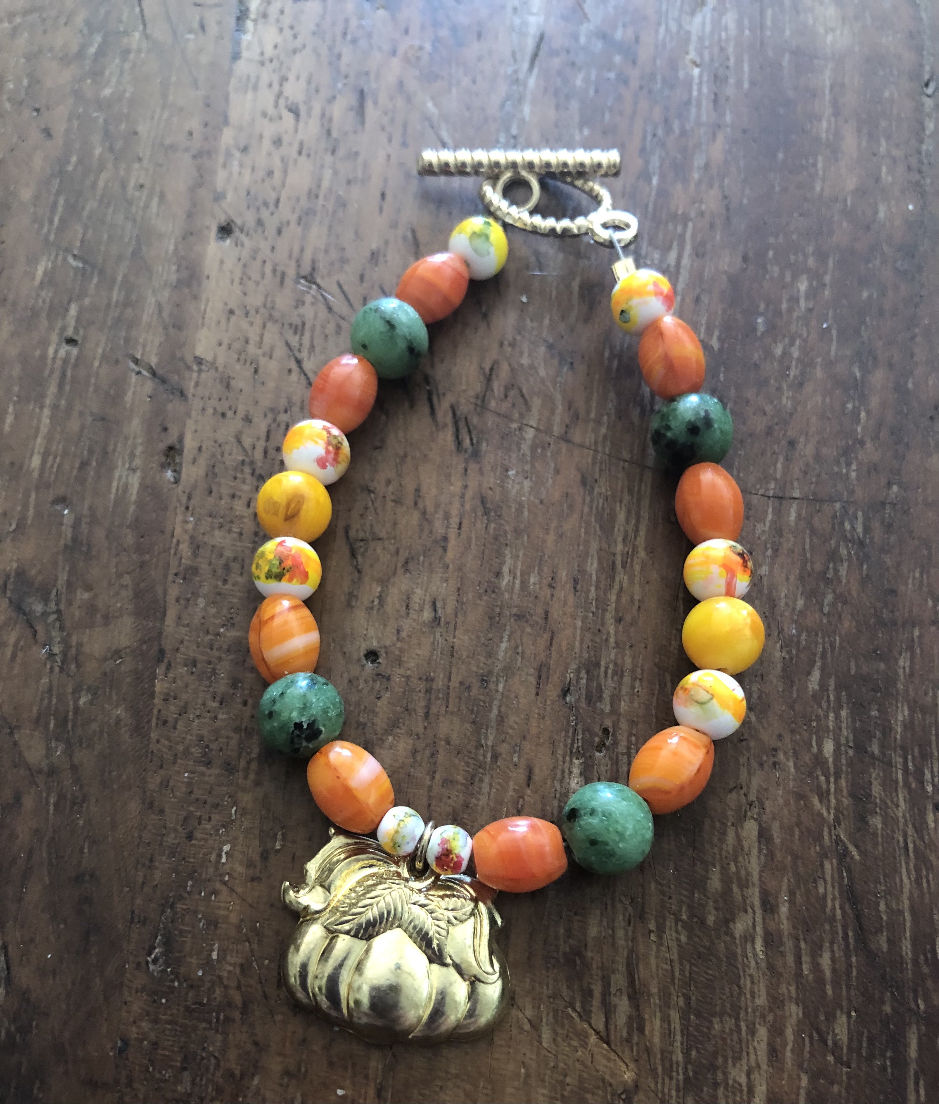 In the small bag of vintage golden colored charms I found these small pumpkin ones. I wanted the colors to give off a vintage vibe so I chose glass orange beads, little white with autumn color mix, green jade beads, and yellow shell beads.