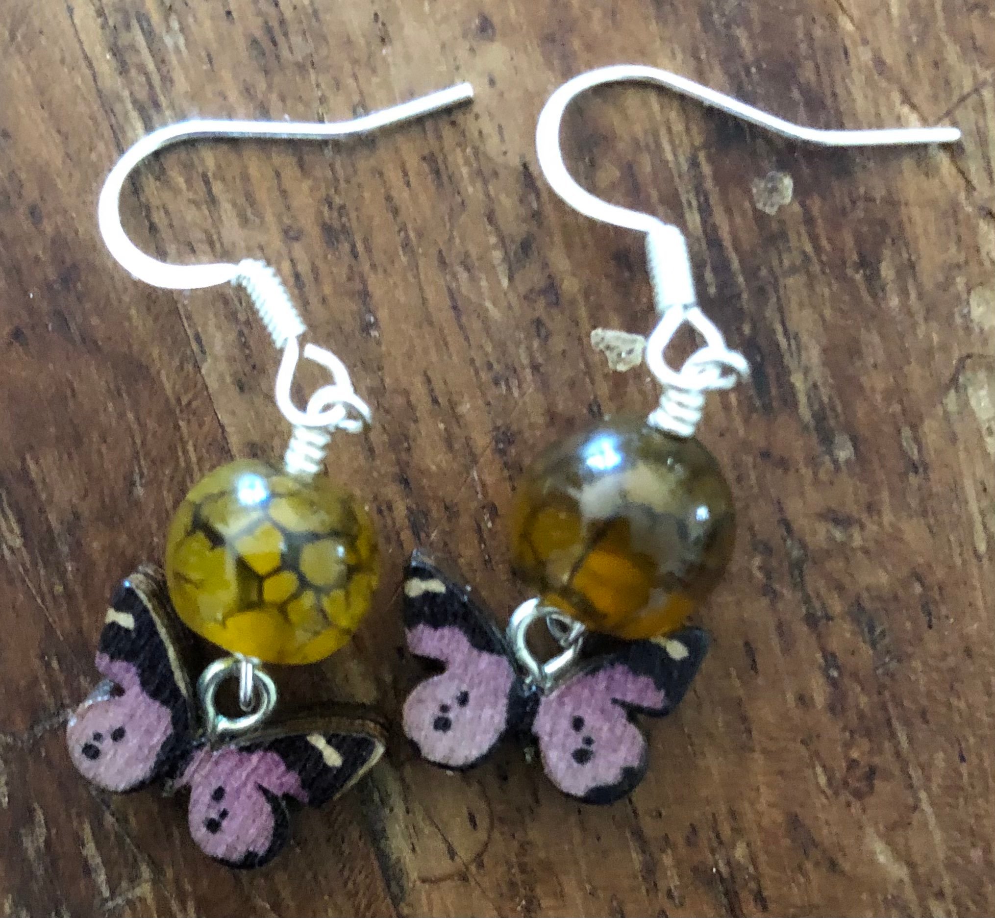 Little purple wood butterfly charms wire wrapped with orange greenish black vein agate stone beads.