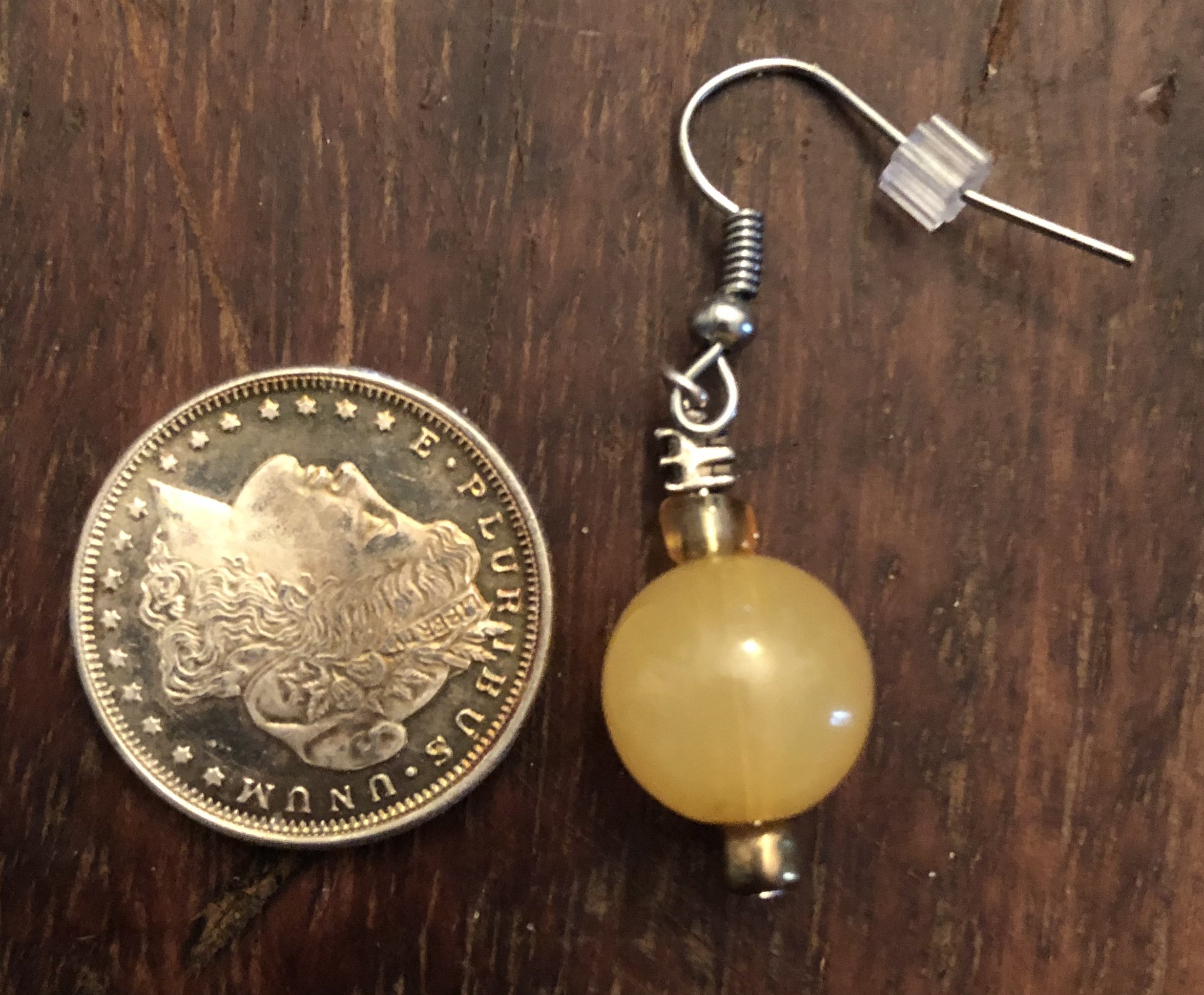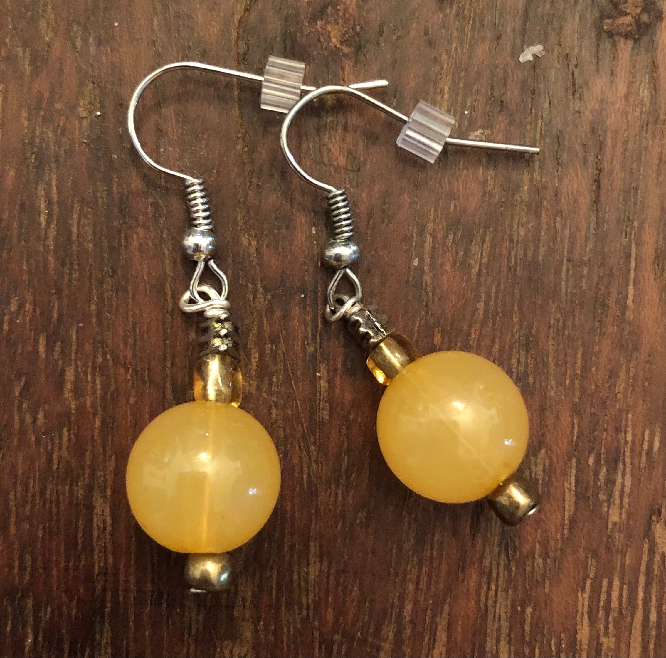 This was originally once one really long earring that I got in a pencil box filled with various beads. I found a second yellow round bead and decided to use the parts to make it into a pair of earrings. Earrings that are perfect for autumn if you want something more subtle.