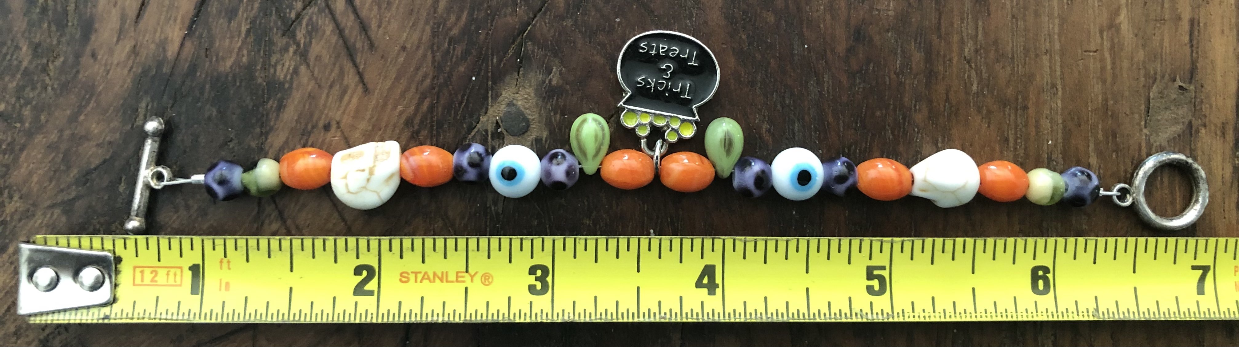 When I went to an antique event someone was selling a bracelet with a lot of different Halloween charms on it. So I decided to get the bracelet and take many of the charms off to use to make into different bracelets. This one I wanted to add beads that really bring out the cauldron from eyeball beads to skull beads. Using colors such as orange, purple, green, and black.