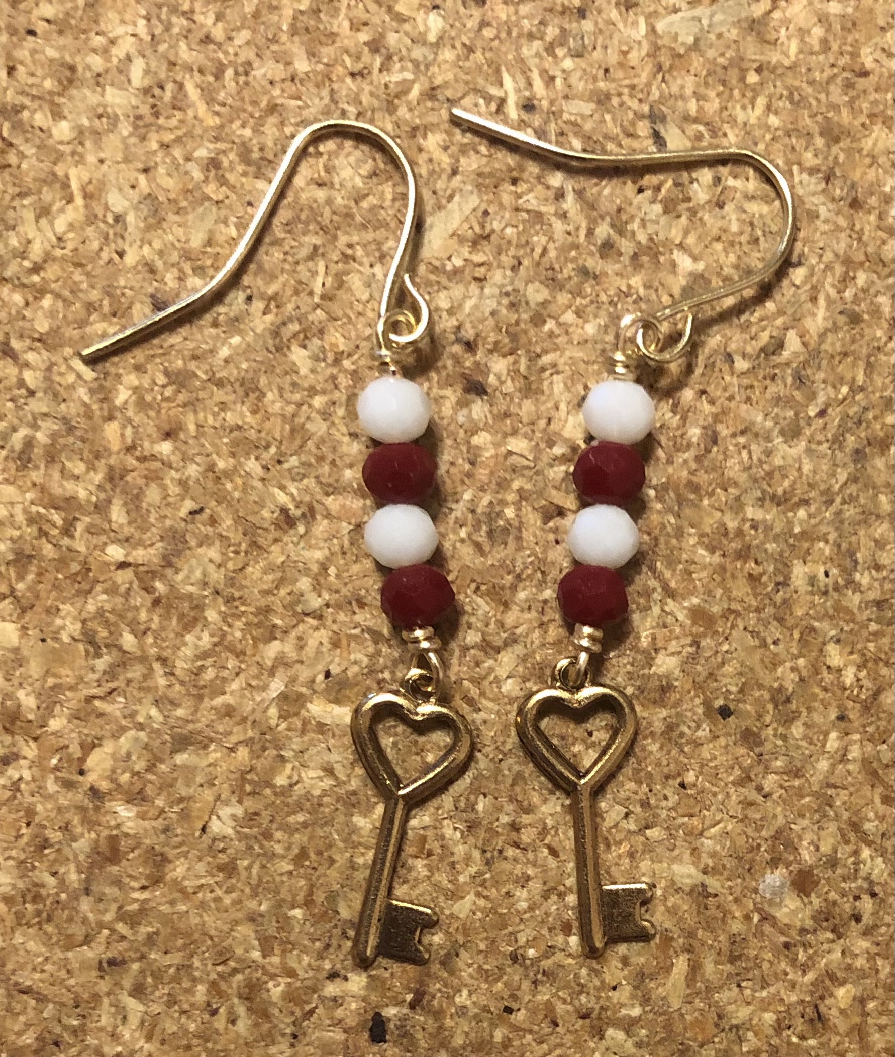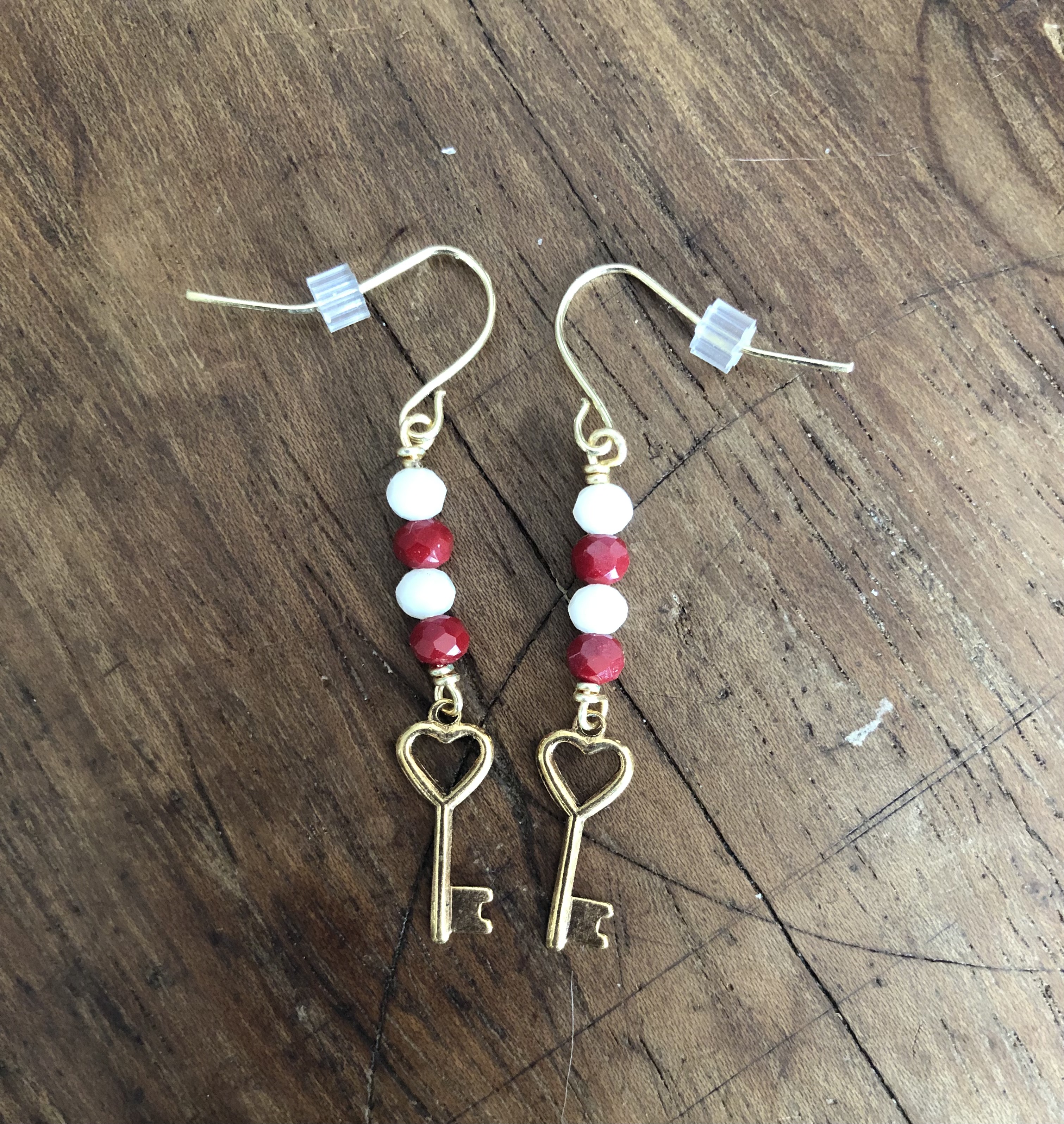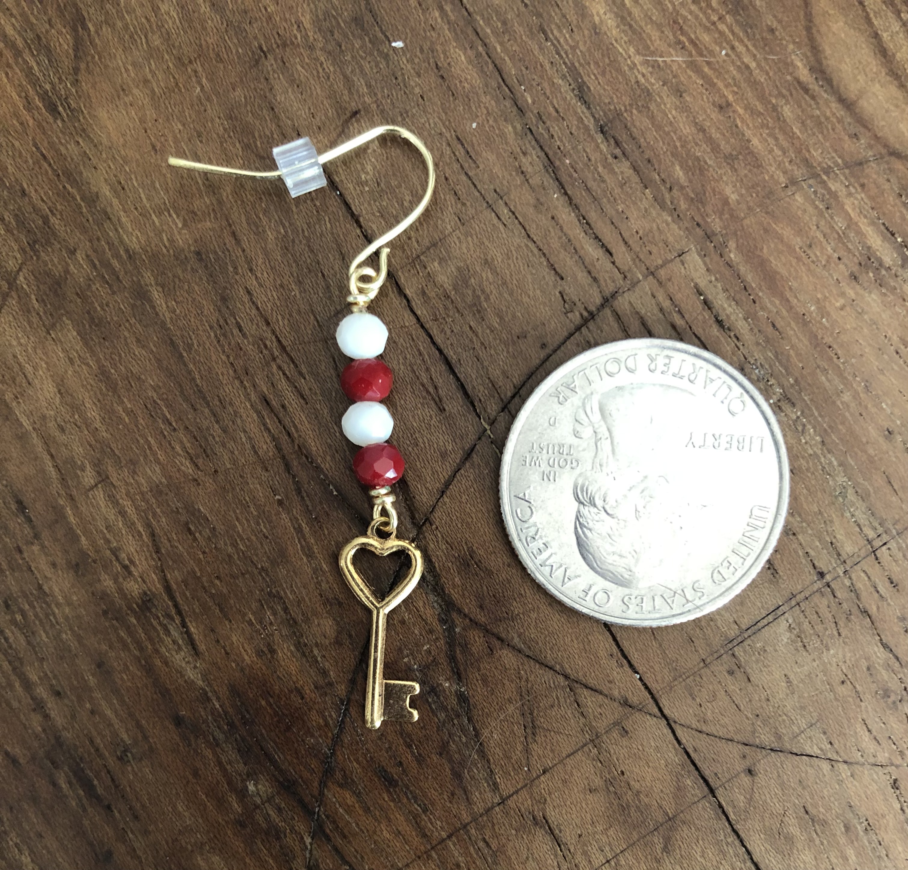 Tiny little golden colored heart key charms with faceted red and white beads wire wrapped together.