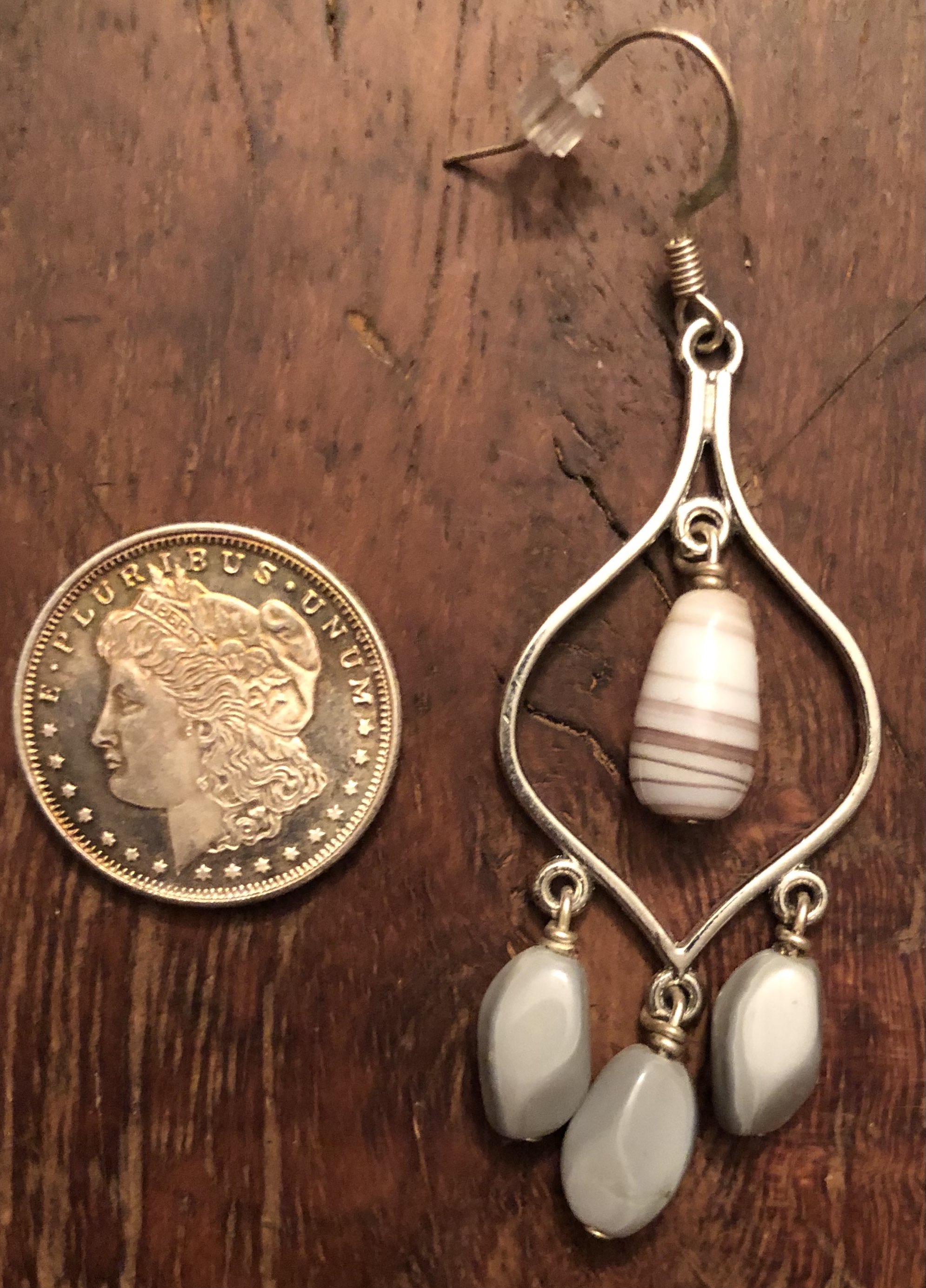 Chandelier earrings with white lavender swirl beads and grey beads.