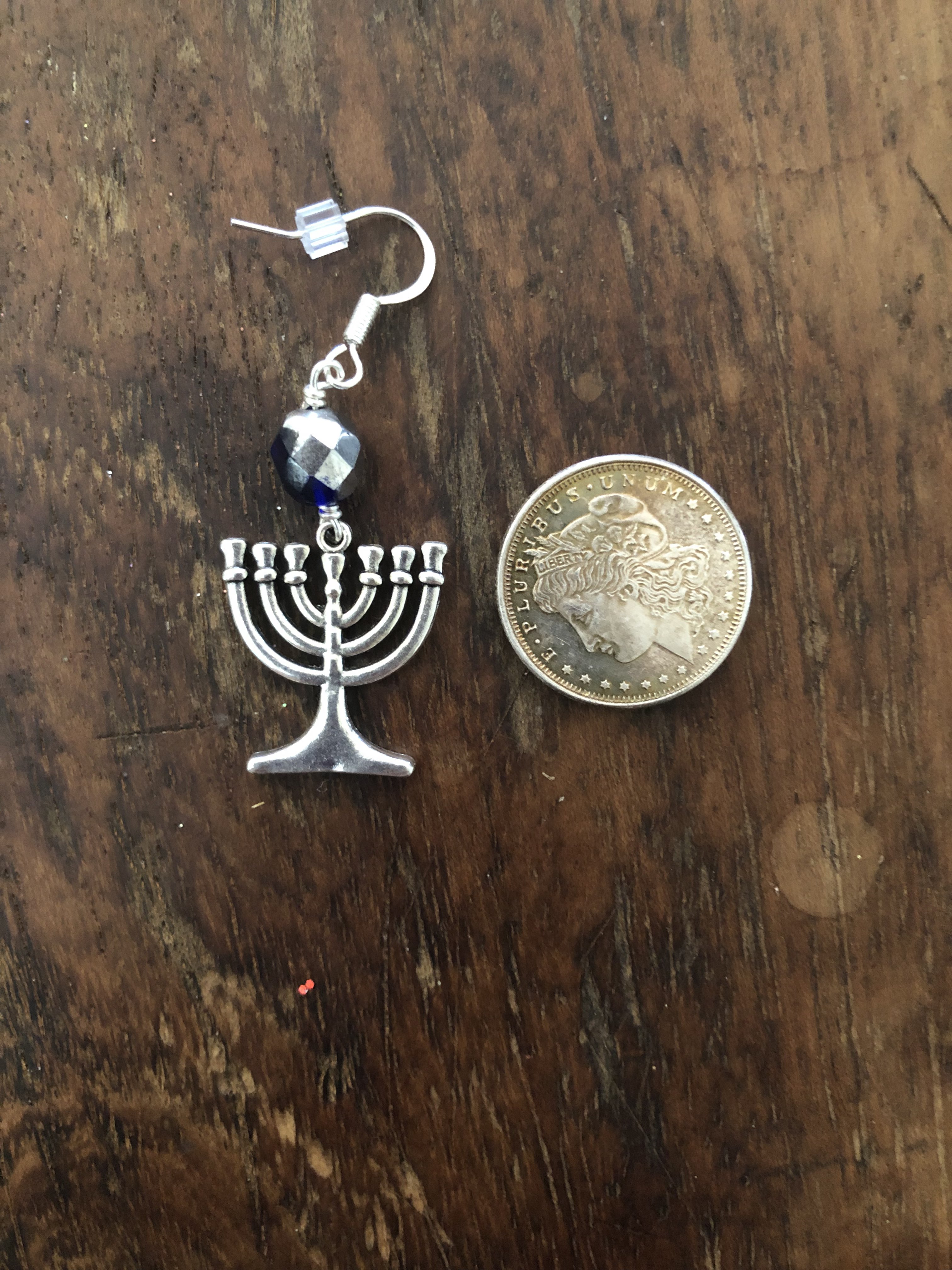 These earrings are made with a variety of different dark blue beads wire wrapped to a menorah charm. I thought it would be nice to make some Hanukkah themed earrings. There are three variants I made such as the blue bead with silver pattern version, plain blue beads version, and the blue faceted bead with silver shine version. Eventually in 2023 I made blue stone beads wire wrapped to menorah earrings.