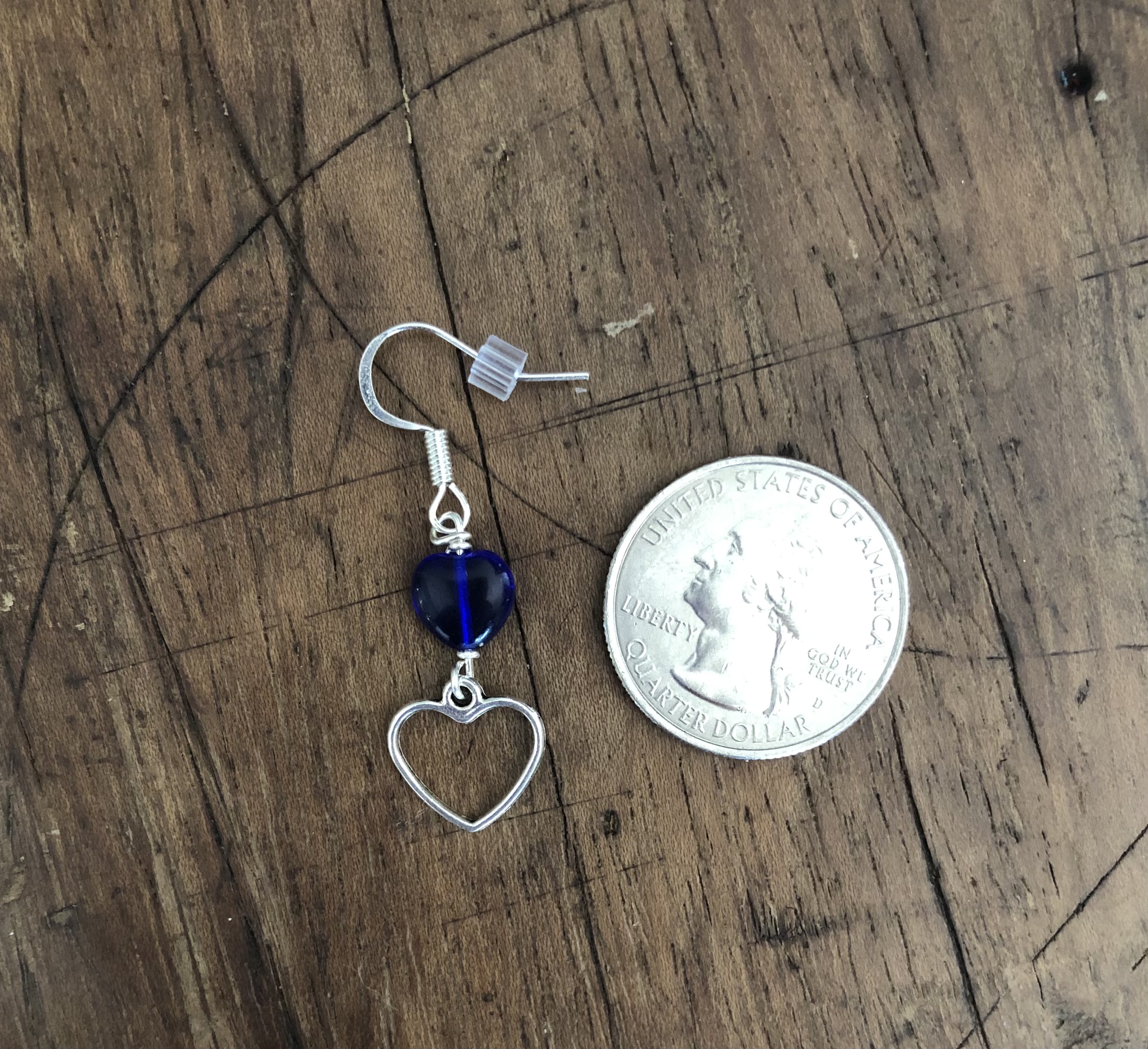 Small dark blue heart beads wire wrapped to small silver colored heart charms.