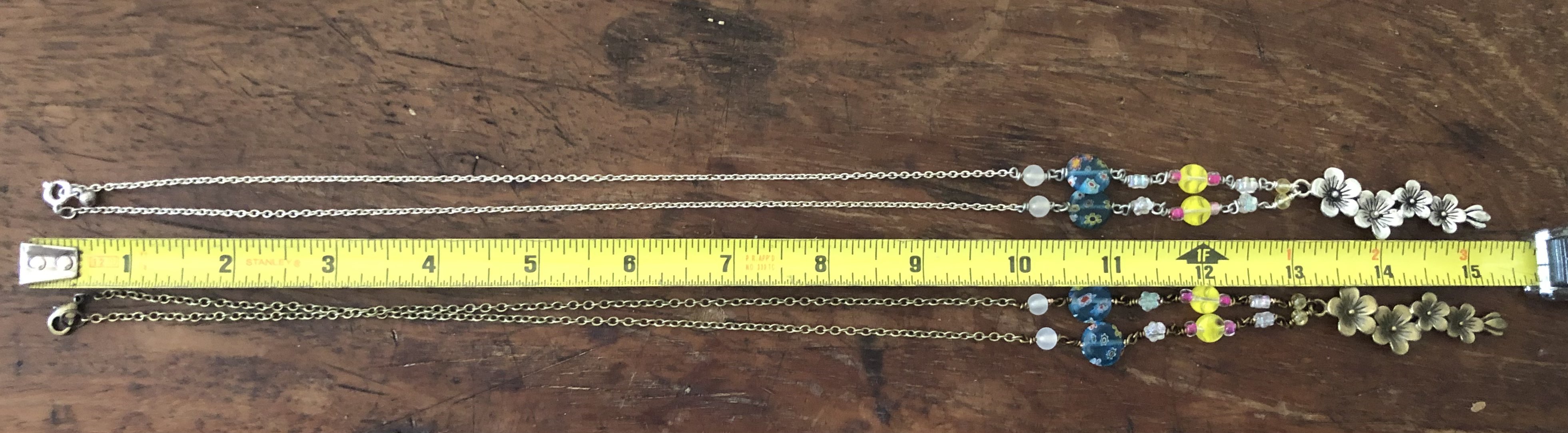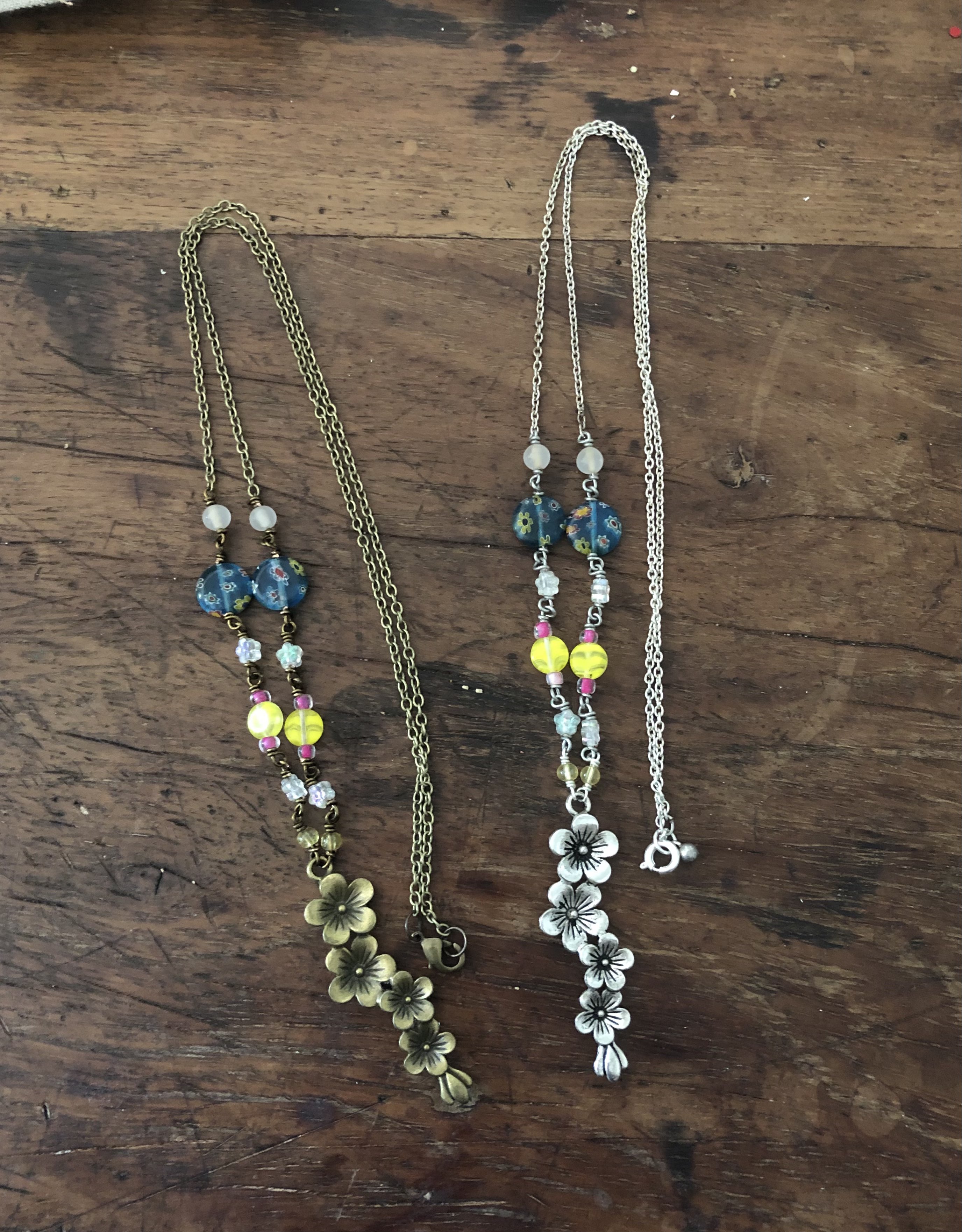 Two years ago I bought these two flowers pendants where one was silver colored and the other was brass colored. I chose to use light yellow, magenta, blue floral, purple, foggy white flower, and foggy white round beads to emphasize the spring theme.