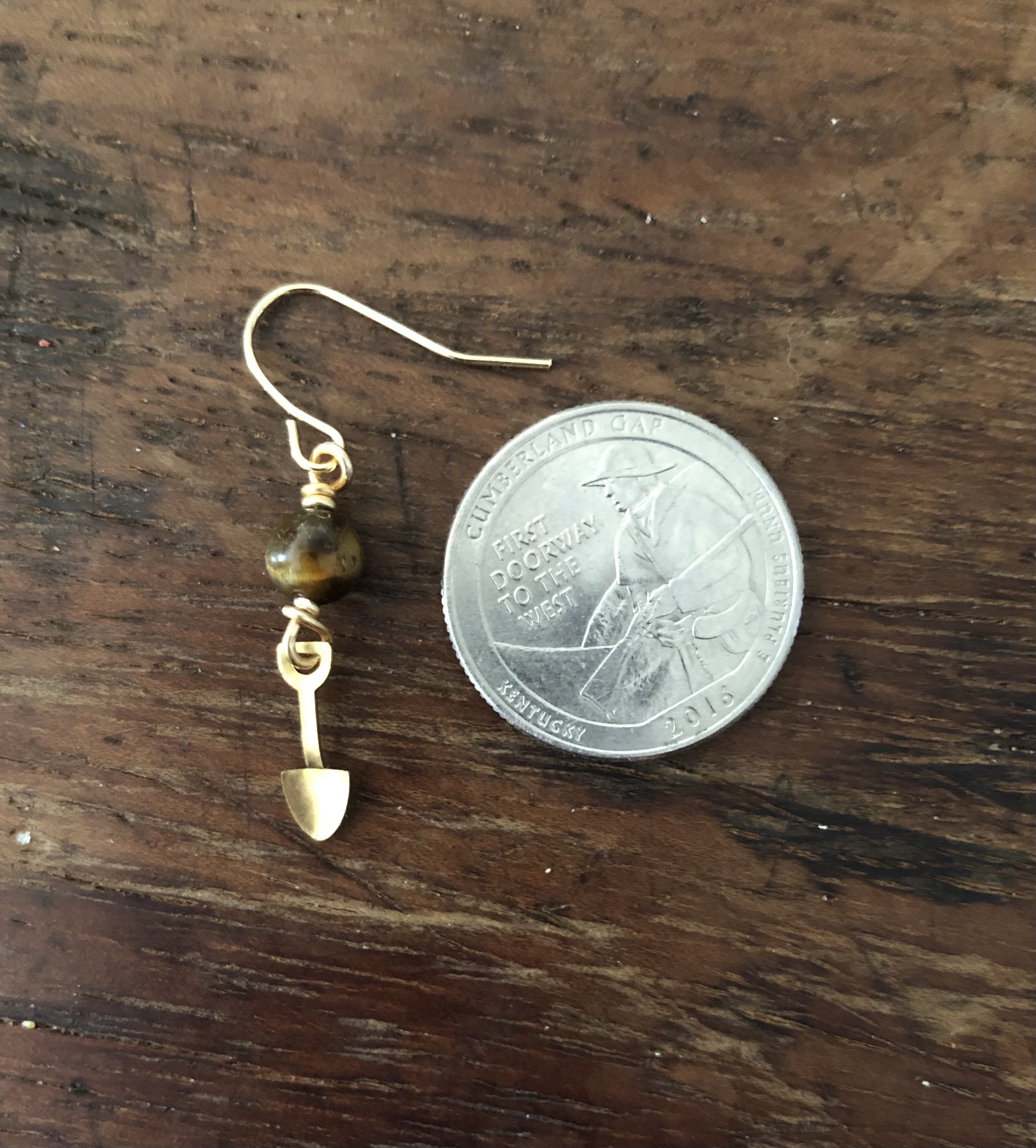 Last year I got these small golden colored shovel charms. I was trying to think what beads I wanted to use with them since I thought a brown color would work. I went with brown tigers eye beads.