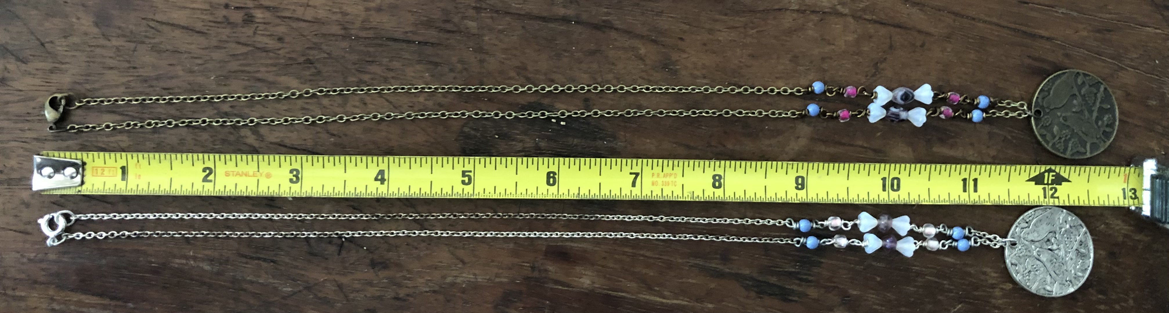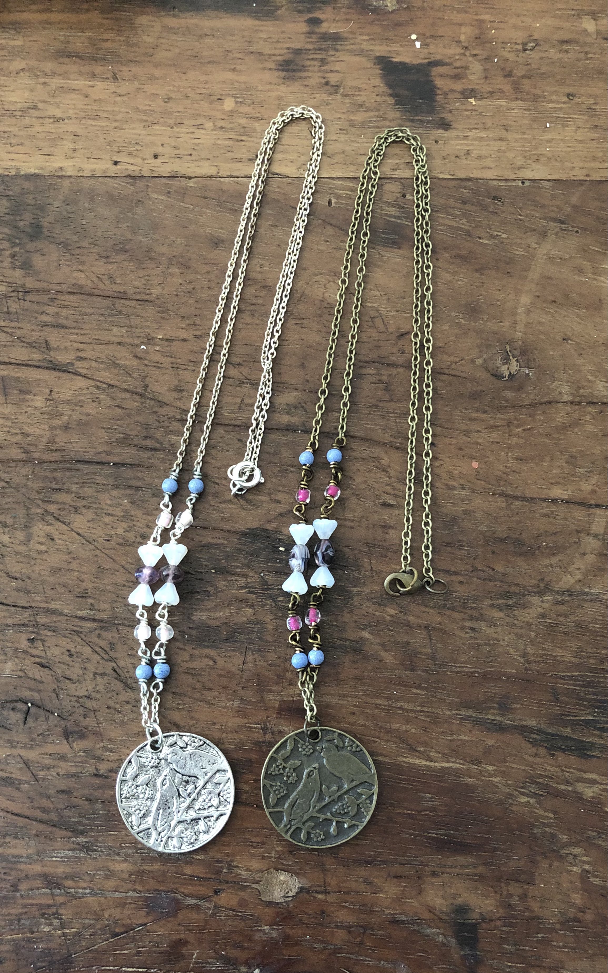 Both pendants feature birds on tree branches. The necklaces are similar in the beads they have with both having different type of purple beads. One is silver colored and the other is brass colored.