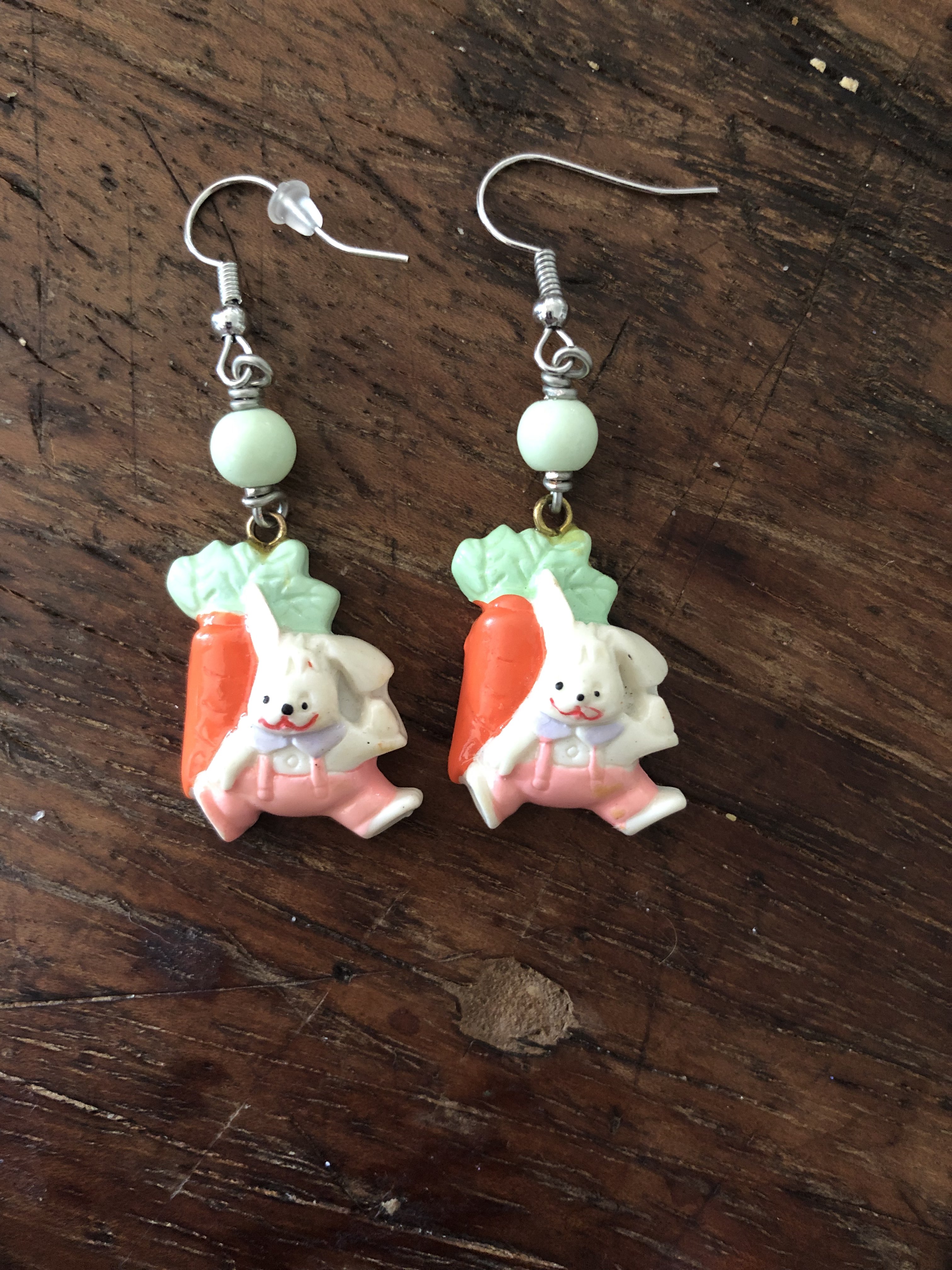 Last year I went to an antique craft fair and I found a booth that was selling some vintage earrings. One of them was these vintage Easter earrings. It was just the bunny with carrot charm on gold colored earring hooks. I thought about refurbishing it and did such. I decided to wire wrap mint glass beads onto silver plated earring hooks.