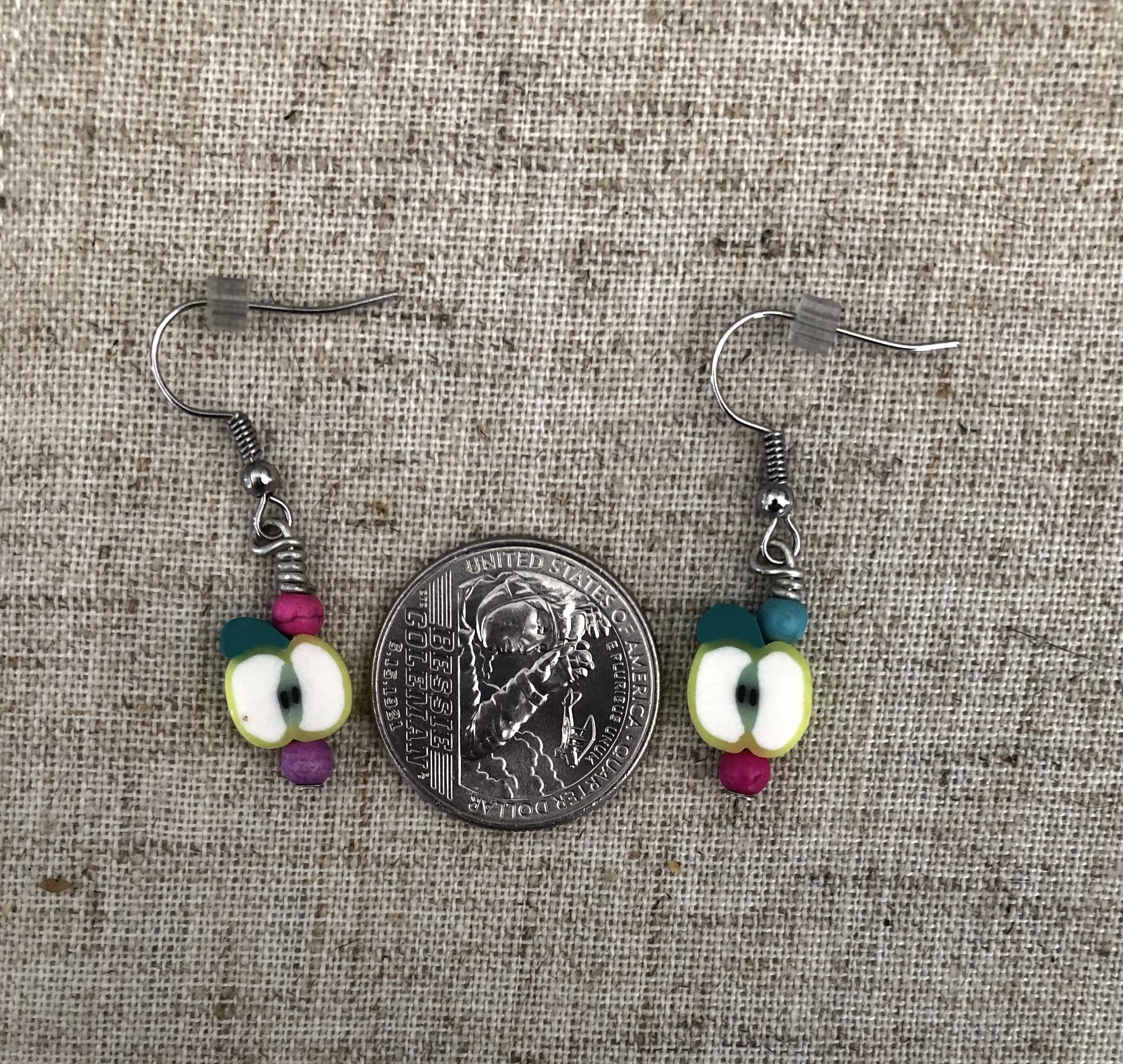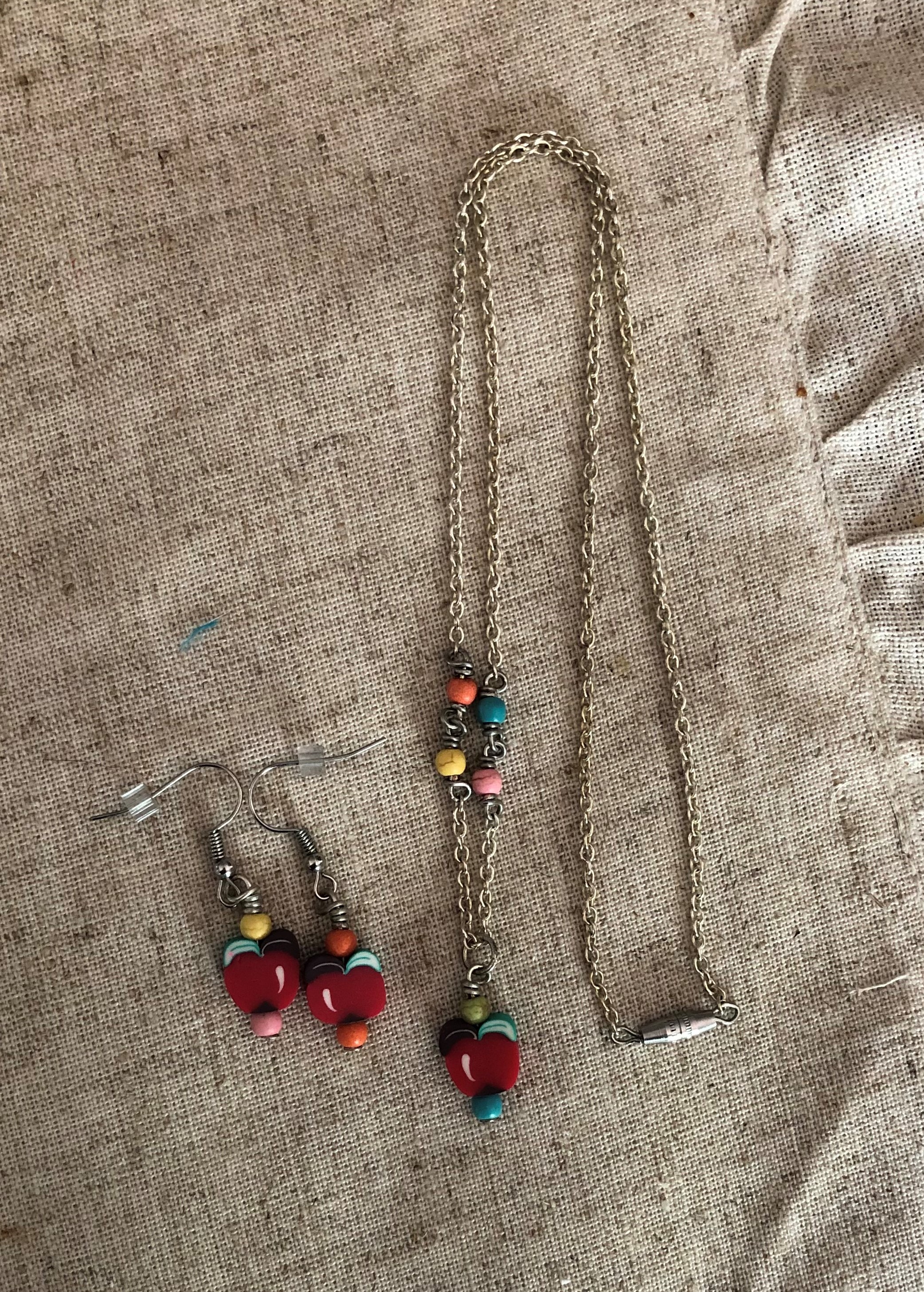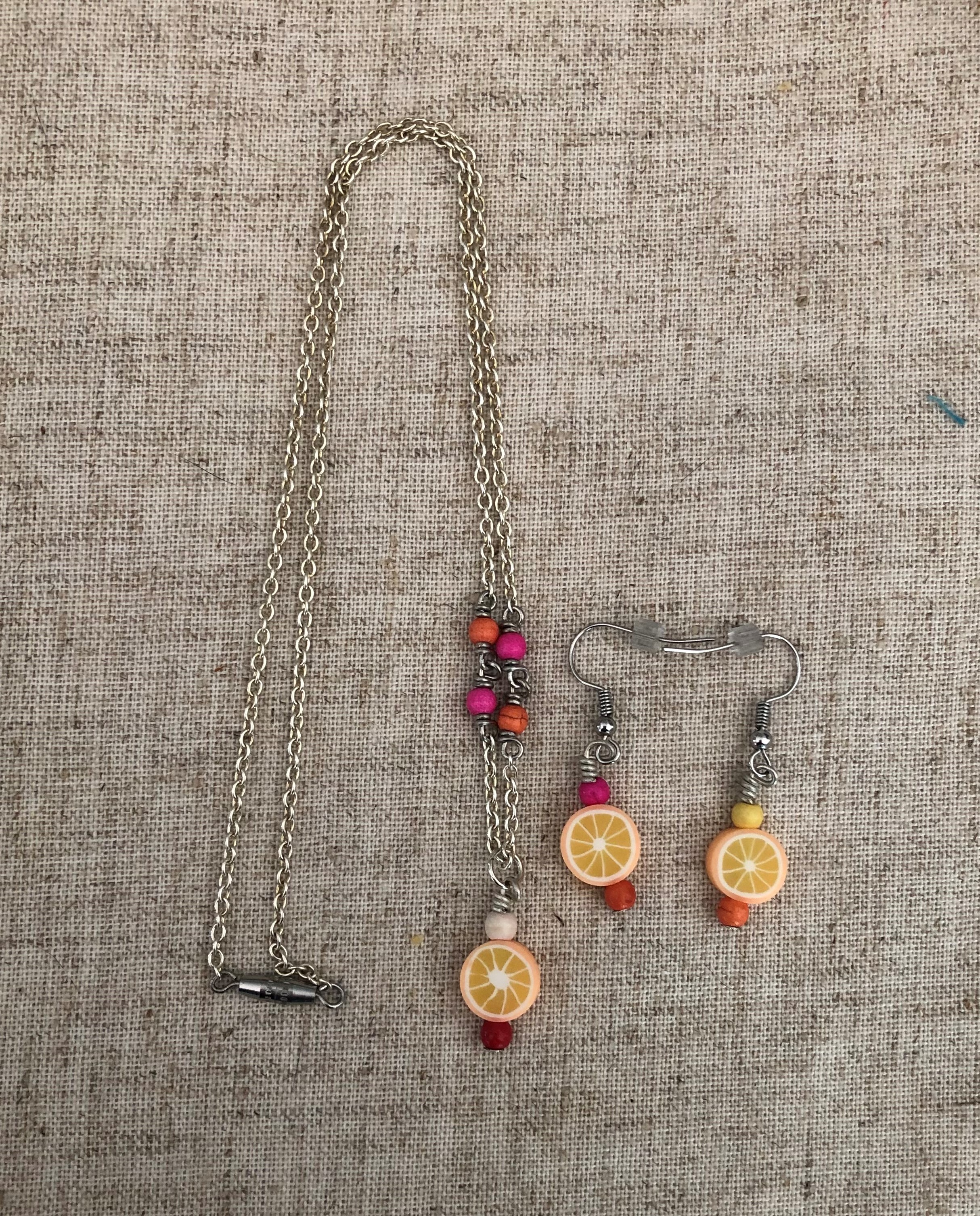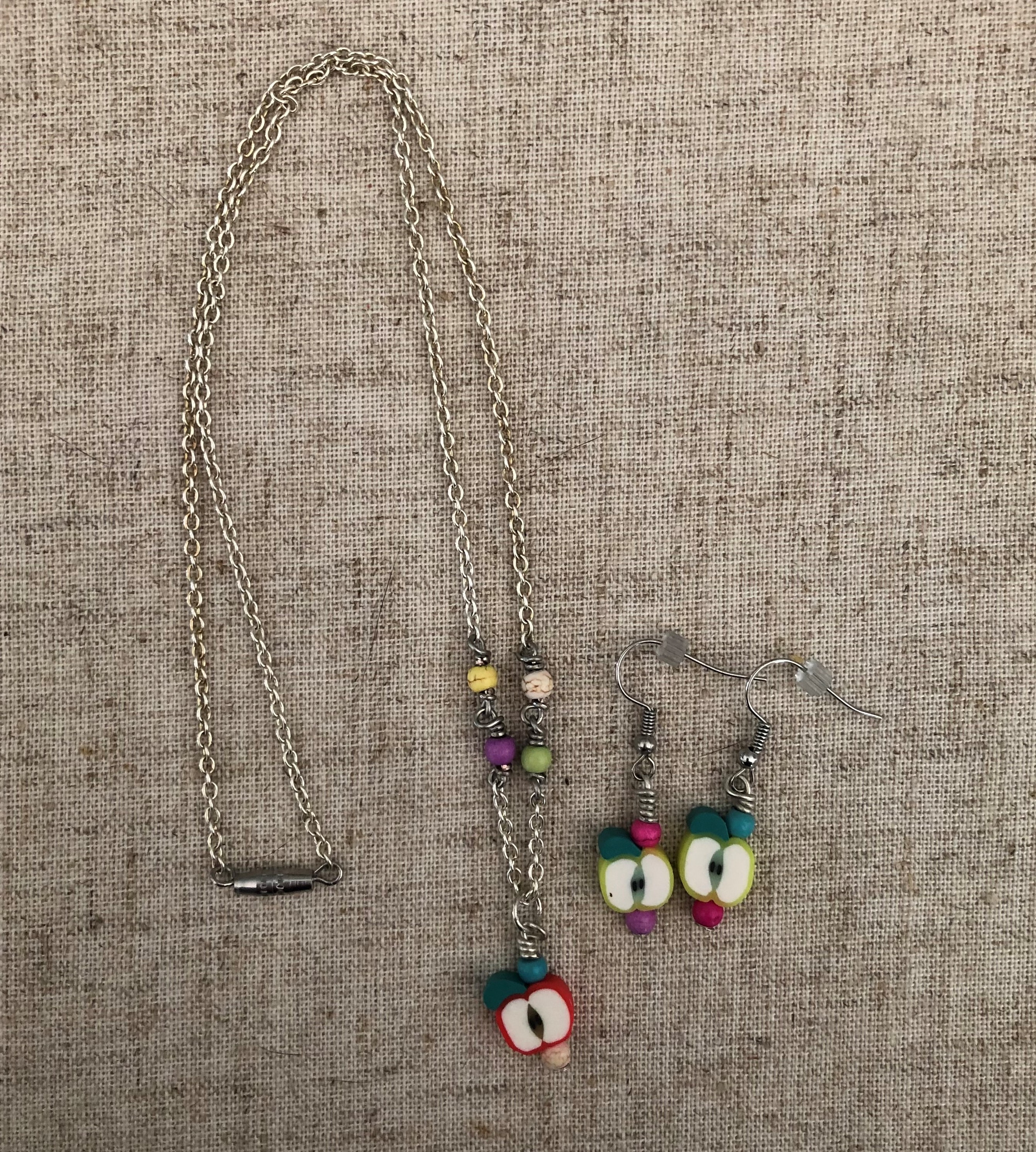 A necklace earring set that features fruit and small dyed howlite beads. I made three different variants of the set, red apples, orange slices, and apple slices.
