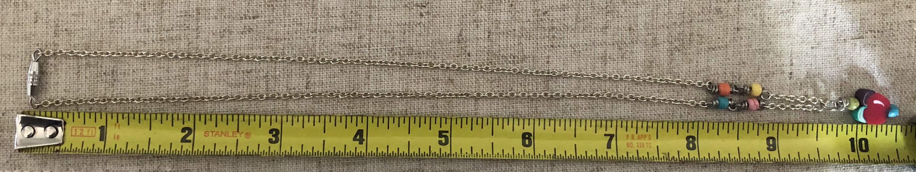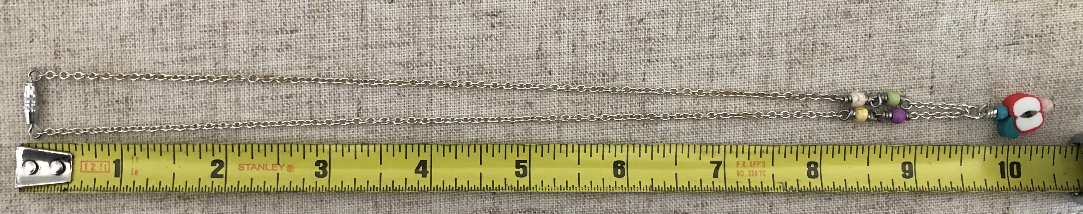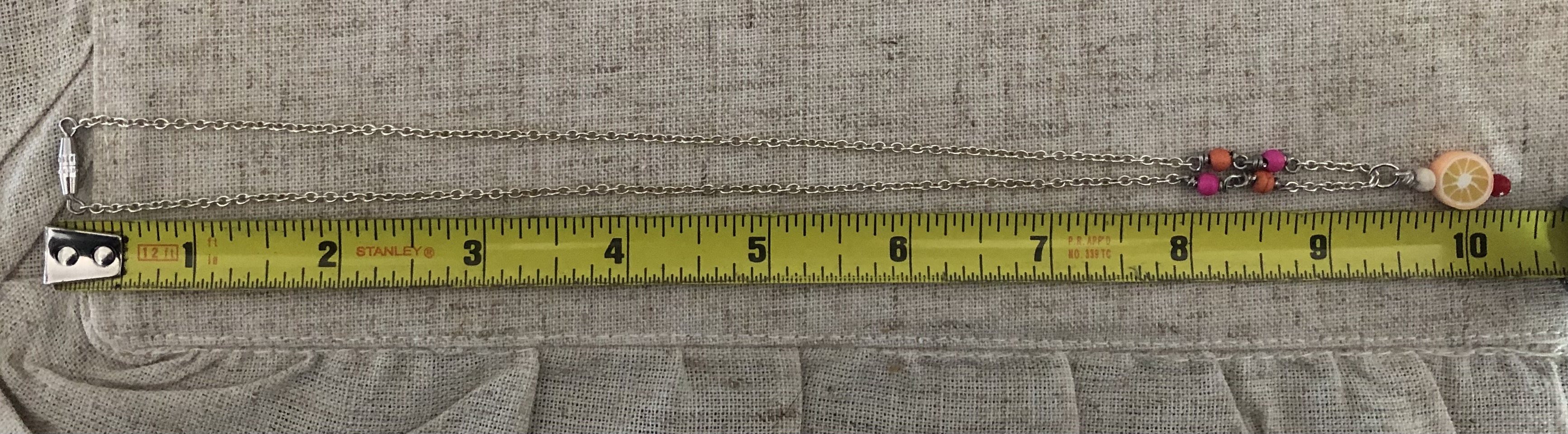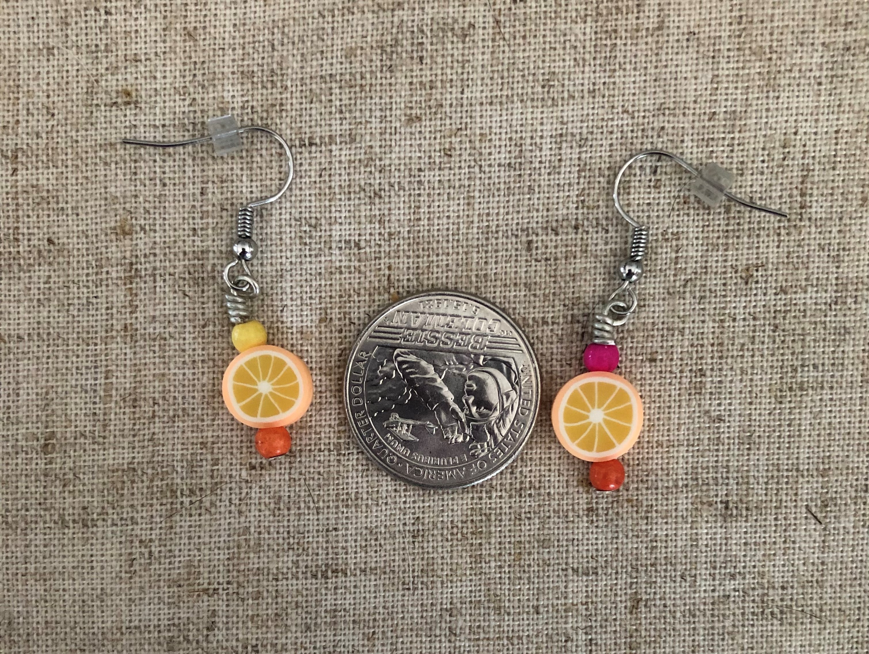 A necklace earring set that features fruit and small dyed howlite beads. I made three different variants of the set, red apples, orange slices, and apple slices.