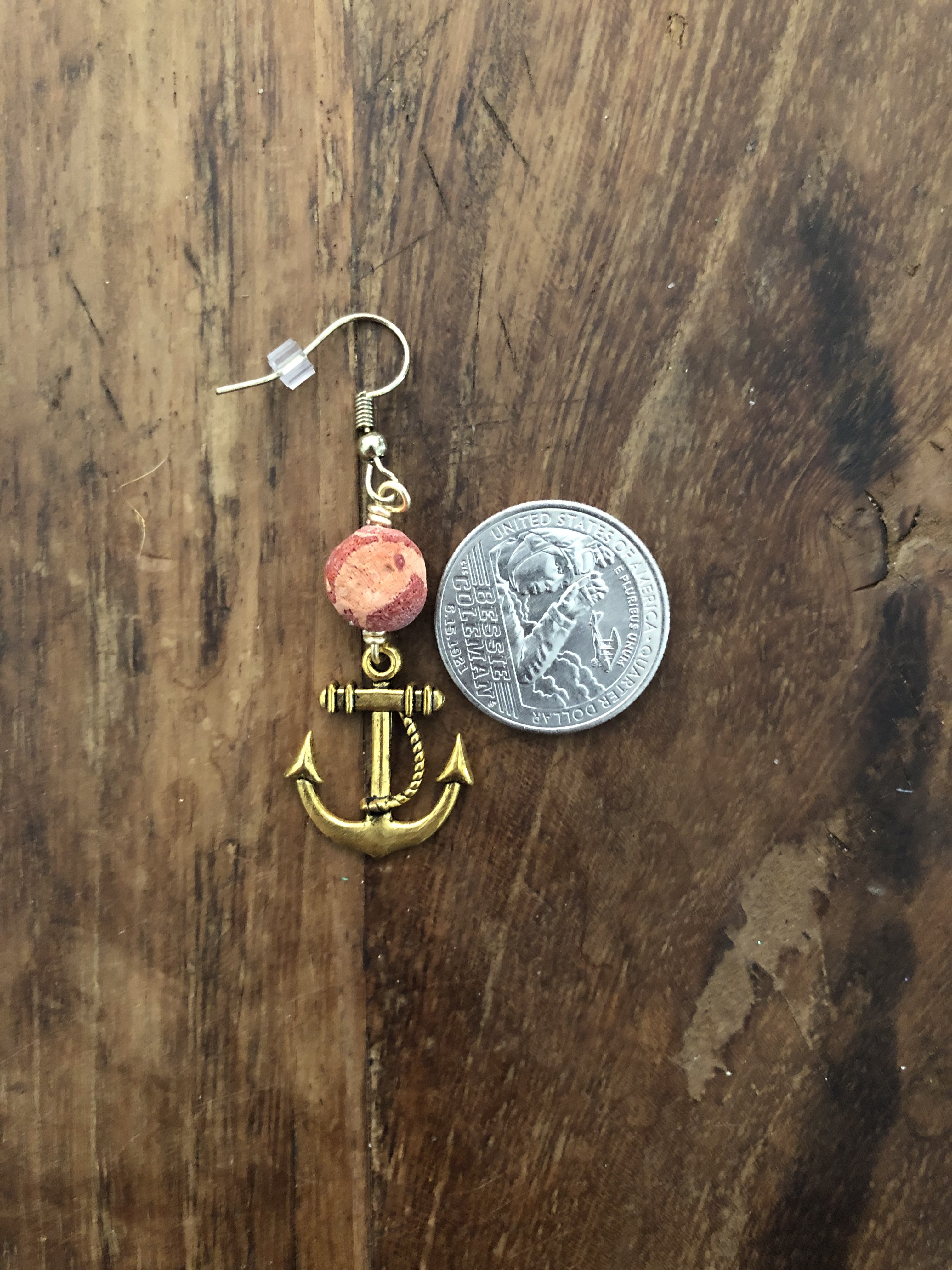 These earrings are made with golden colored metal roped anchor charms wire wrapped with red sponge coral beads. The more redish pink coral beads compliment the gold color. That and I thought choosing that color would be a nice change from the usual blues and greens I tend to go for when I make summer themed jewelry.