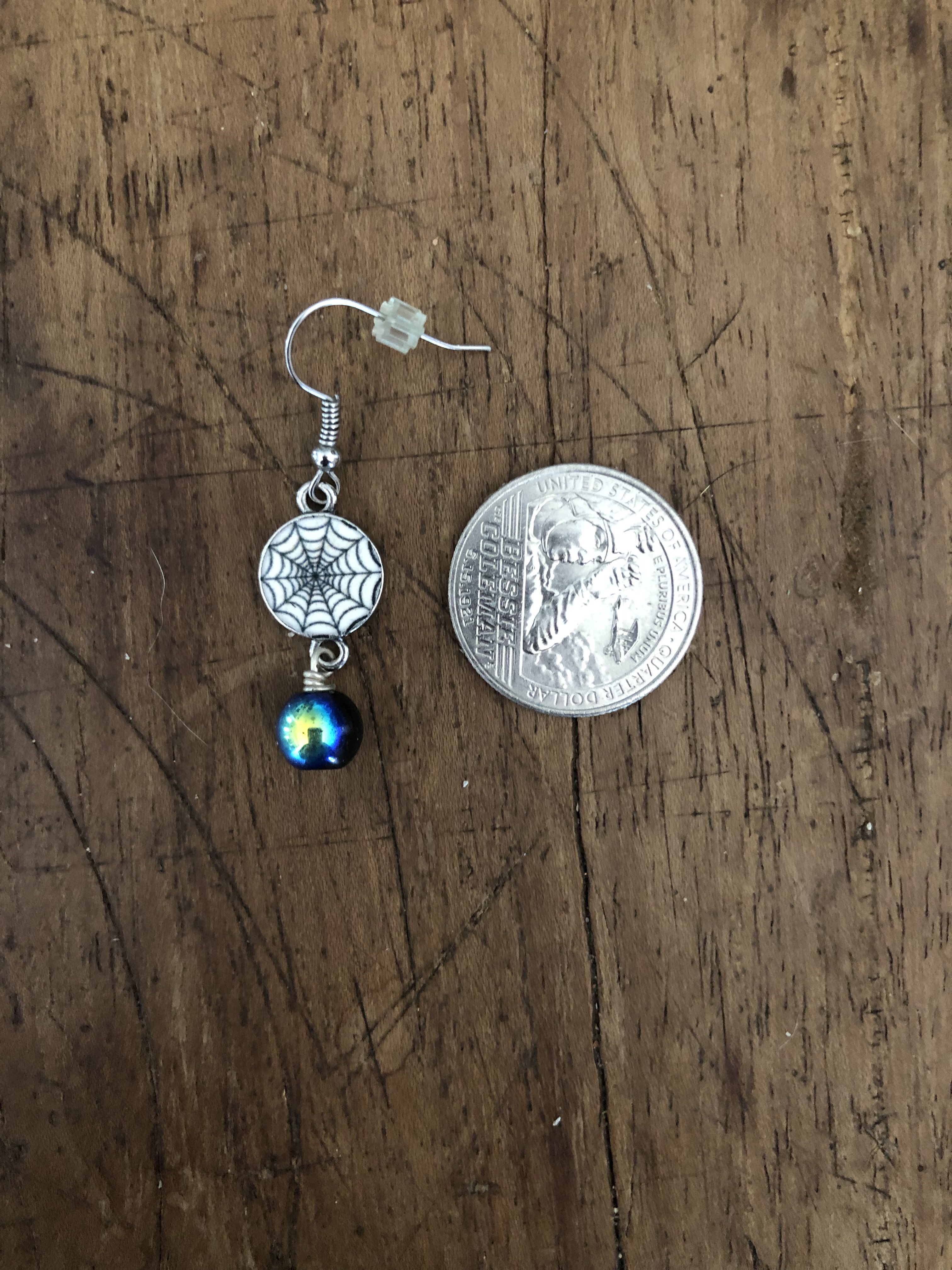 Metal charms depicting either a spider or a cobweb with a black glass bead wire wrapped dangling beneath. Said black bead shines yellows to blues to purples. These spooky earrings are perfect for the Halloween season!