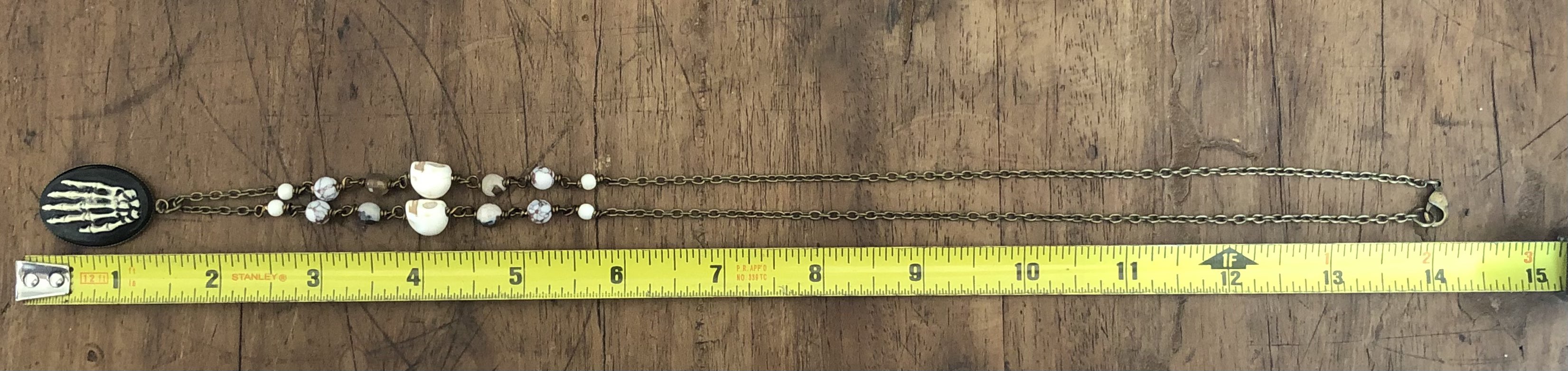 The skeleton hand portrait necklace is made with small round bone beads, white and brown stone beads, agate faceted beads, and white howlite stone beads.