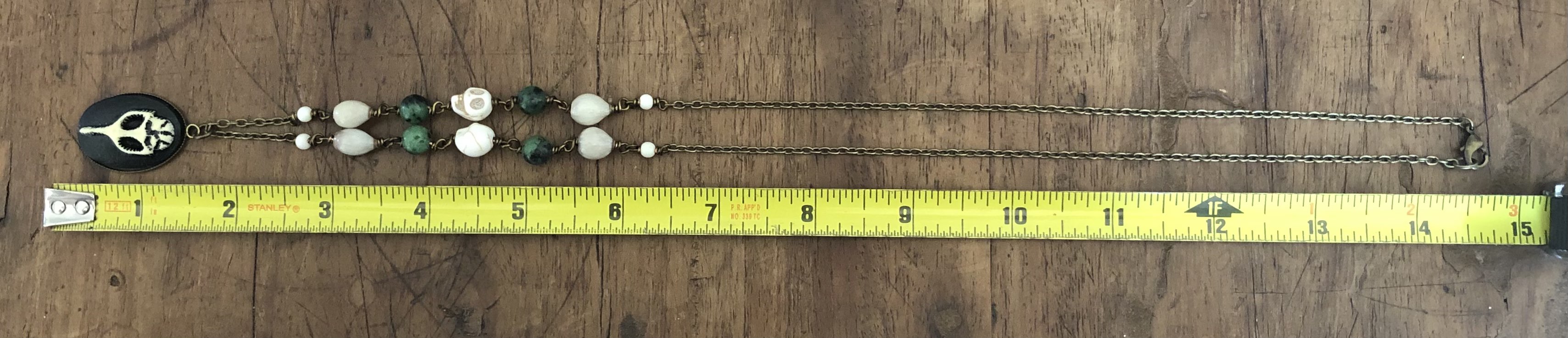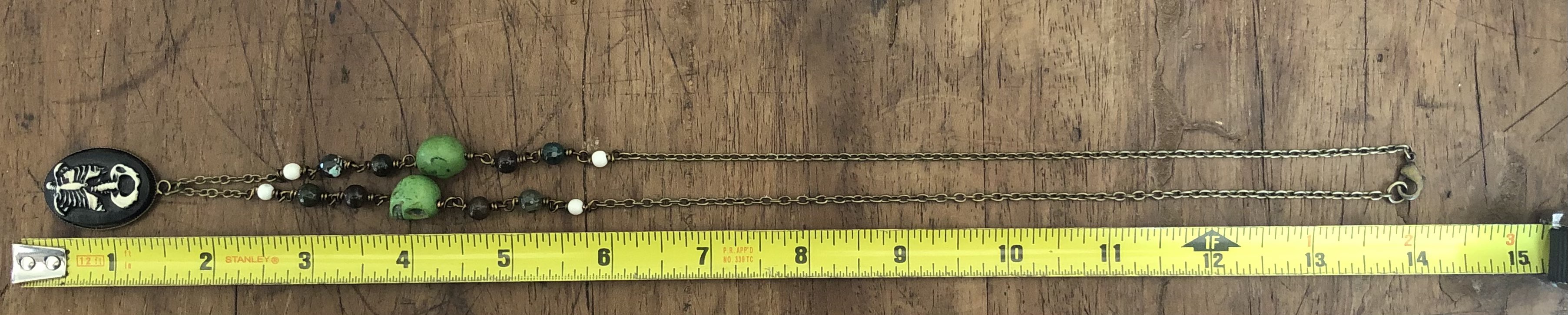 The upside down skeleton body portrait necklace is made of small bone beads, faceted green stone beads, Aventurine beads, and dyed green howlite skull beads.