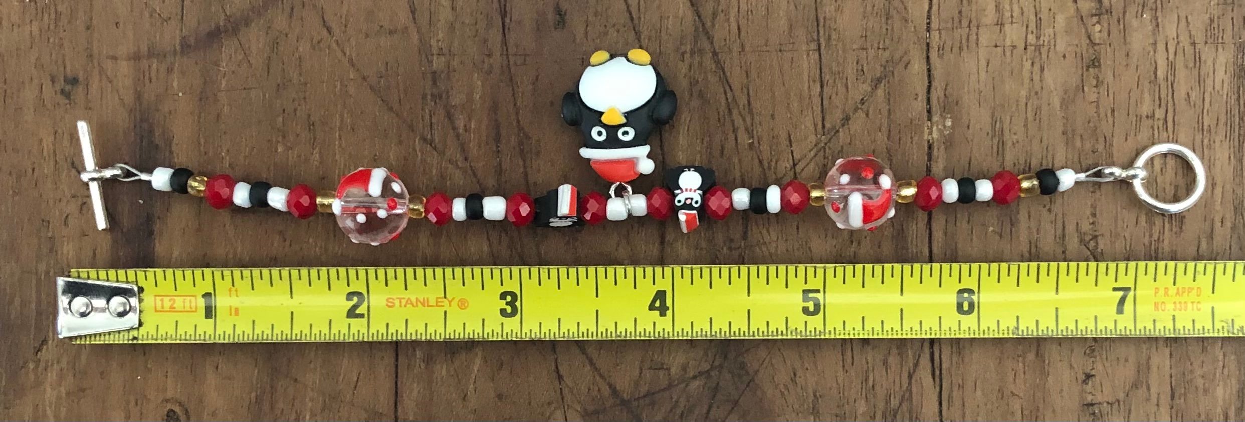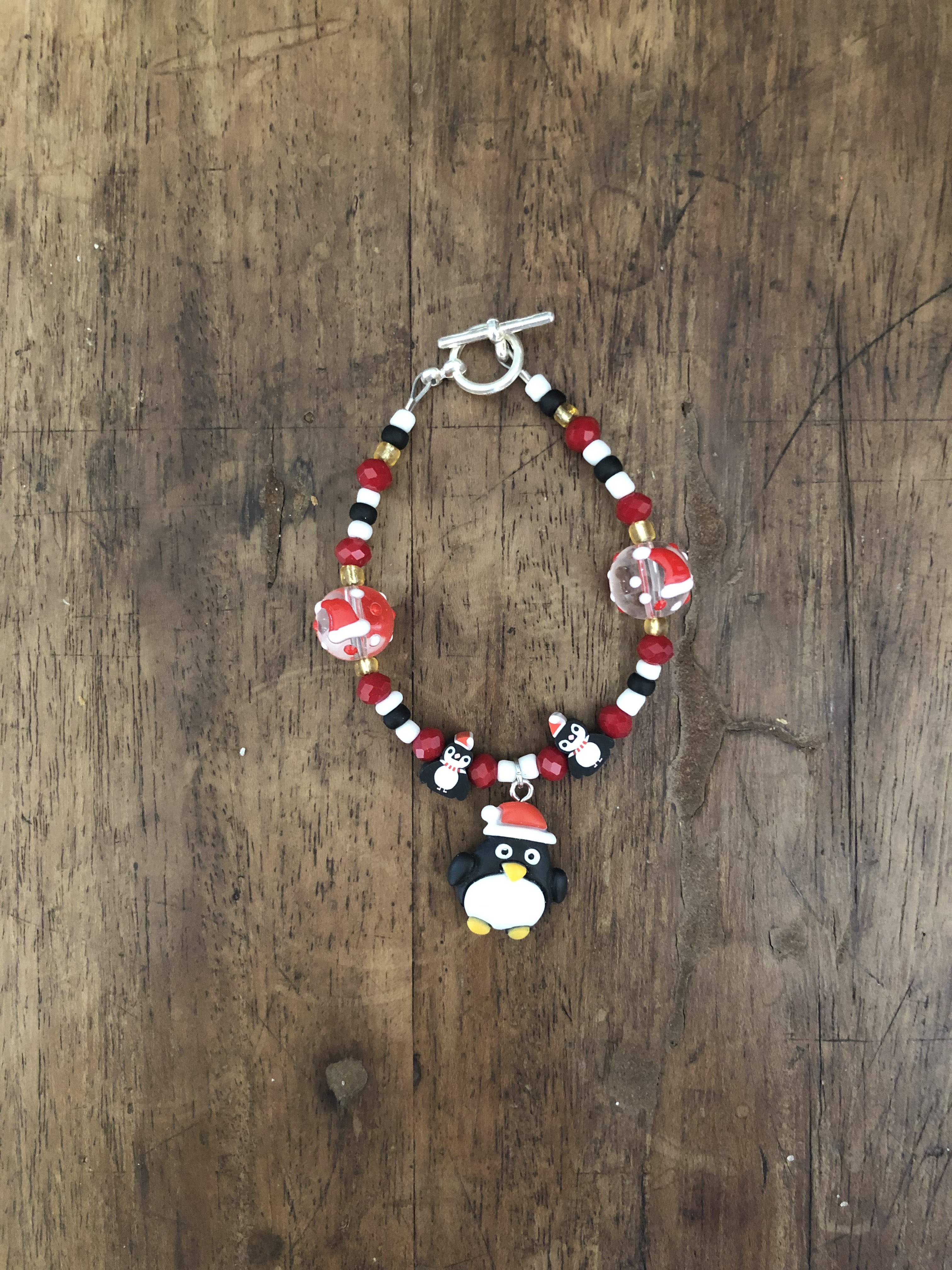 This bracelet has a resin Penguin in a Santa hat charm as the main vocal point. The beads used were glass white seed beads, small red faceted beads, polymer clay penguin beads, black seed beads, and glass round beads depicting a Santa hat.