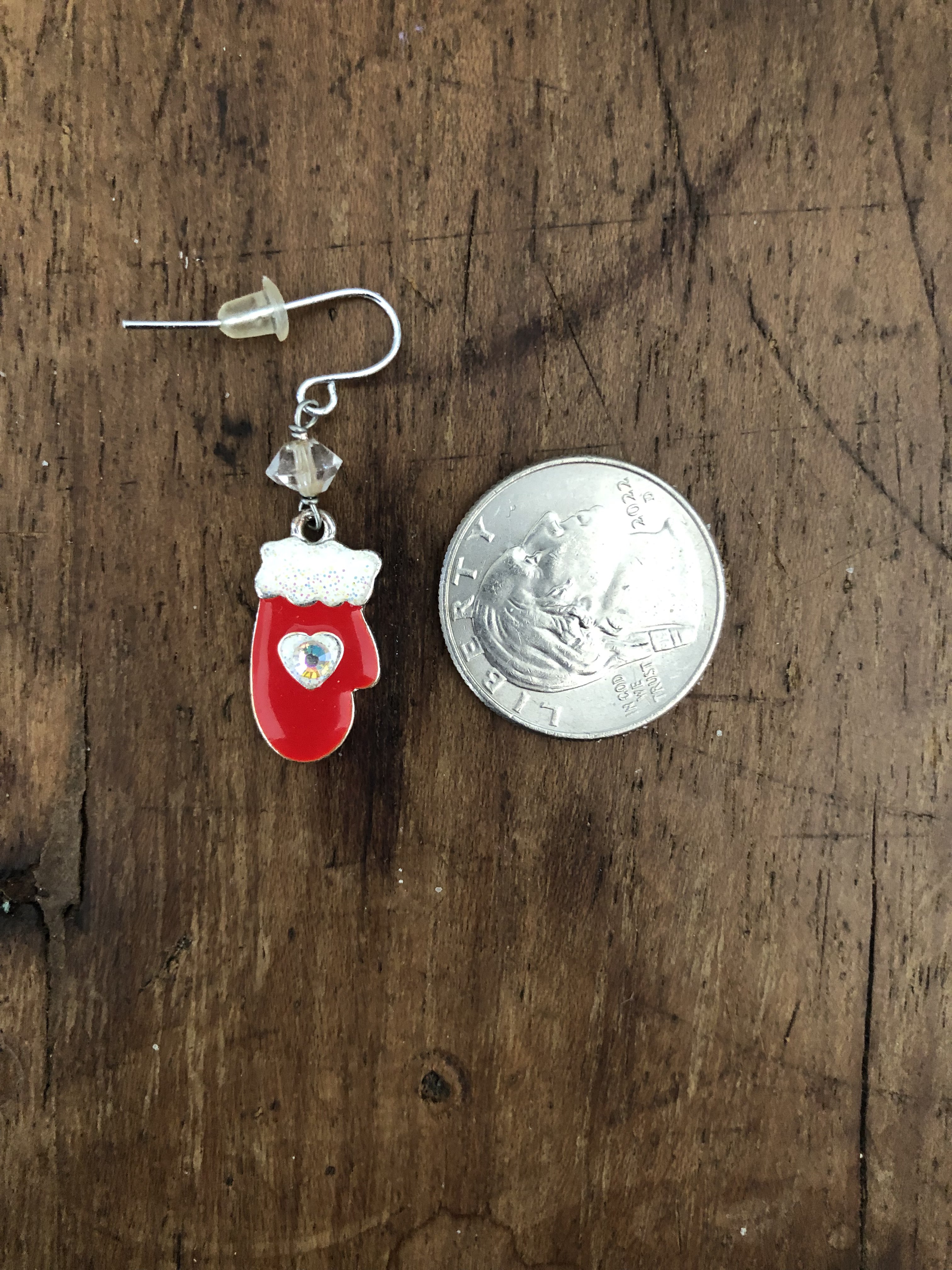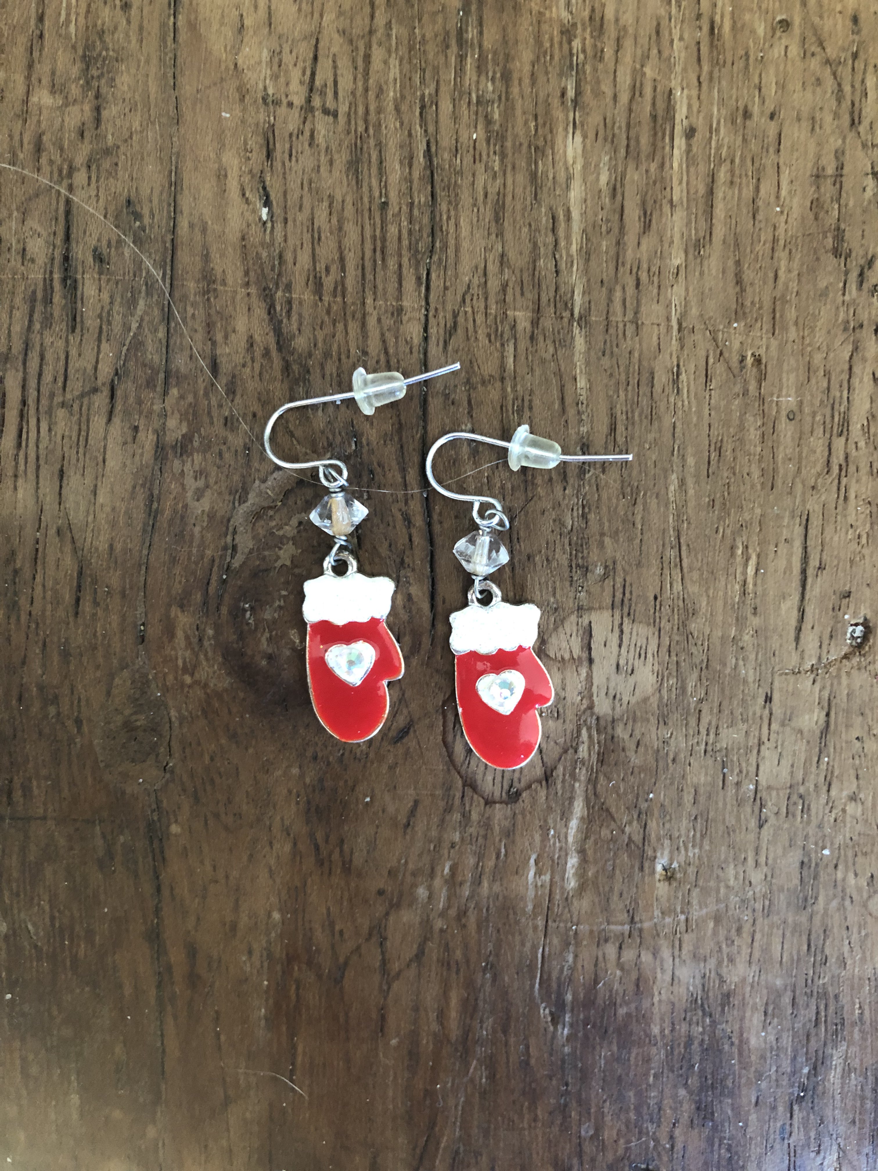 These earrings I originally found in a small jar along with other assorted jewelry. I decided to add a but more of a flare to them by wire wrapping small clear faceted disc shaped glass beads onto the red mitten charms.