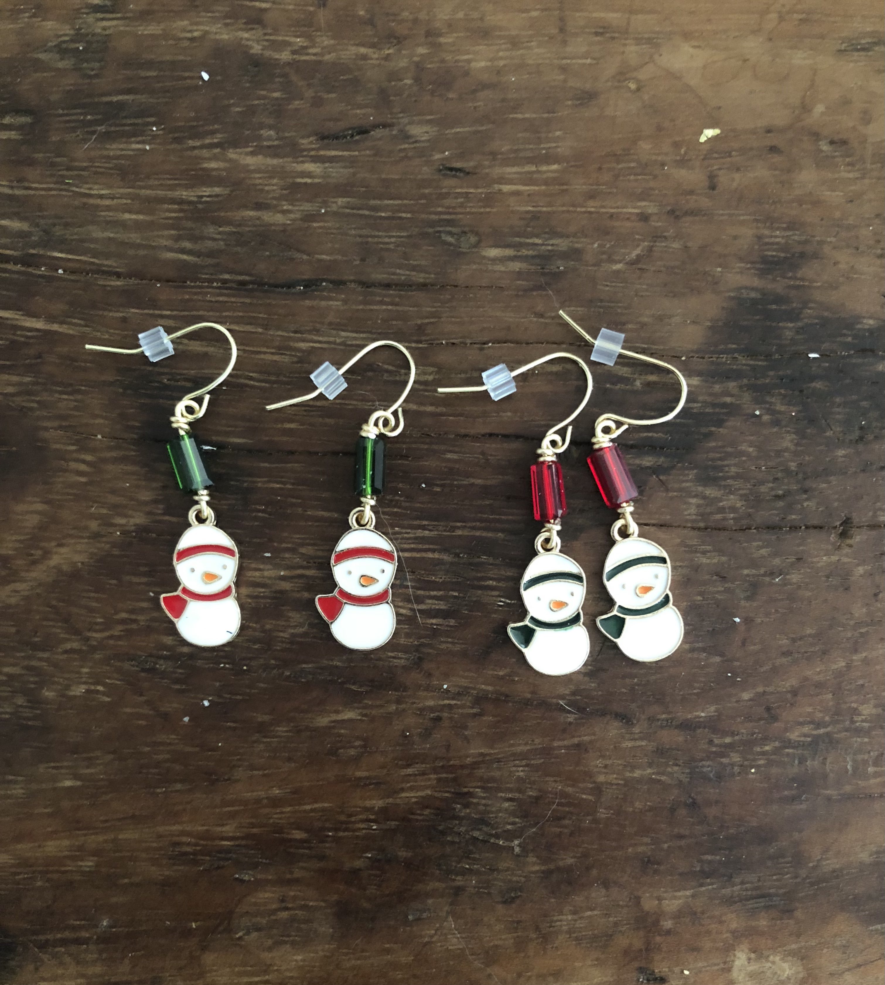 I wanted to make more snowmen earrings so I made these simple styled pieces with rectangle red and green glass beads wire wrapped to metal snowmen charms.